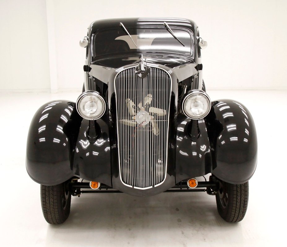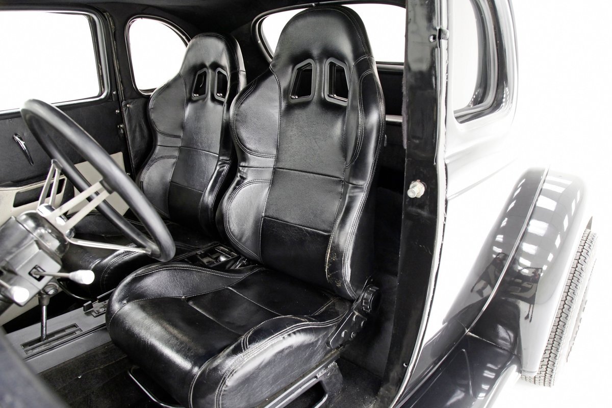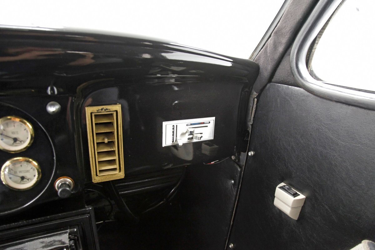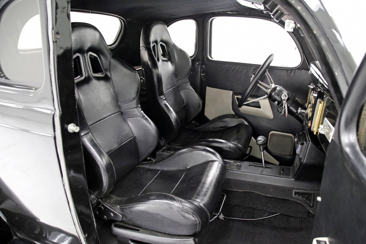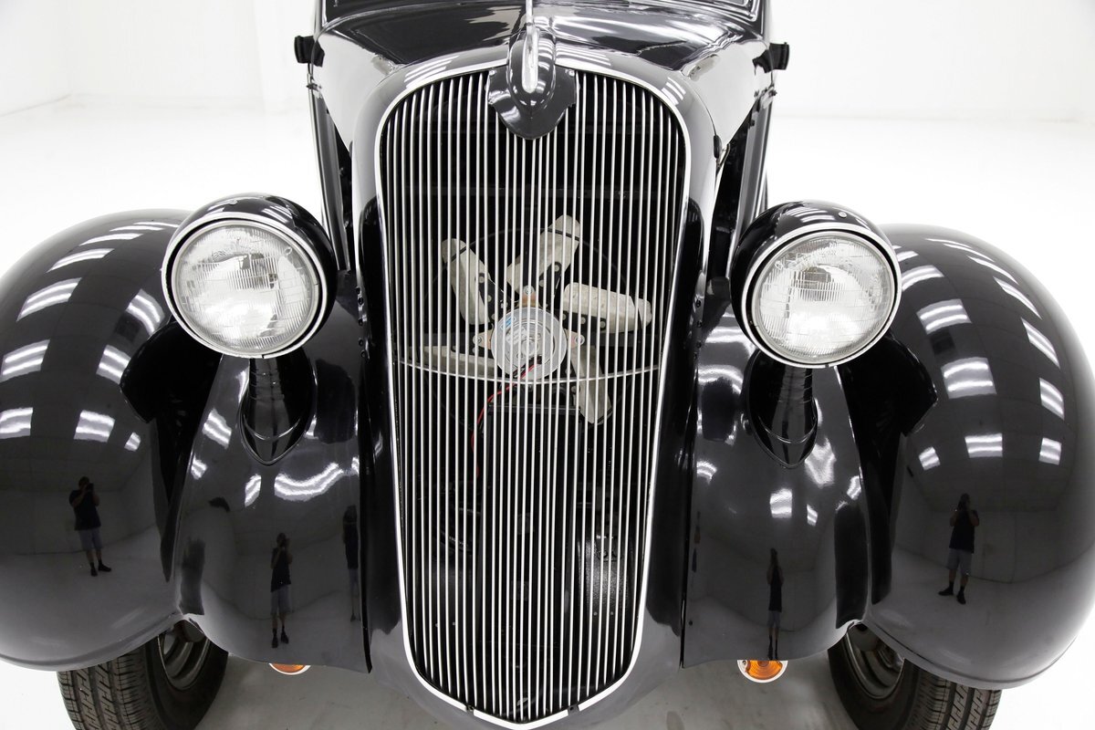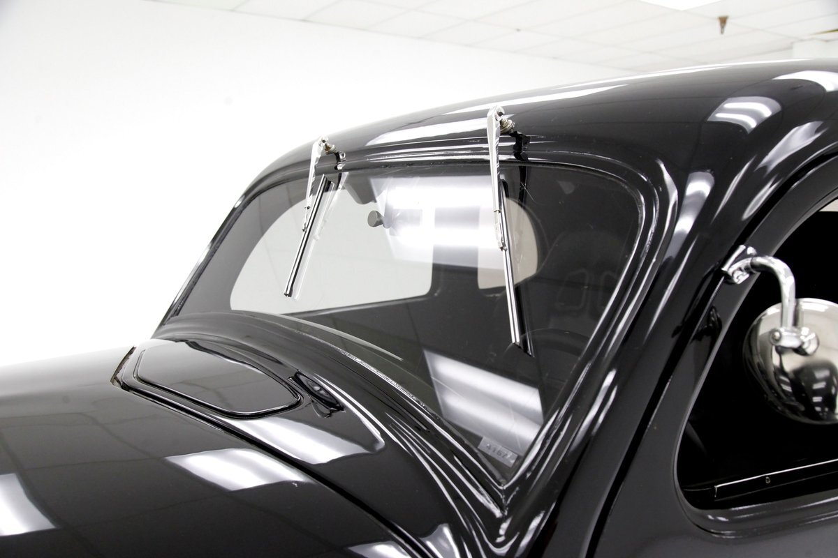 An all steel body that has been uncut and unmodified in any way. The original doors hang straight, the trunk lid opens and closes with all even gaps, and the hood side coverings have been removed. The paint is not fresh; however, it presents nicely, and was most likely sprayed with a 2-stage system. The brilliant black color shows small imperfections in the form of chips, scuffs and scratches when inspected closely, however there are absolutely no major dents or rust worth noting, as well as no areas of major body filler being used. Steel fenders and small running boards adorn each side. Chrome and brite work presents very nicely, with little to no flaws. Overall the exterior could be improved in minute ways, but there really is nothing worth noting. A matching set of big and little 15" Keystone Klassic wheels are attached.