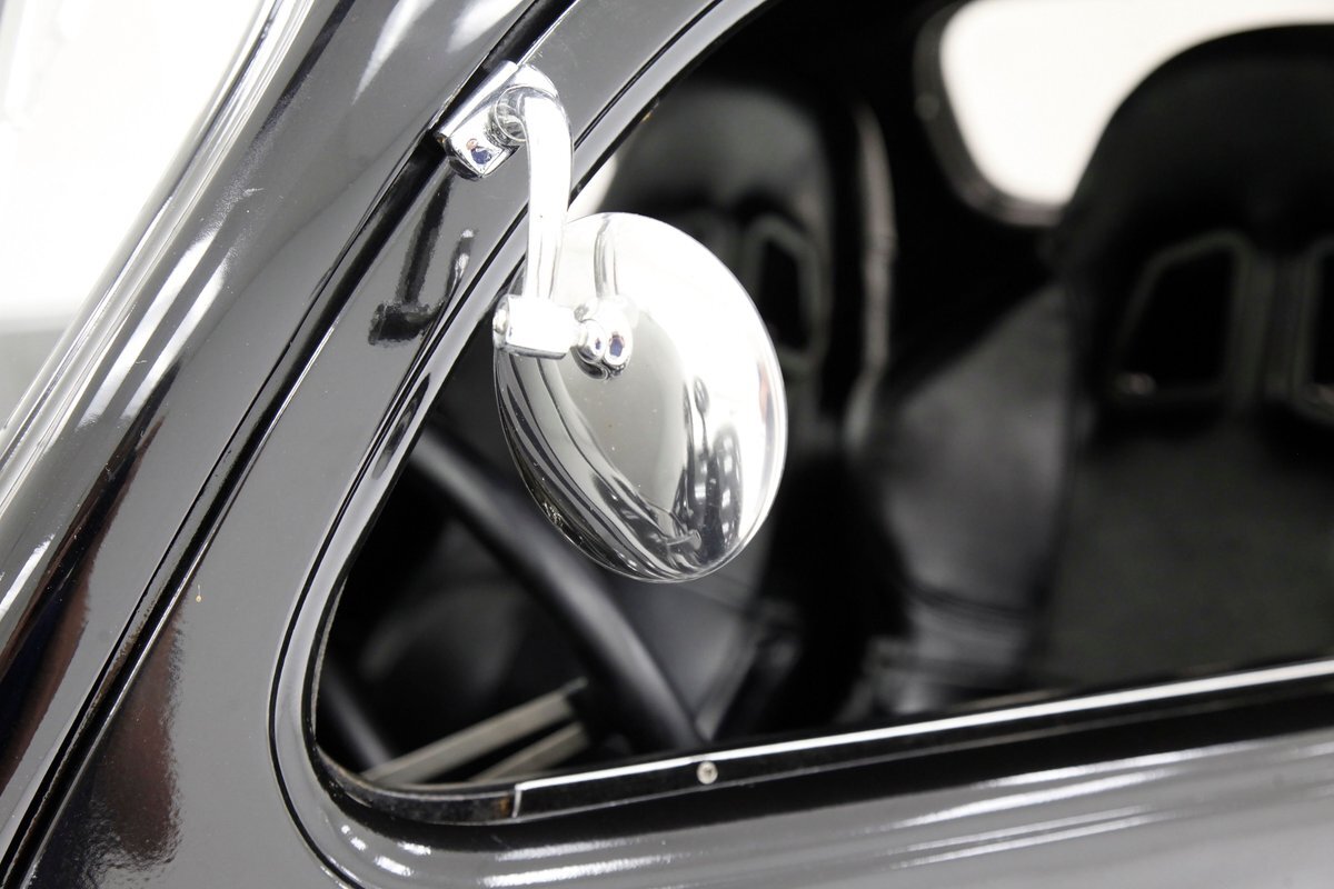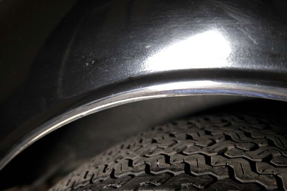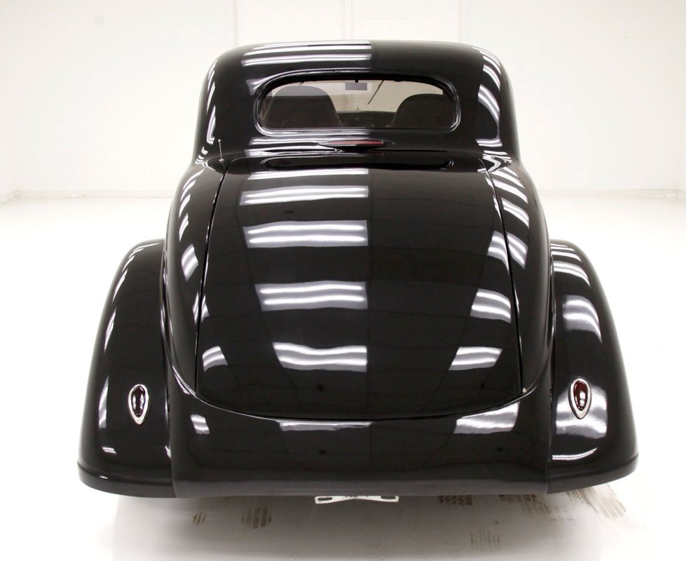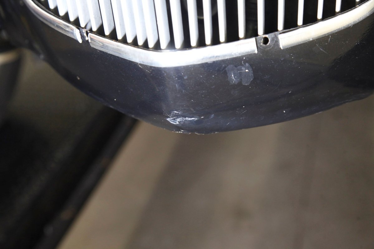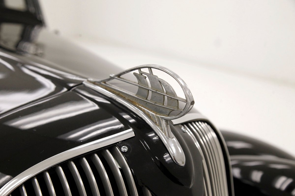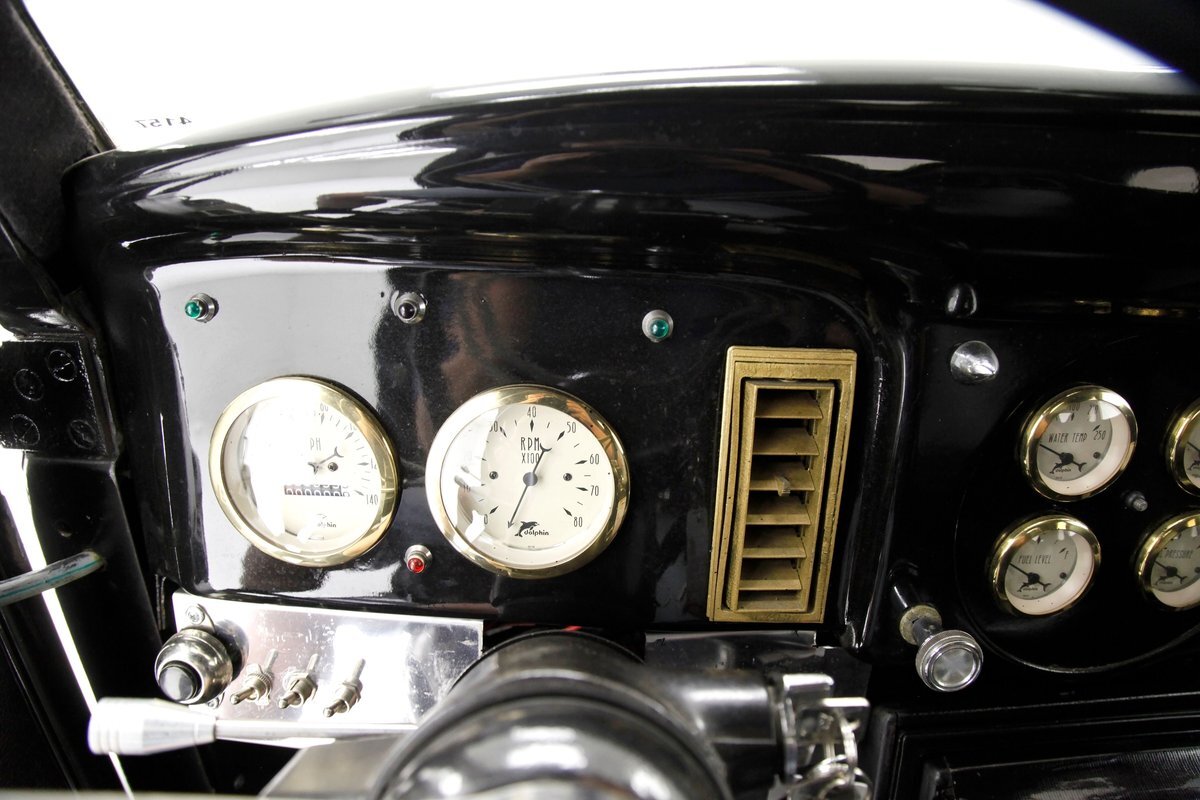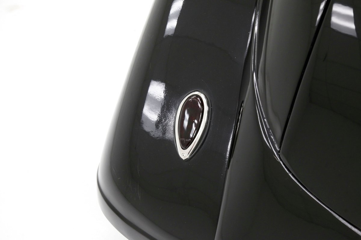 An all steel body that has been uncut and unmodified in any way. The original doors hang straight, the trunk lid opens and closes with all even gaps, and the hood side coverings have been removed. The paint is not fresh; however, it presents nicely, and was most likely sprayed with a 2-stage system. The brilliant black color shows small imperfections in the form of chips, scuffs and scratches when inspected closely, however there are absolutely no major dents or rust worth noting, as well as no areas of major body filler being used. Steel fenders and small running boards adorn each side. Chrome and brite work presents very nicely, with little to no flaws. Overall the exterior could be improved in minute ways, but there really is nothing worth noting. A matching set of big and little 15" Keystone Klassic wheels are attached.