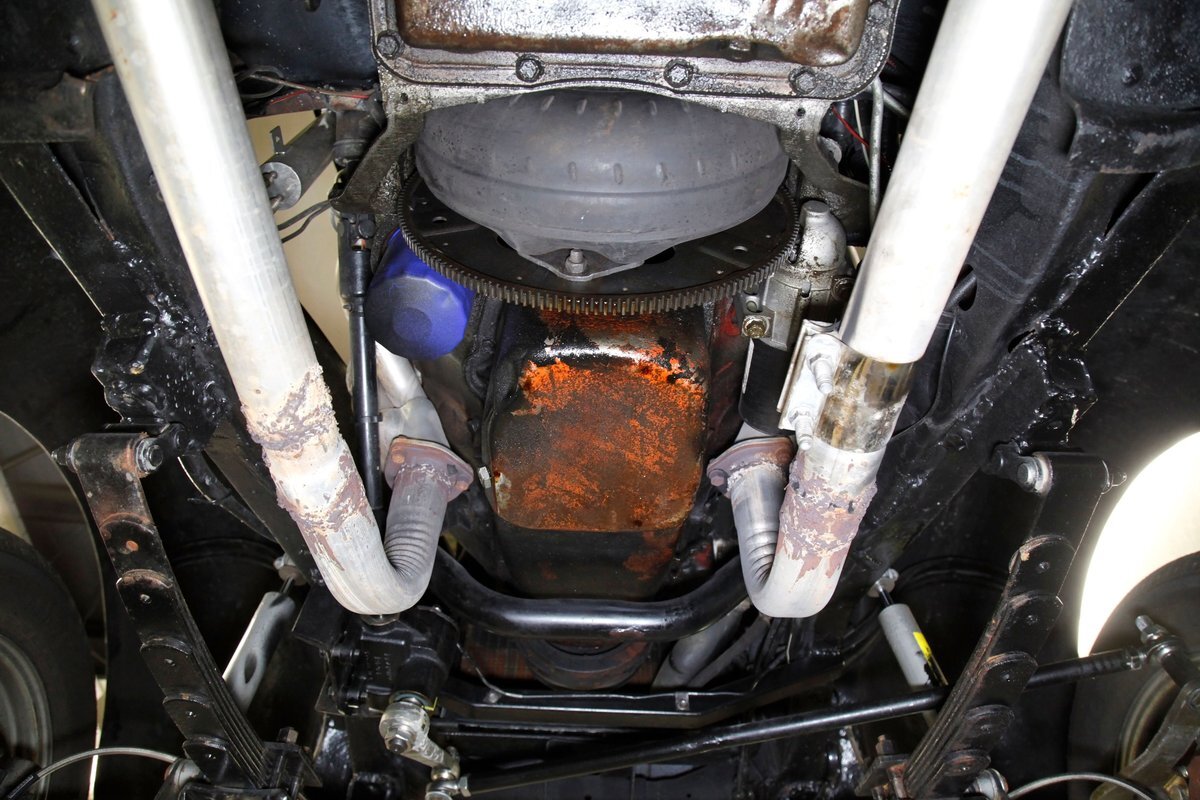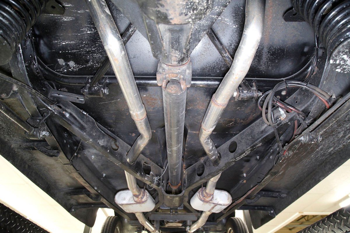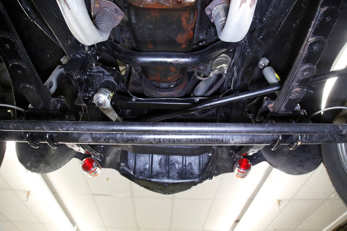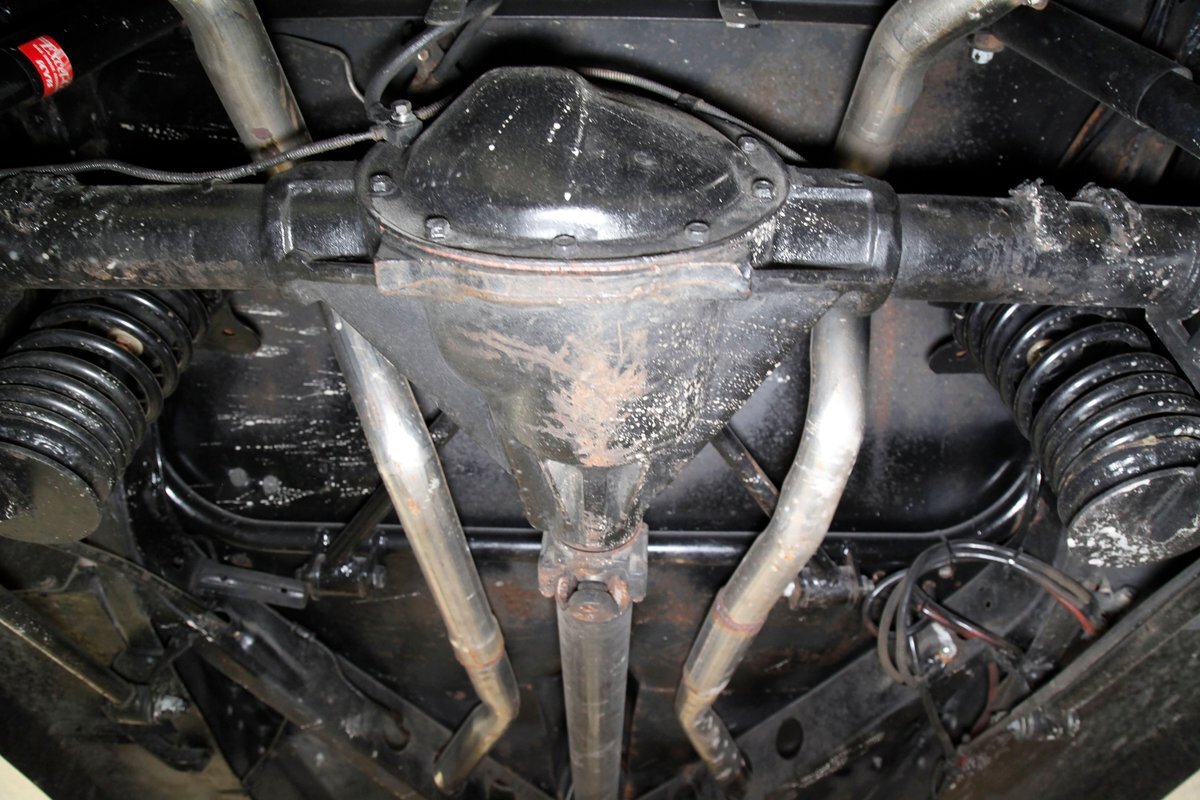This car rides on what appears to be the original frame which is straight, rust free, in overall great condition, and is painted black. The underside in general is very solid with only minor patina and surface rust. A gasser style solid axle and leaf spring front suspension and disc brakes makes up the front. The rear has drum brakes and features a 4-link setup with coil springs. Shorty headers snake their way to a Flowmaster exhaust which ends just behind the rear axle.