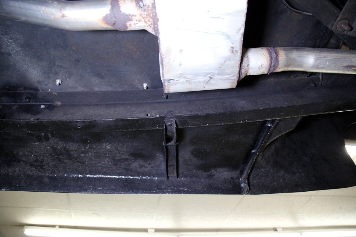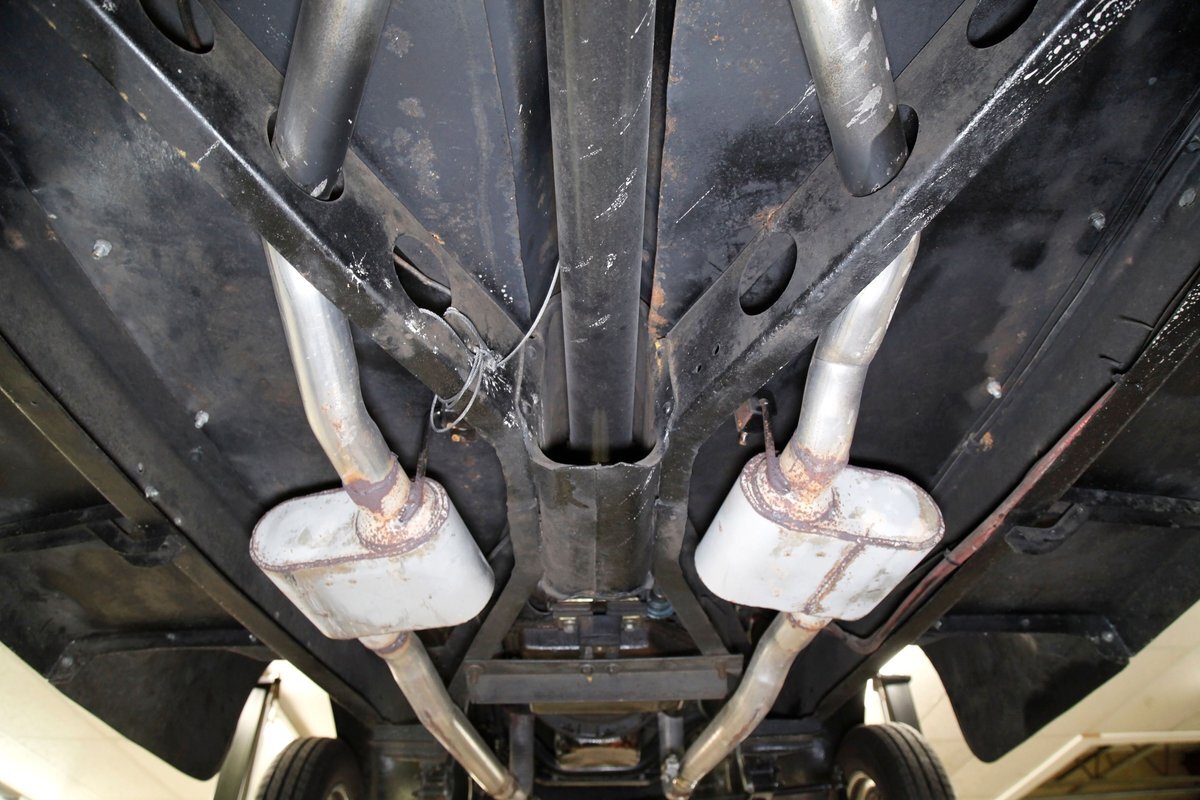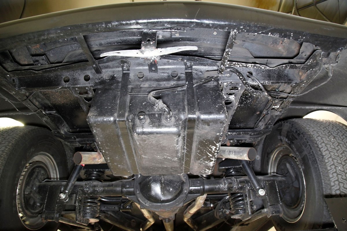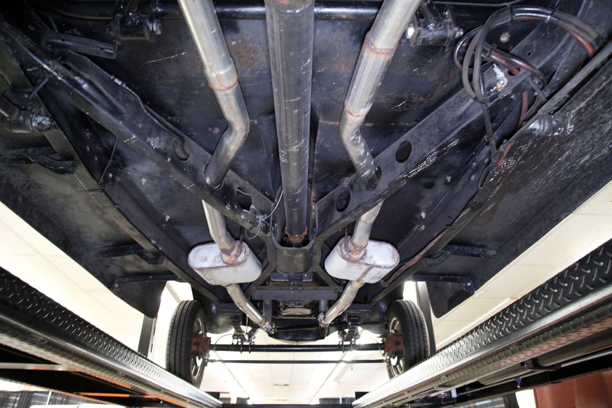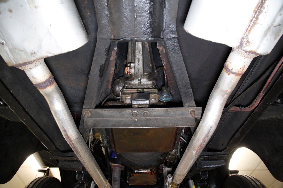 This car rides on what appears to be the original frame which is straight, rust free, in overall great condition, and is painted black. The underside in general is very solid with only minor patina and surface rust. A gasser style solid axle and leaf spring front suspension and disc brakes makes up the front. The rear has drum brakes and features a 4-link setup with coil springs. Shorty headers snake their way to a Flowmaster exhaust which ends just behind the rear axle.