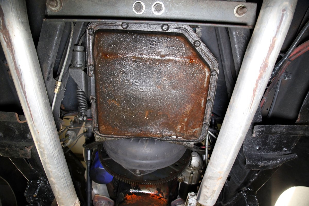 A 350ci Chevrolet V8 which sports billet accessory brackets, polished valve covers, a multitude of chrome, and is topped with a 4bbl Holley carburetor which has a small chrome lidded pleated air filter assembly rests under the steel hood. With the engine block painted black, and everything else chromed, aluminum, or billet there is a good reason as to why this hot rod has no hood sides. It's the "look". Attached is a TH350 3-speed automatic transmission of unknown vintage which sends power to a 10 bolt rear axle with unknown gearing.