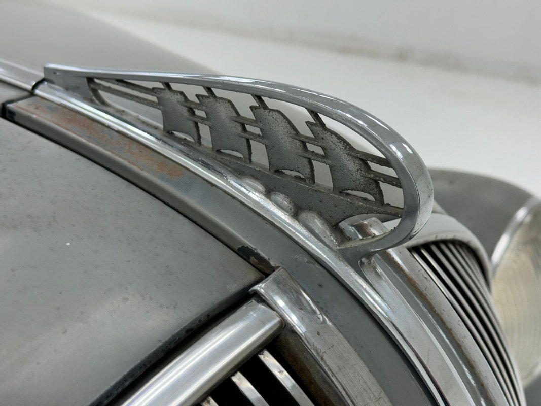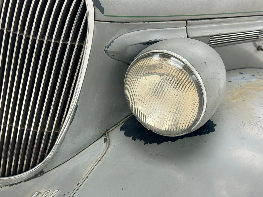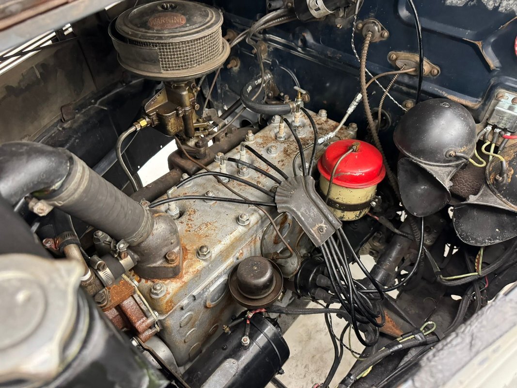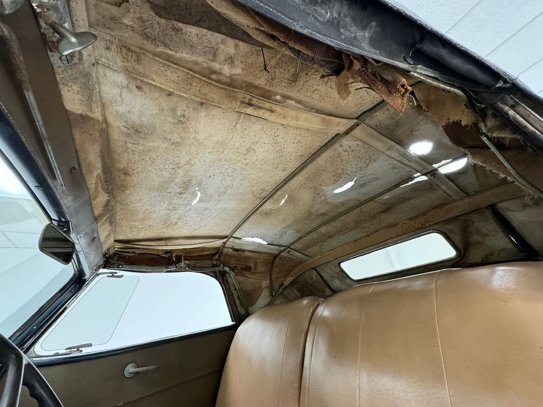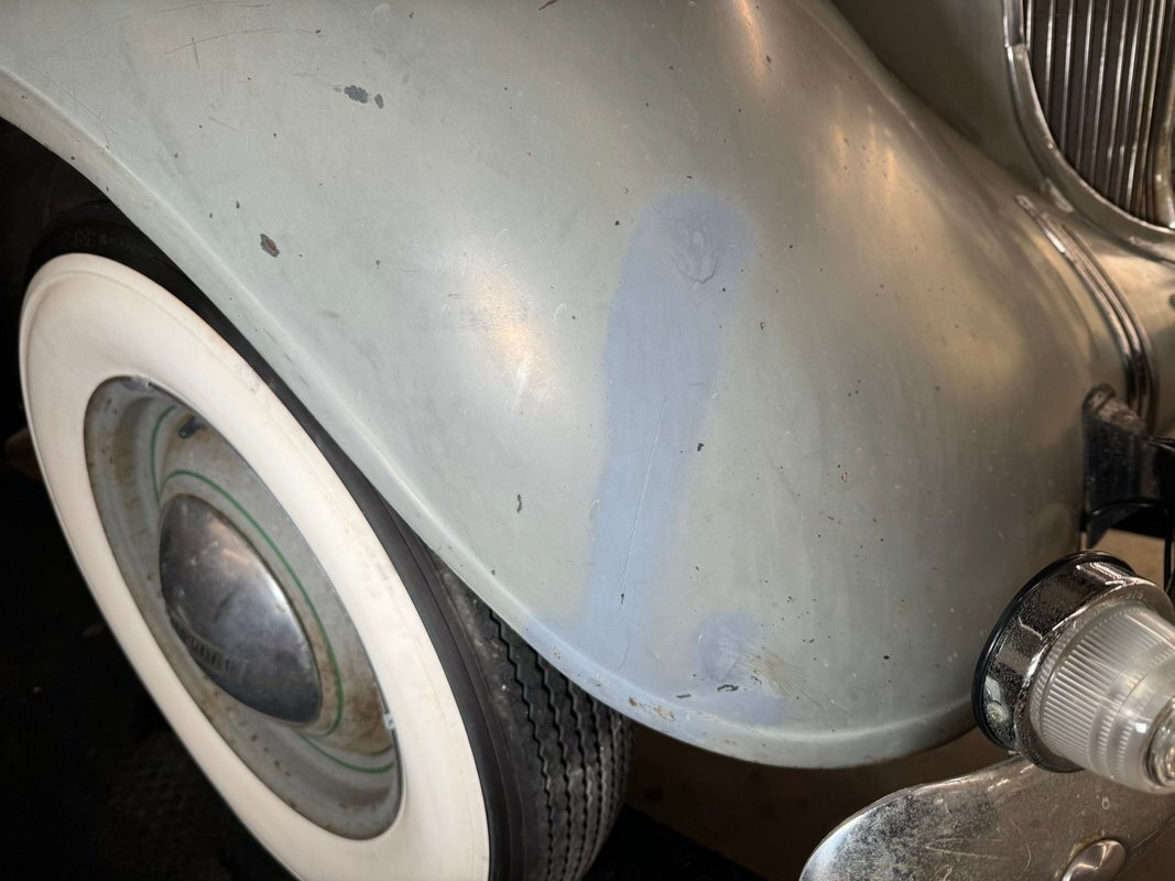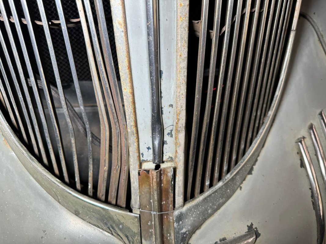 Our consignor states this car was originally blue but was painted Battleship Gray while at the Philadelphia Navy Yard during the war. We'd love to learn about that story but just that info alone is worthy of putting on your car show placard! That makes this paint almost 90 years old and let's make no mistake...it looks it. But patina is in, ladies and gentlemen! This car is cool just as it sits...full of scratches and scrapes, missing paint, surface rust and real rust, bad body work, mismatched patches. Yeah, it's glorious in its imperfection! The epic 30's style shines through however...bulbous fenders, external light assemblies, sloping rear, (hiding a rumble seat), and that tall, vertical grille coming at you like a train. The cloth top is rough...ripped and faded, and the brightwork is no longer bright. But oh, that hood emblem! The Mayflower ship landing on Plymouth Rock....leaning forward with hope and determination. Drive carefree as is or start making a plan for restoration.