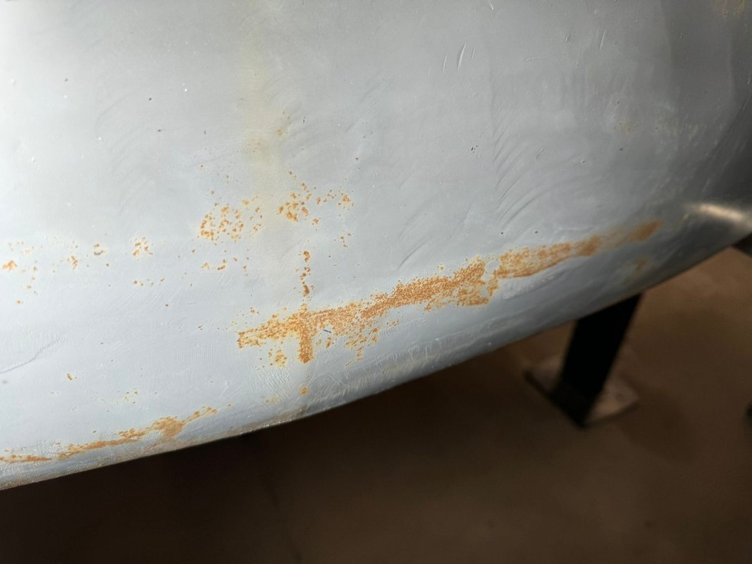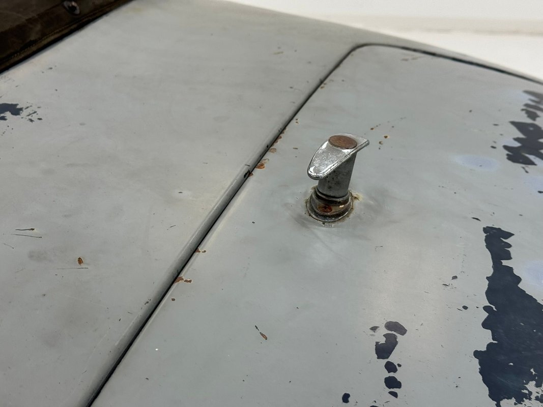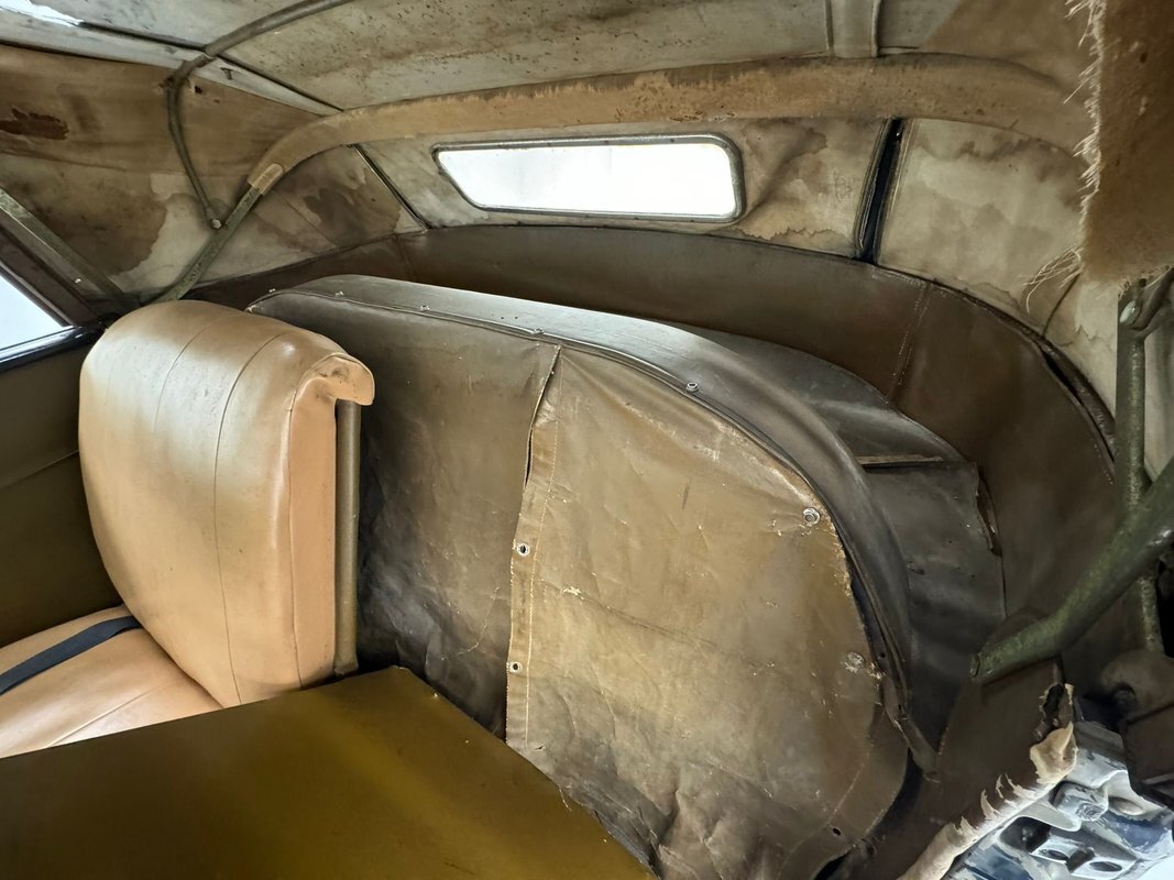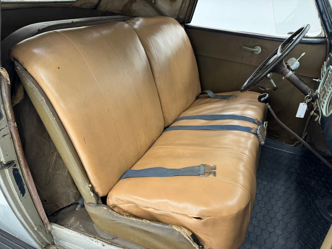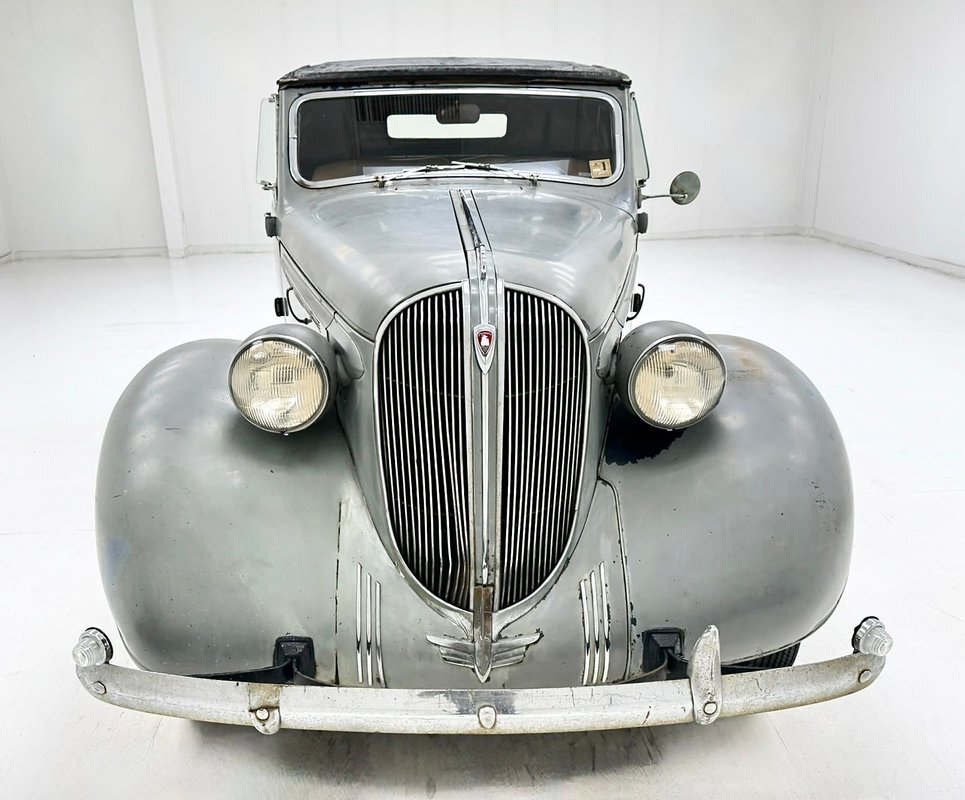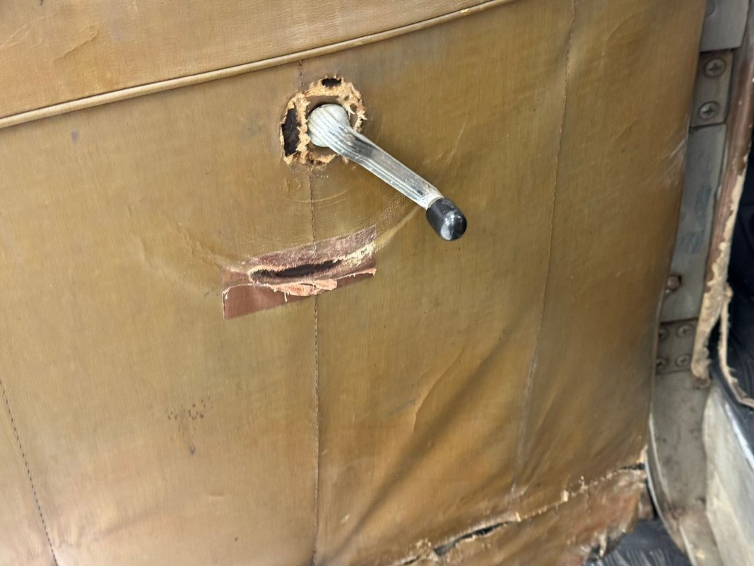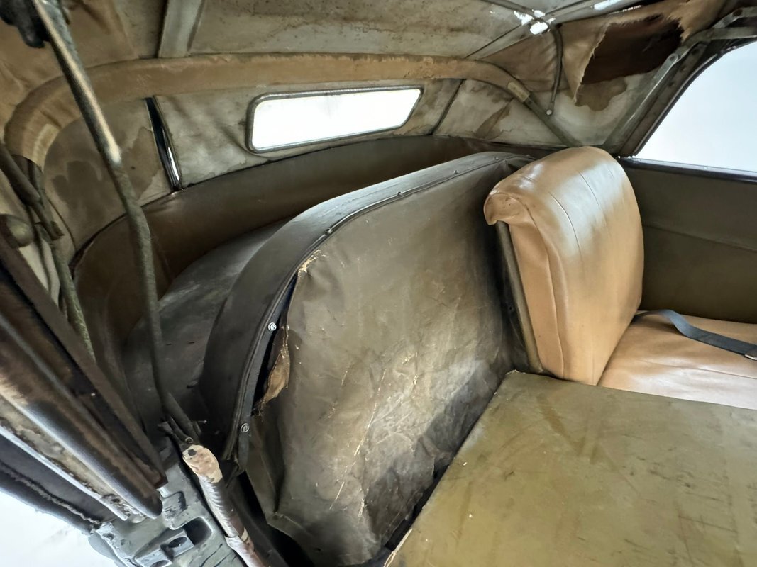 Our consignor states this car was originally blue but was painted Battleship Gray while at the Philadelphia Navy Yard during the war. We'd love to learn about that story but just that info alone is worthy of putting on your car show placard! That makes this paint almost 90 years old and let's make no mistake...it looks it. But patina is in, ladies and gentlemen! This car is cool just as it sits...full of scratches and scrapes, missing paint, surface rust and real rust, bad body work, mismatched patches. Yeah, it's glorious in its imperfection! The epic 30's style shines through however...bulbous fenders, external light assemblies, sloping rear, (hiding a rumble seat), and that tall, vertical grille coming at you like a train. The cloth top is rough...ripped and faded, and the brightwork is no longer bright. But oh, that hood emblem! The Mayflower ship landing on Plymouth Rock....leaning forward with hope and determination. Drive carefree as is or start making a plan for restoration.