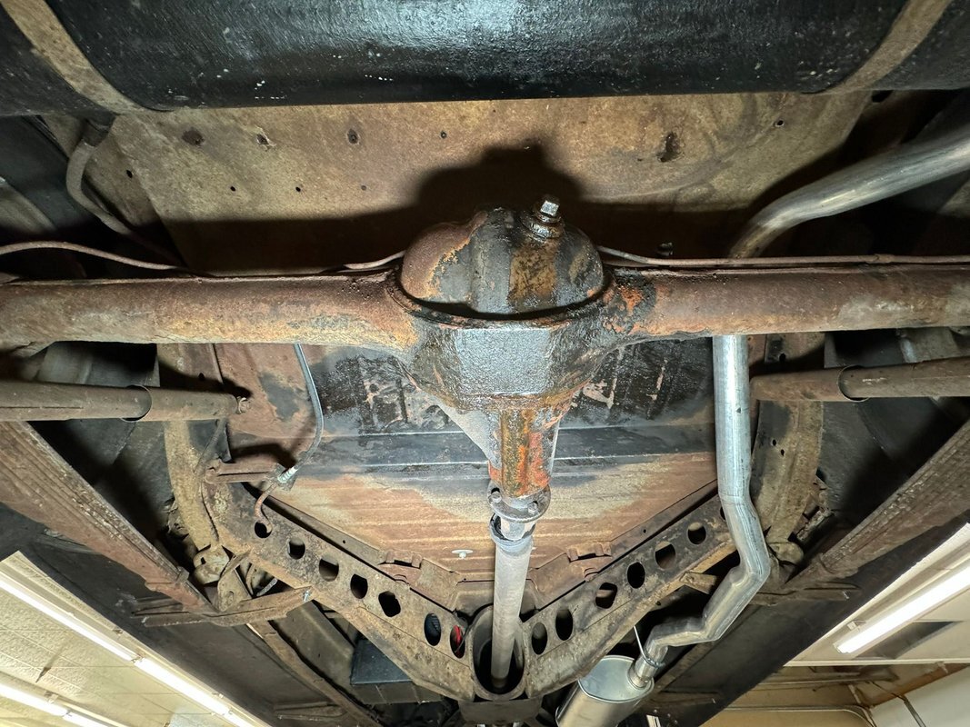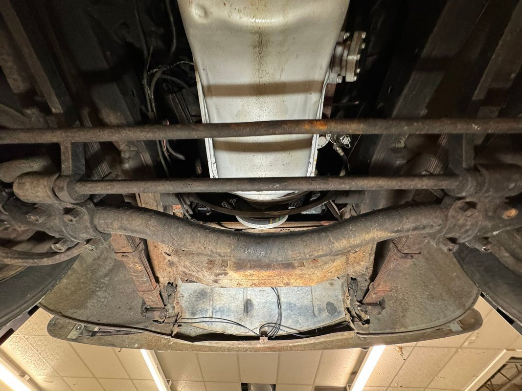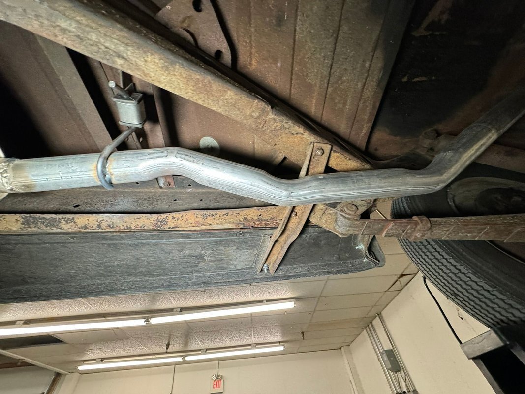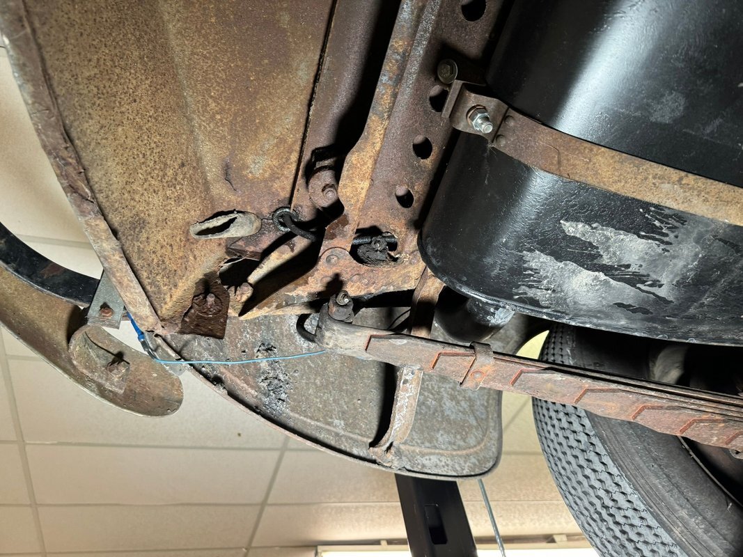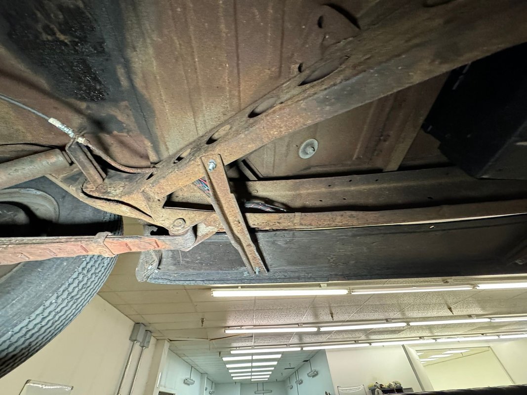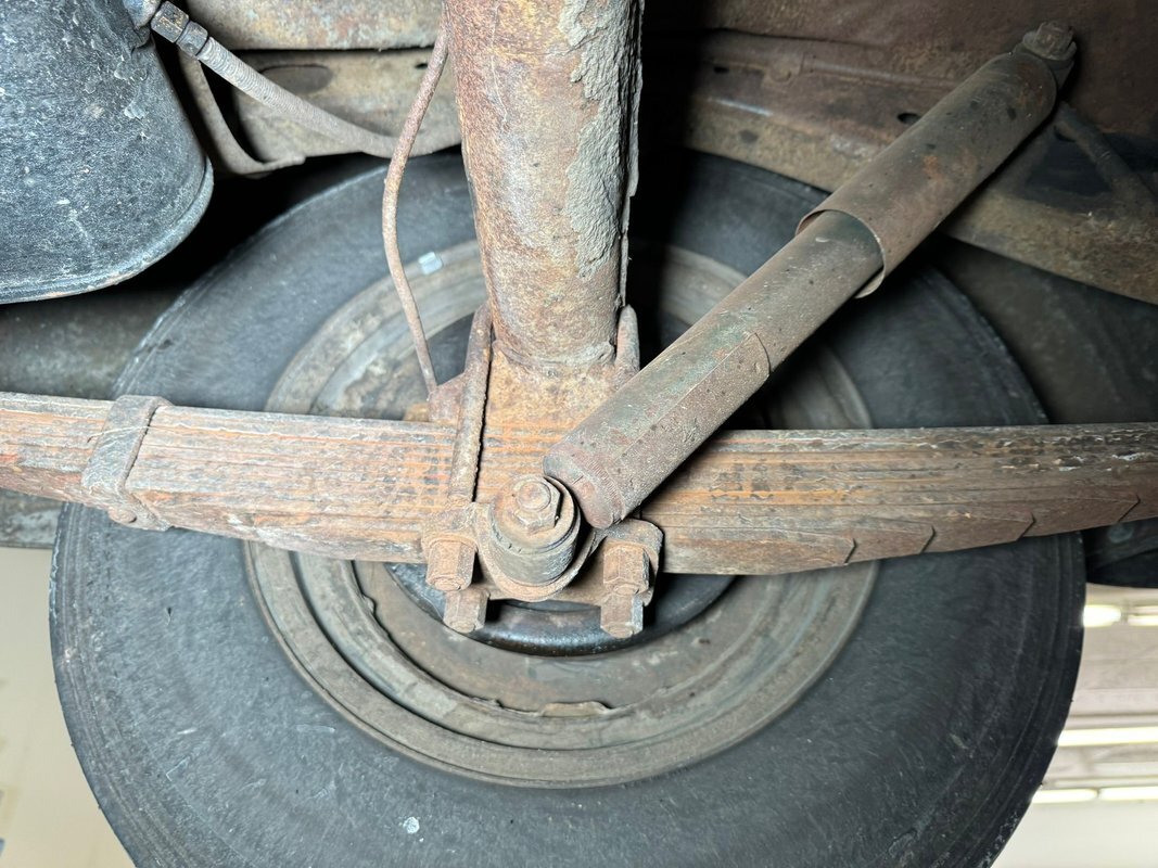 Interestingly, the back half from the middle of the X-brace back, is basically covered with surface rust. But center forward, still present but much less so. Regardless, the patina theme continues underneath where we see independent, coil spring front suspension and a leaf spring suspended rear. The single exhaust and muffler appear to be in great shape. Drum brakes all around are present and accounted for.