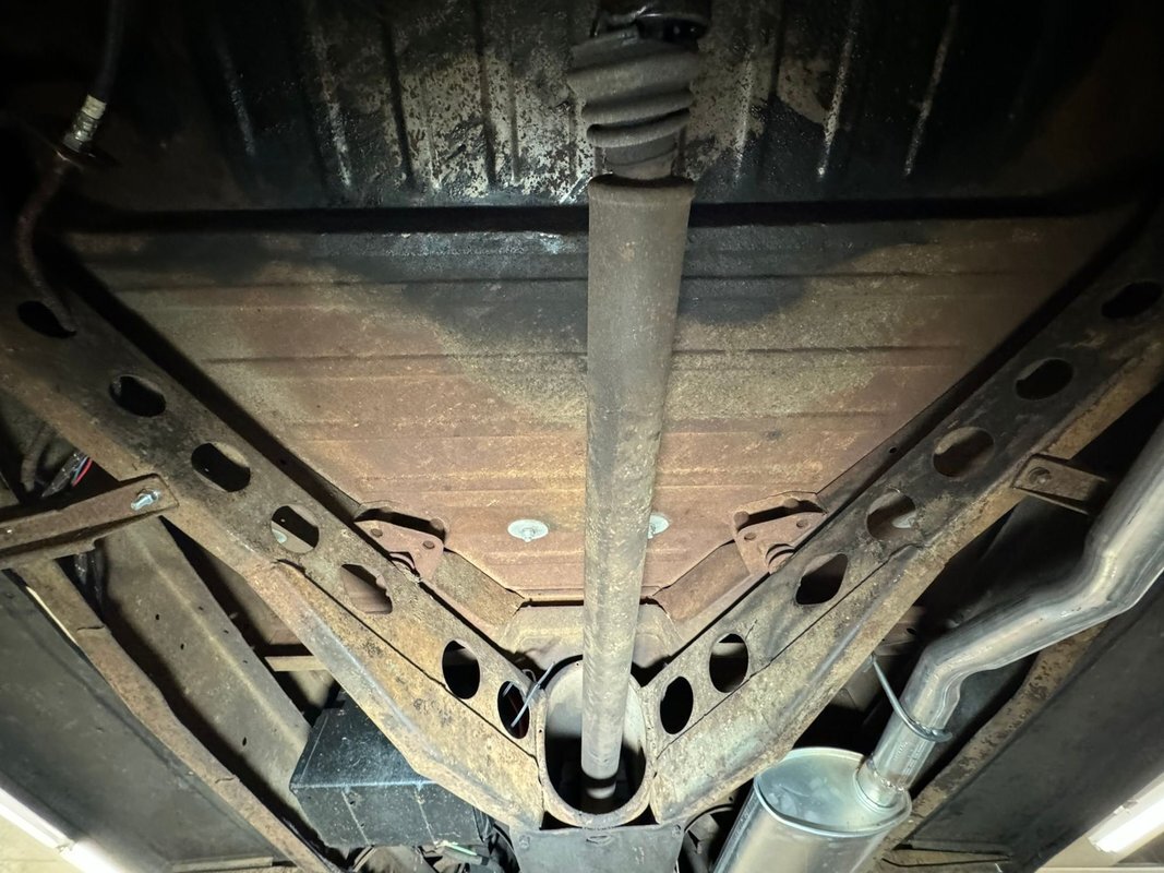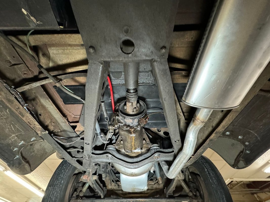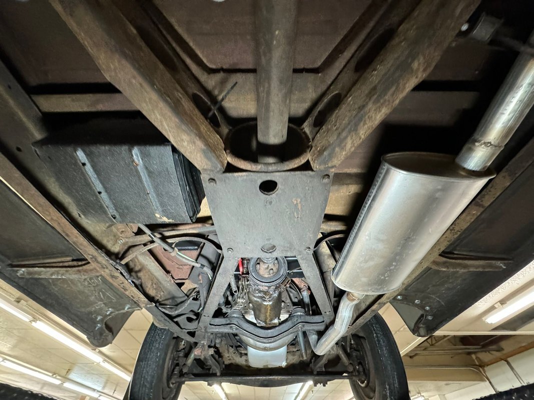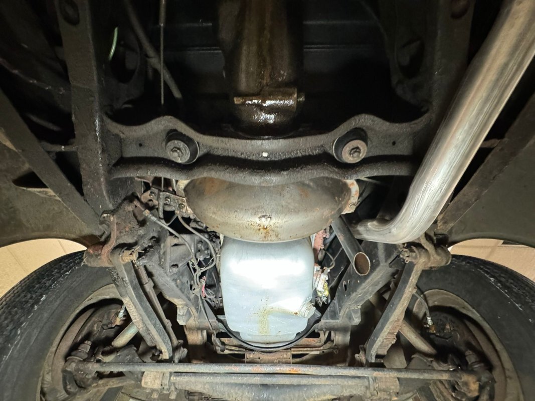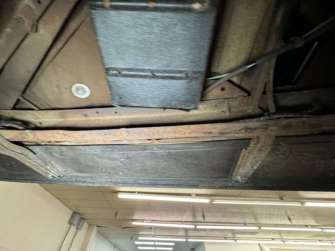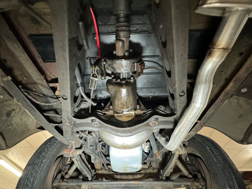 Interestingly, the back half from the middle of the X-brace back, is basically covered with surface rust. But center forward, still present but much less so. Regardless, the patina theme continues underneath where we see independent, coil spring front suspension and a leaf spring suspended rear. The single exhaust and muffler appear to be in great shape. Drum brakes all around are present and accounted for.