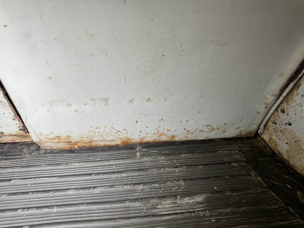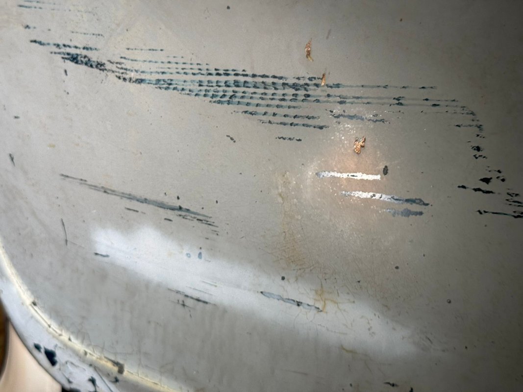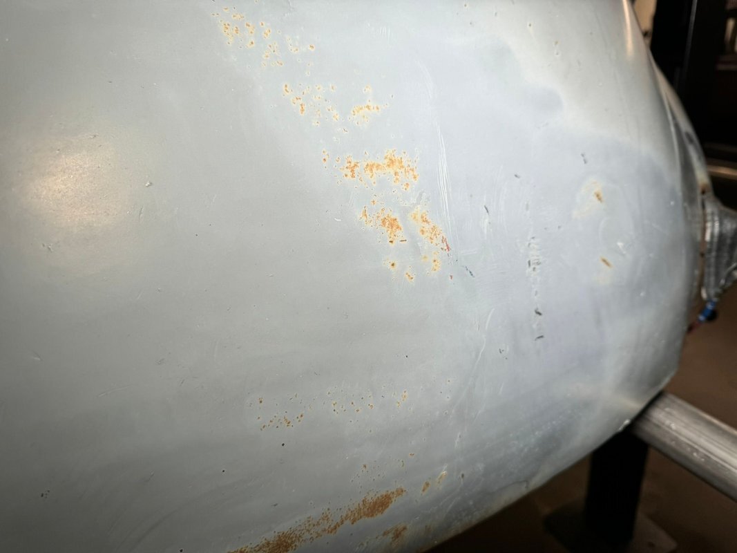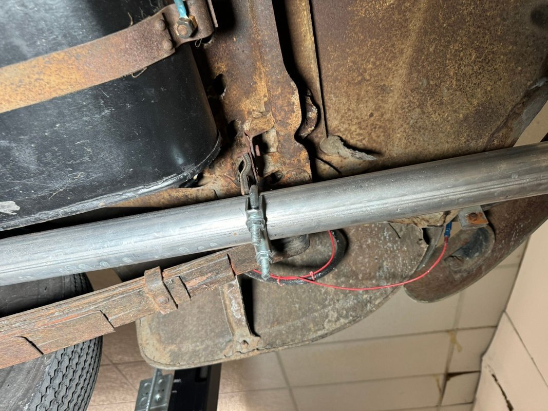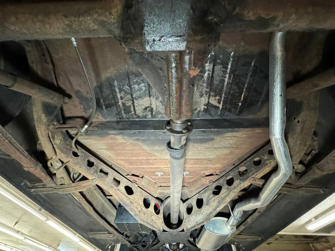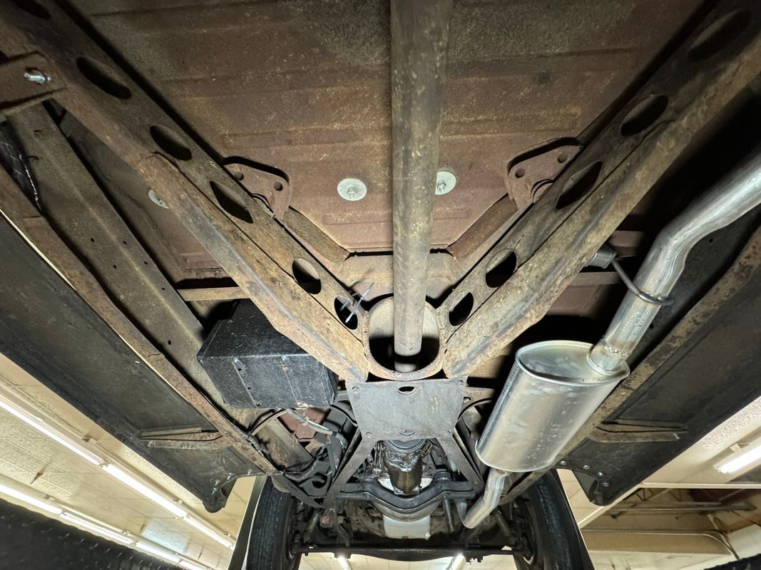 Interestingly, the back half from the middle of the X-brace back, is basically covered with surface rust. But center forward, still present but much less so. Regardless, the patina theme continues underneath where we see independent, coil spring front suspension and a leaf spring suspended rear. The single exhaust and muffler appear to be in great shape. Drum brakes all around are present and accounted for.
