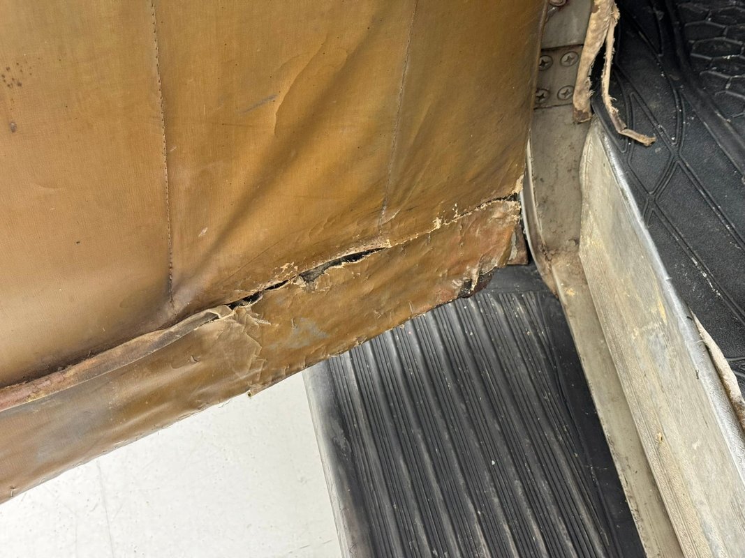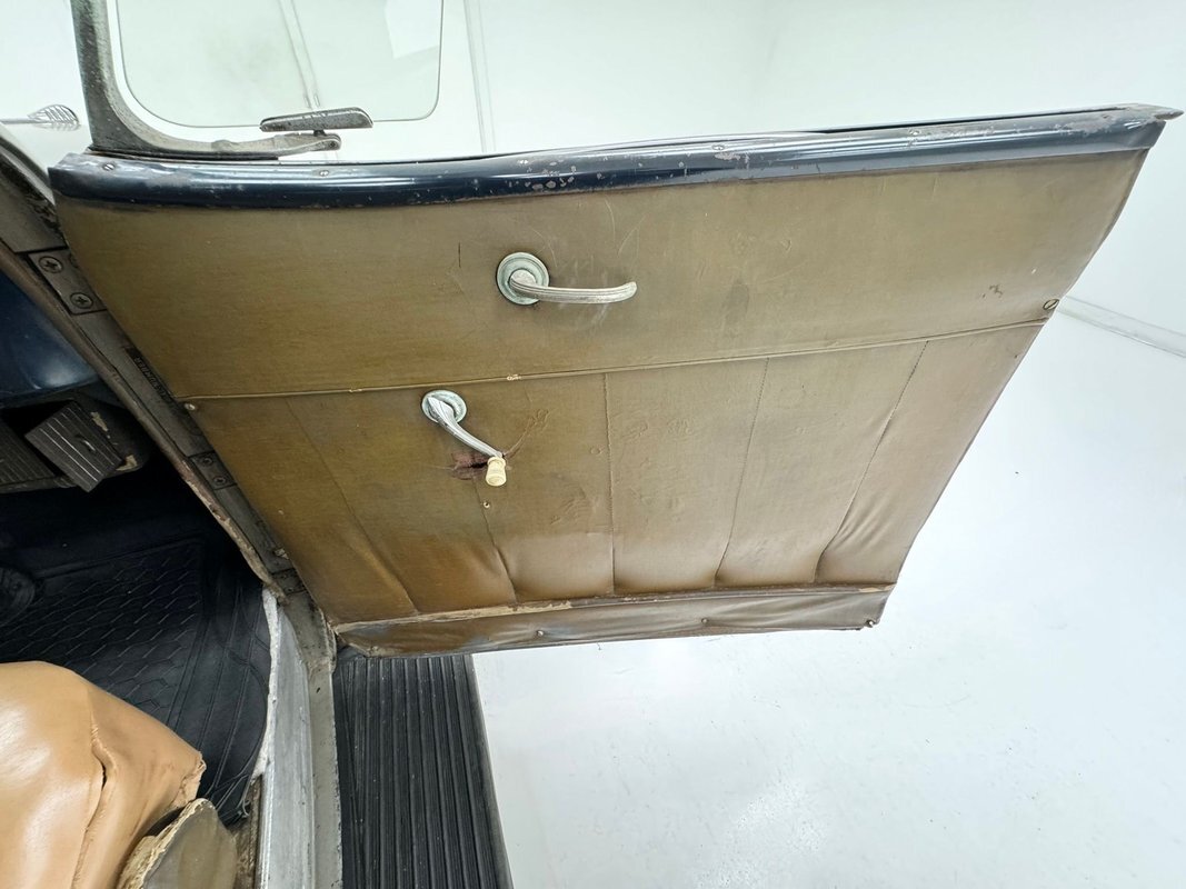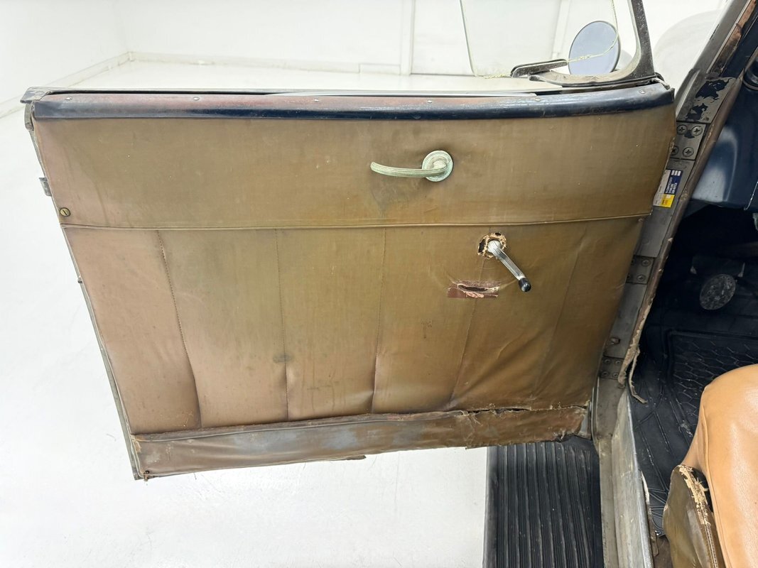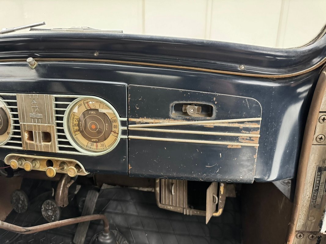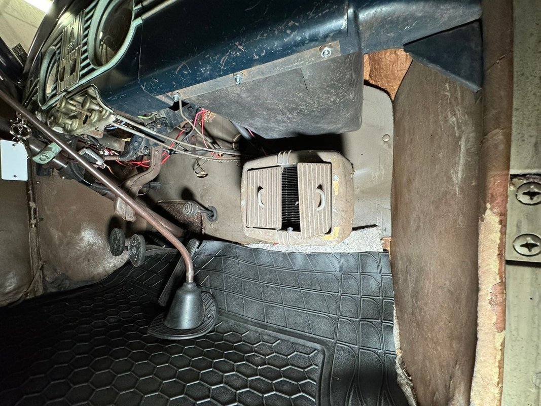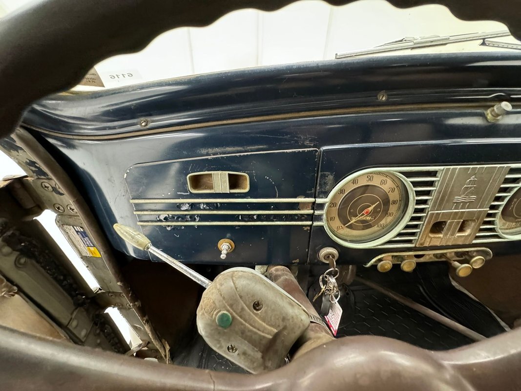Things are a little better inside. Though the door cards are ripped and worn, the camel split bench seat in vinyl is in decent shape...certainly better than factory mohair would have been by now. The rumble seat of the same color and material is also in good shape. The steering wheel and dash with their art deco design is showing age and the dark blue paint hints at the original color of the car. A fitted rubber mat covers the floor which is where the tall shifter is also found. A barn door firewall heater is under the dash adding more deco flair to the inside.