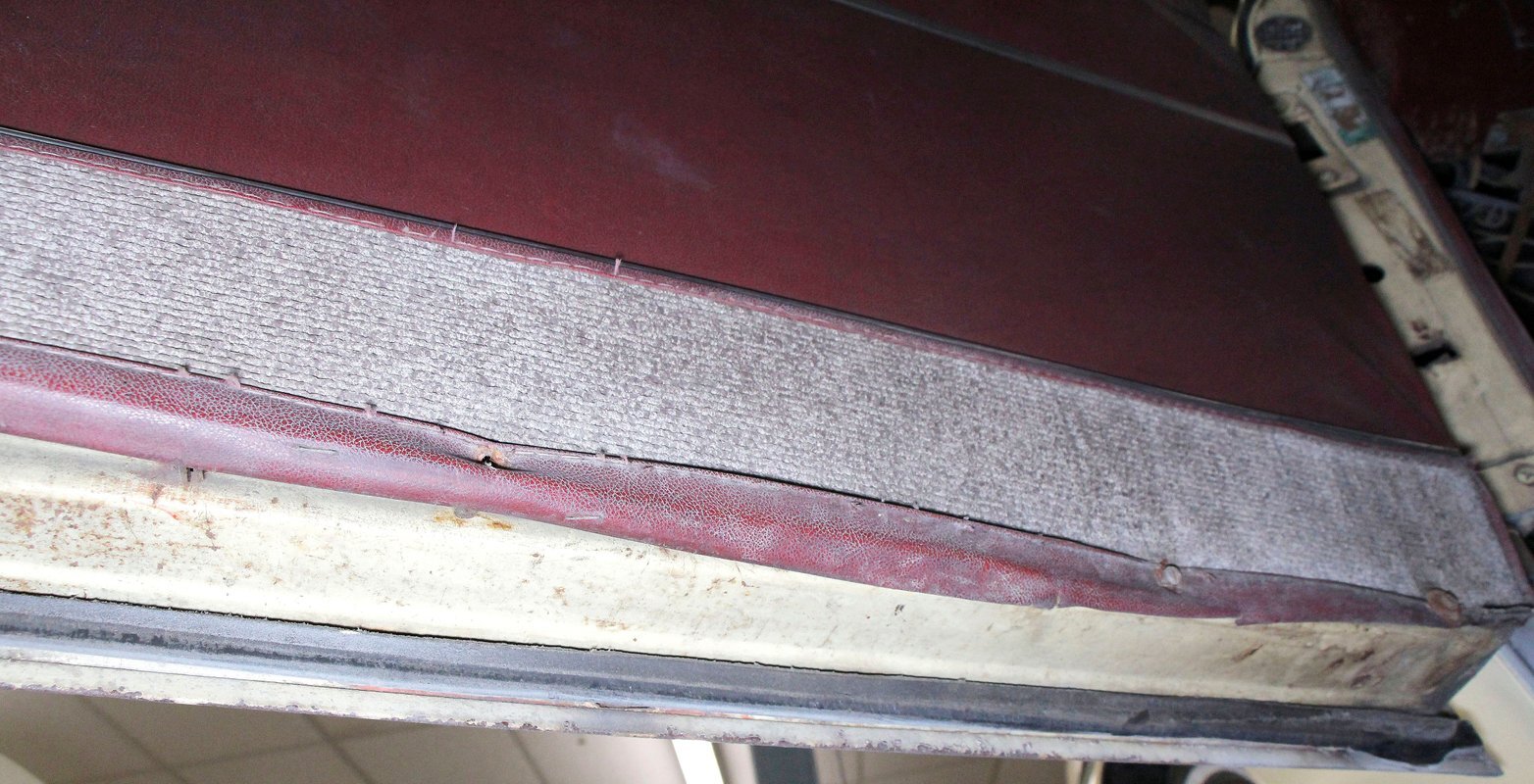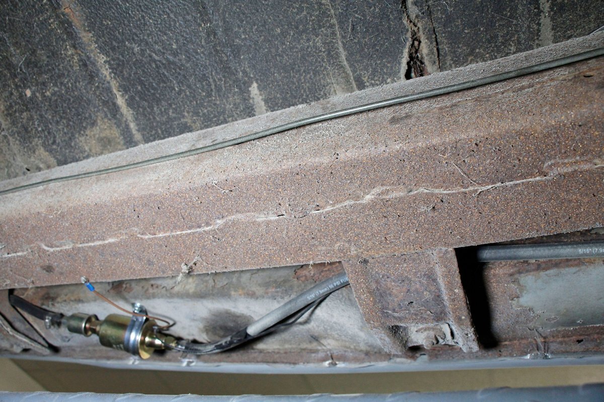 Red vinyl door panels show wear, fading and some dirt. Pitted, formerly shiny knobs, and actuators have some rust and sport bakelite escutcheons and knobs in warm cream color. Inside it will be a total redux showing torn vinyl covered benches for the passengers, a dash that has been relieved of some of its parts, and a broken steering wheel. Rubber covers the floors in front, and in back worn tan berber carpeting. The dash is painted red also, shows plenty of chipping and pitted and rusted knobs.