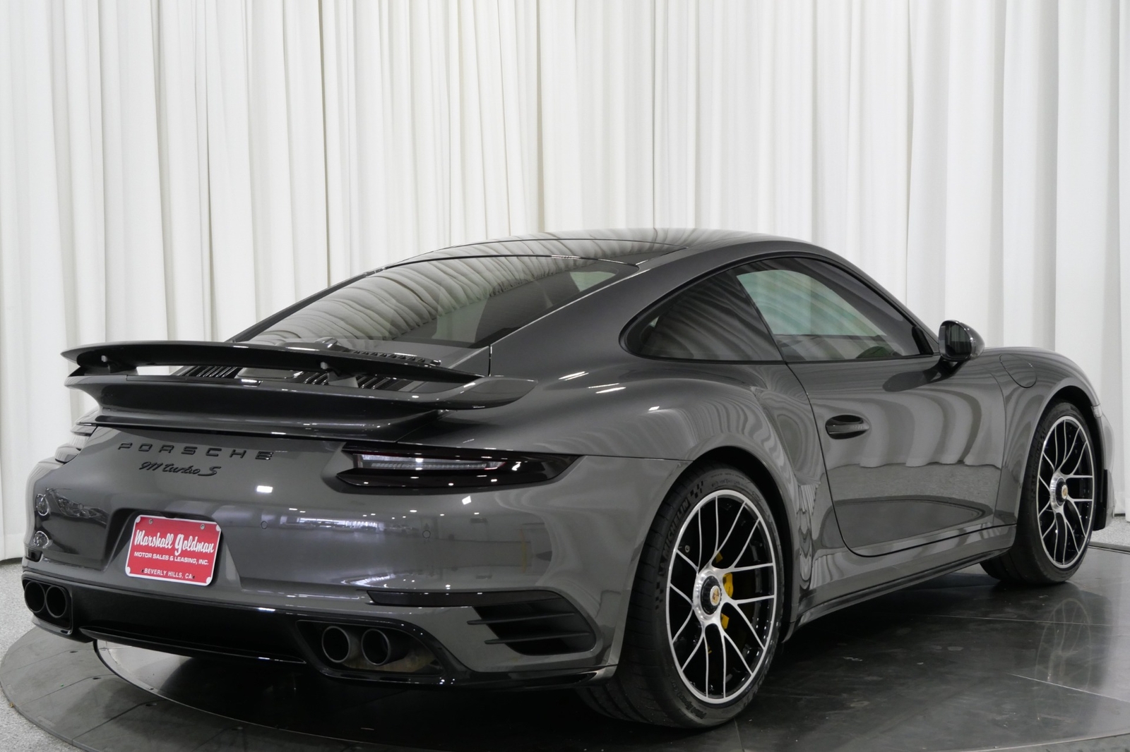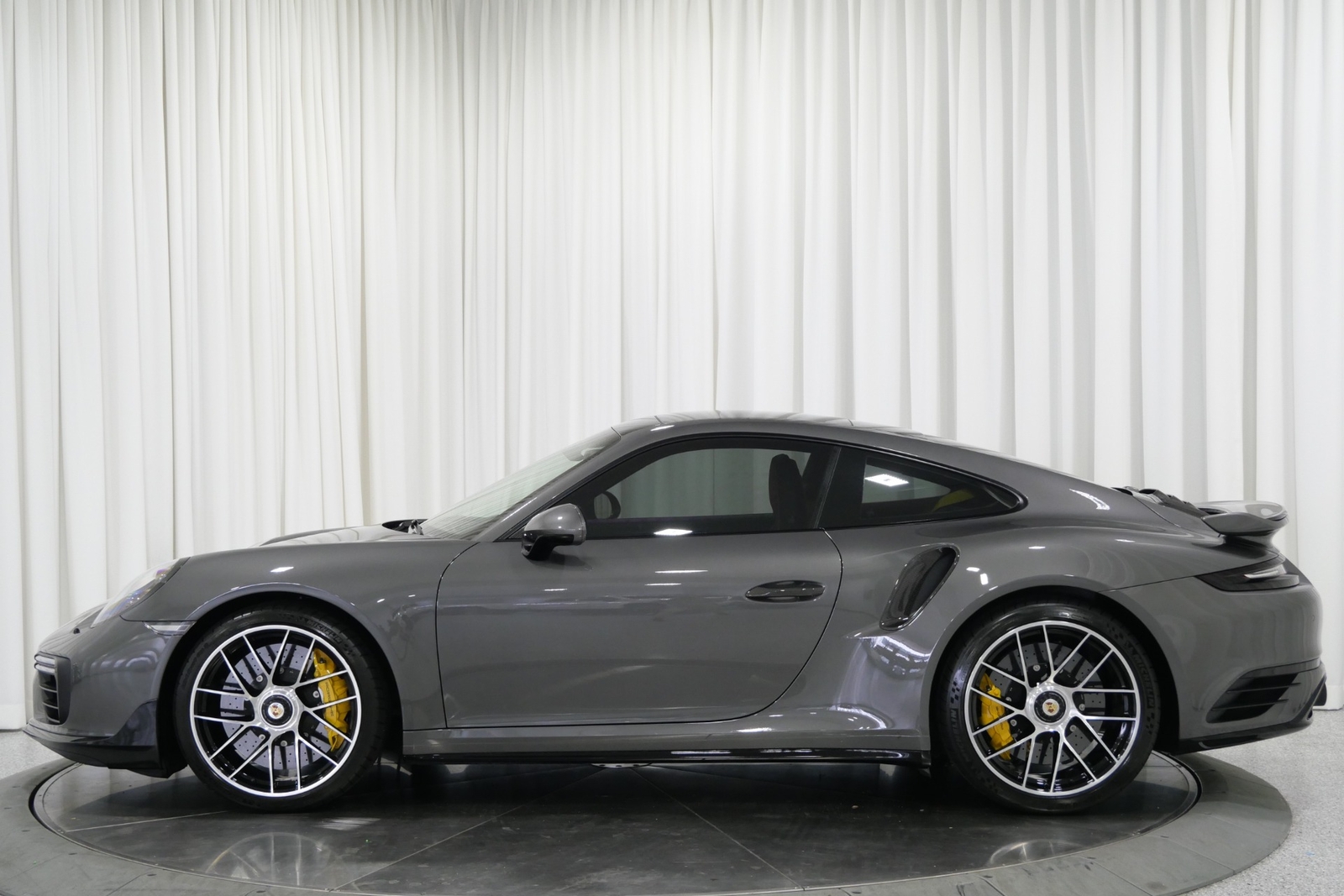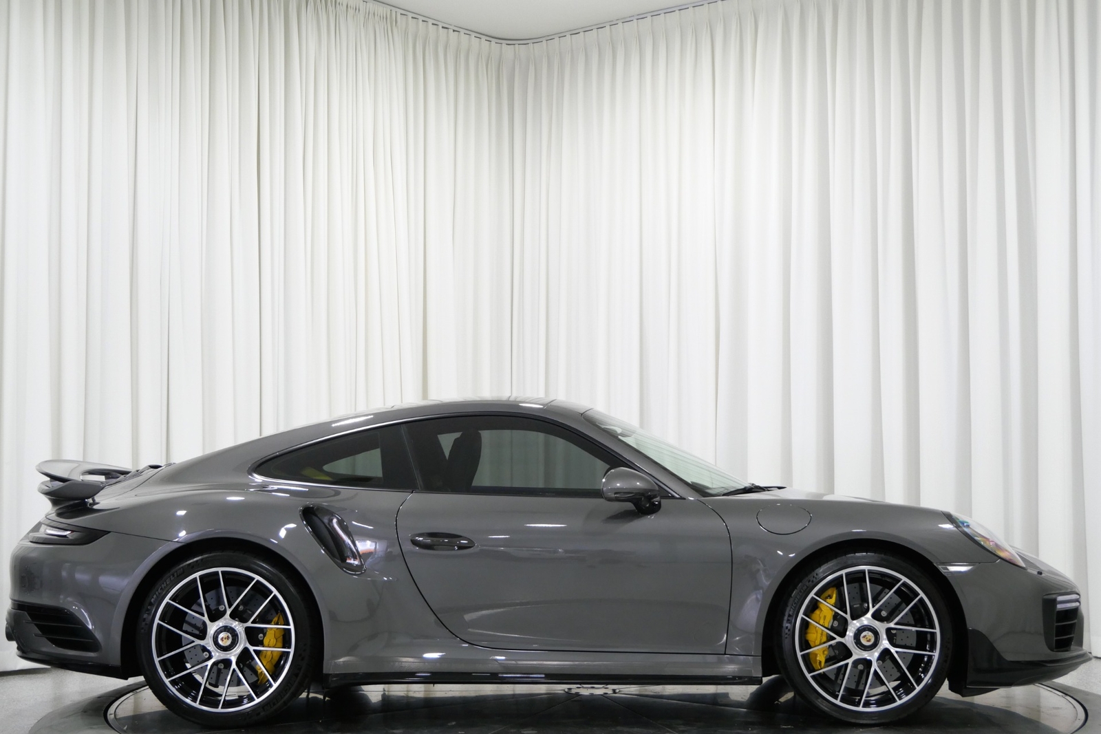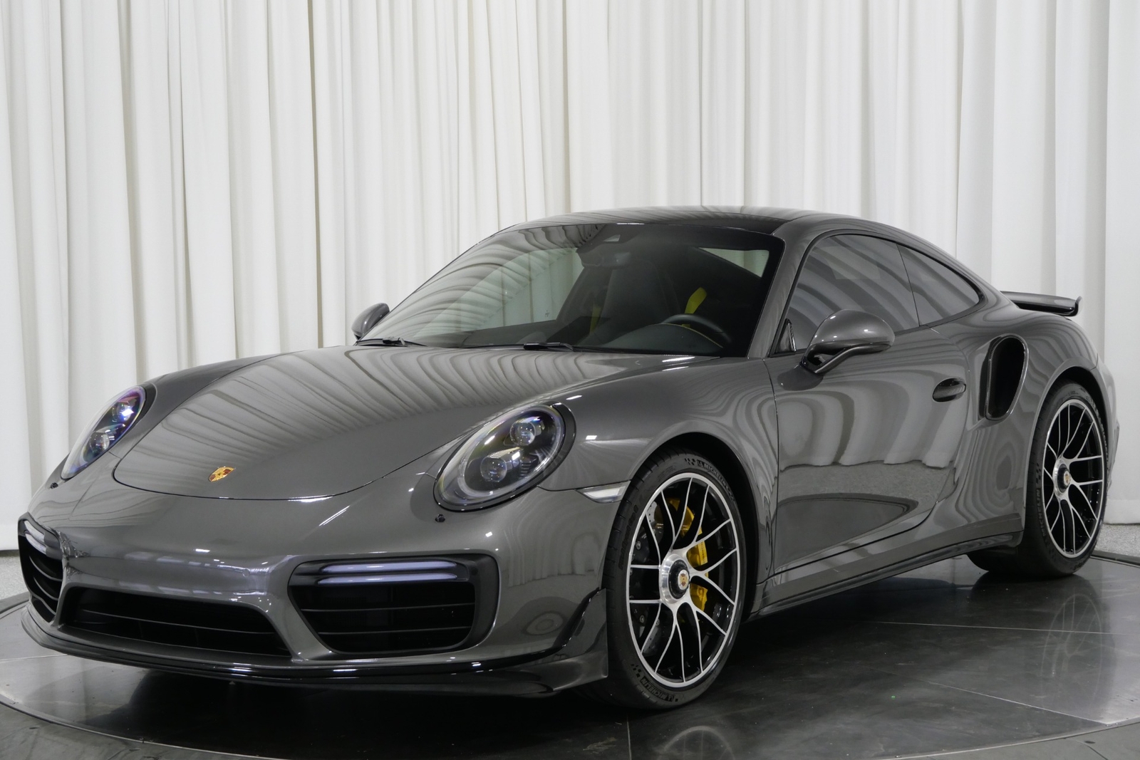 We have just added to our extensive exotic car inventory a beautiful 2018 Porsche 911 Turbo S in Agate Grey Metallic with Black interior with only 11,788 miles. This Turbo S is loaded with: 3.8 Liter twin turbo flat six, PDK transmission, 20 inch machine finish Turbo S wheels, Aerokit Turbo in high gloss black, electric tilt/side sunroof in glass, headlamp washers painted black, Porsche script on decklid painted black, tinted taillights, front axle lift, SportDesign exterior mirrors with gloss black lower trim, LED headlamps in black with dynamic lighting, illuminated stainless steel door sills, Burmester high end audio, console lid with embossed model designation, extended deviated interior stitching in yellow, steering column in leather with yellow stitching, yellow seat belts, center console lid with embossed model designation, Porsche crests embossed in headrests, instruments in Racing Yellow, Sport Chrono face in Racing Yellow, pedals and footrest in aluminum, Porsche entry and drive, light design package, heated seats, park assist front and rear with rear camera, 18 way power sports seats plus and much more. Additionally the exterior features an extensive amount of aftermarket carbon fiber including the rear spoiler, rear engine cover slats, the rear side intakes, door handles and window triangle trim. Annual service performed 1/2024, 260 miles ago.