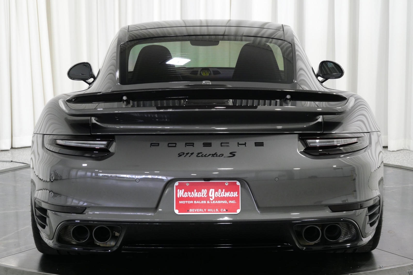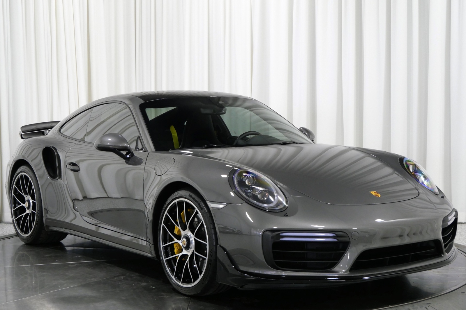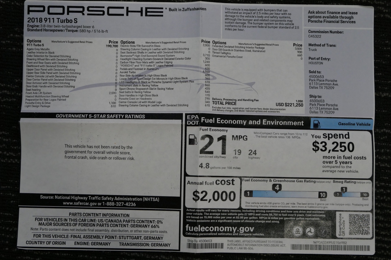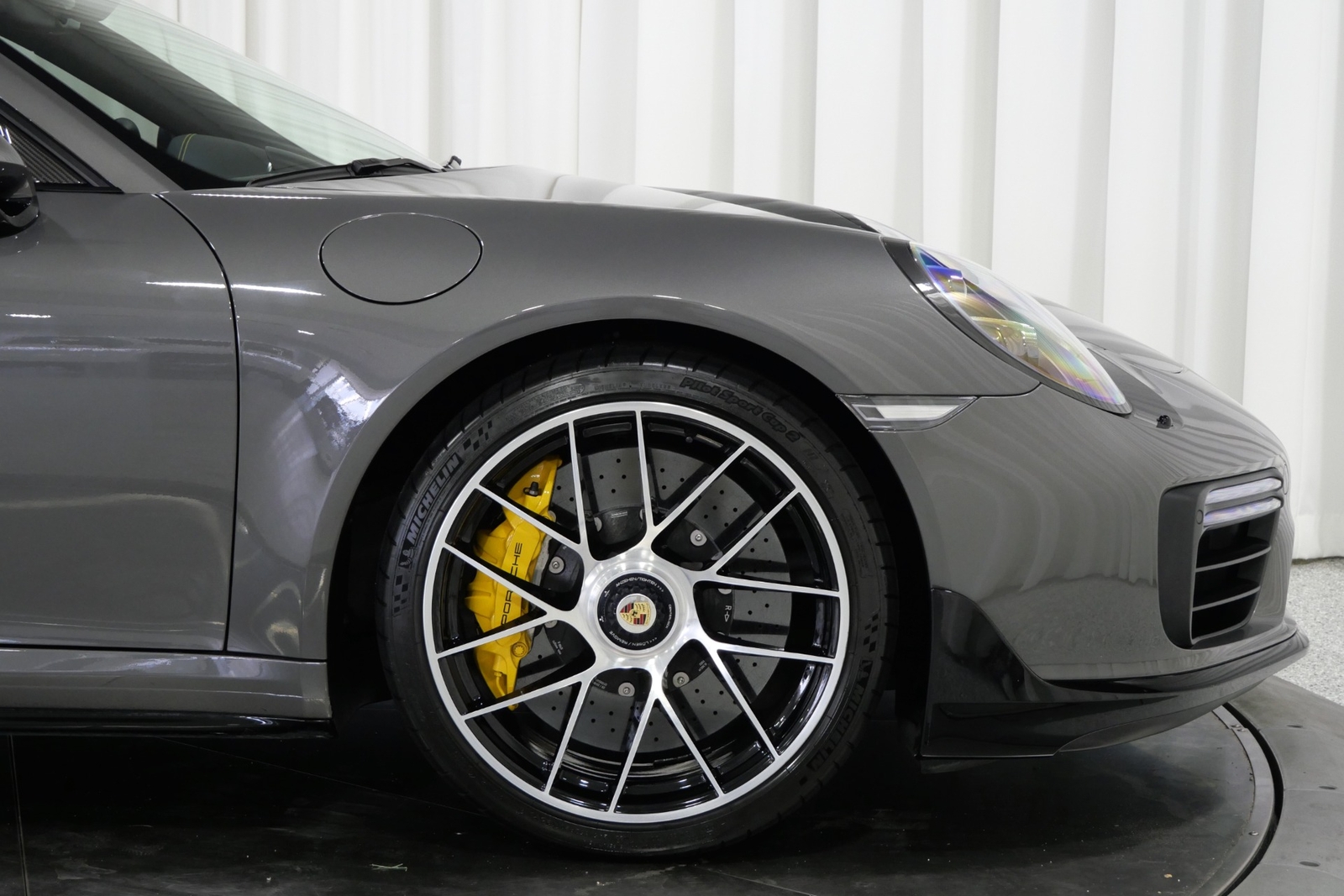 We have just added to our extensive exotic car inventory a beautiful 2018 Porsche 911 Turbo S in Agate Grey Metallic with Black interior with only 11,788 miles. This Turbo S is loaded with: 3.8 Liter twin turbo flat six, PDK transmission, 20 inch machine finish Turbo S wheels, Aerokit Turbo in high gloss black, electric tilt/side sunroof in glass, headlamp washers painted black, Porsche script on decklid painted black, tinted taillights, front axle lift, SportDesign exterior mirrors with gloss black lower trim, LED headlamps in black with dynamic lighting, illuminated stainless steel door sills, Burmester high end audio, console lid with embossed model designation, extended deviated interior stitching in yellow, steering column in leather with yellow stitching, yellow seat belts, center console lid with embossed model designation, Porsche crests embossed in headrests, instruments in Racing Yellow, Sport Chrono face in Racing Yellow, pedals and footrest in aluminum, Porsche entry and drive, light design package, heated seats, park assist front and rear with rear camera, 18 way power sports seats plus and much more. Additionally the exterior features an extensive amount of aftermarket carbon fiber including the rear spoiler, rear engine cover slats, the rear side intakes, door handles and window triangle trim. Annual service performed 1/2024, 260 miles ago.