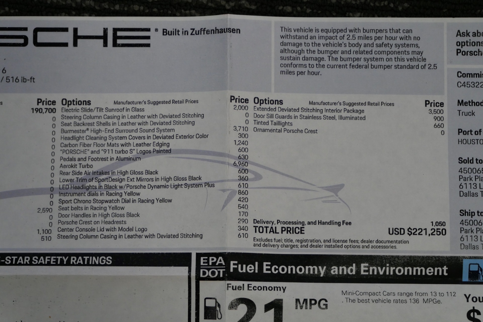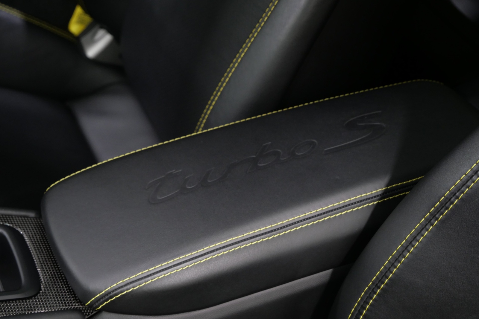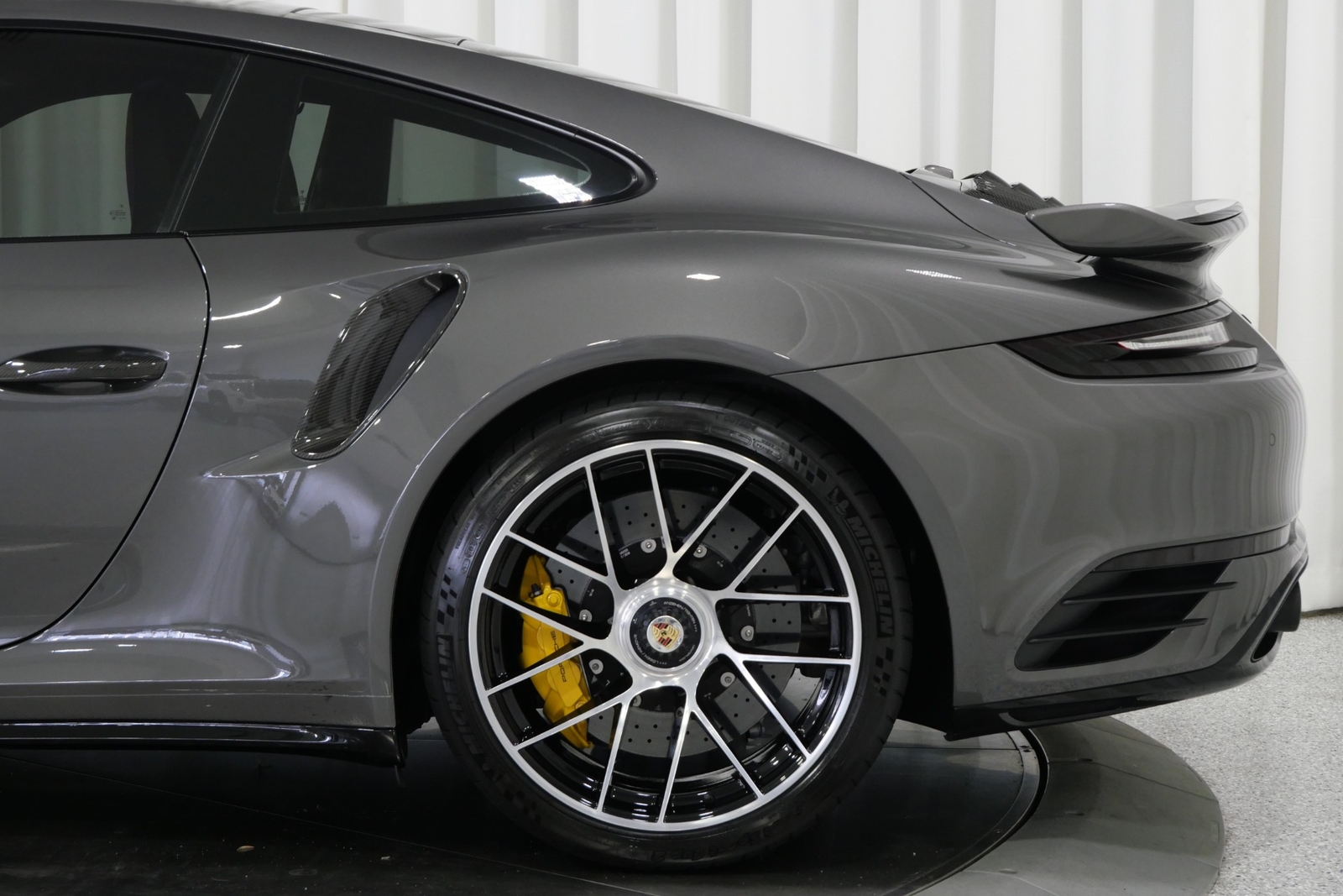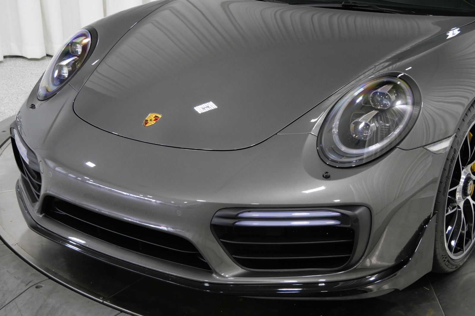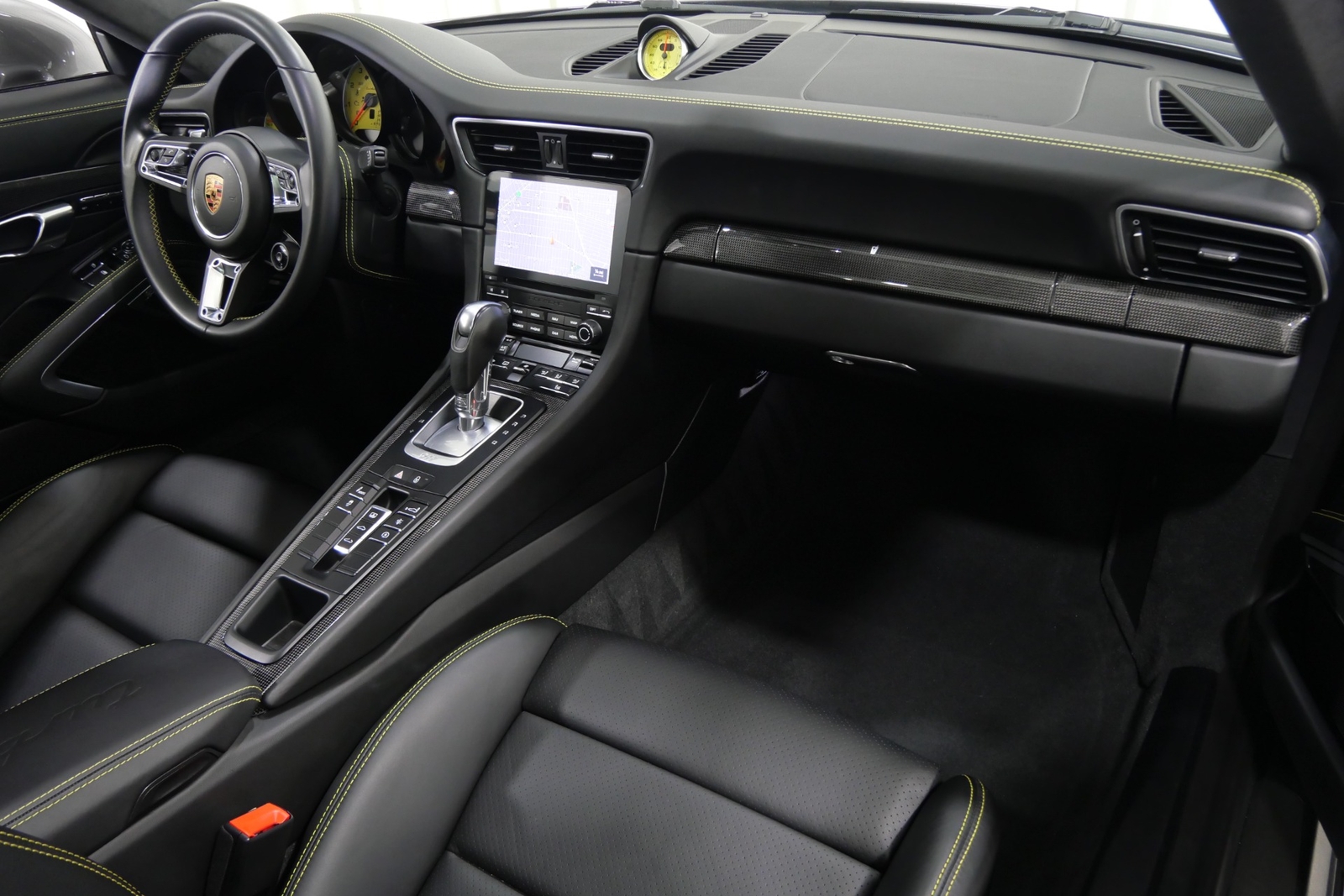 We have just added to our extensive exotic car inventory a beautiful 2018 Porsche 911 Turbo S in Agate Grey Metallic with Black interior with only 11,788 miles. This Turbo S is loaded with: 3.8 Liter twin turbo flat six, PDK transmission, 20 inch machine finish Turbo S wheels, Aerokit Turbo in high gloss black, electric tilt/side sunroof in glass, headlamp washers painted black, Porsche script on decklid painted black, tinted taillights, front axle lift, SportDesign exterior mirrors with gloss black lower trim, LED headlamps in black with dynamic lighting, illuminated stainless steel door sills, Burmester high end audio, console lid with embossed model designation, extended deviated interior stitching in yellow, steering column in leather with yellow stitching, yellow seat belts, center console lid with embossed model designation, Porsche crests embossed in headrests, instruments in Racing Yellow, Sport Chrono face in Racing Yellow, pedals and footrest in aluminum, Porsche entry and drive, light design package, heated seats, park assist front and rear with rear camera, 18 way power sports seats plus and much more. Additionally the exterior features an extensive amount of aftermarket carbon fiber including the rear spoiler, rear engine cover slats, the rear side intakes, door handles and window triangle trim. Annual service performed 1/2024, 260 miles ago.