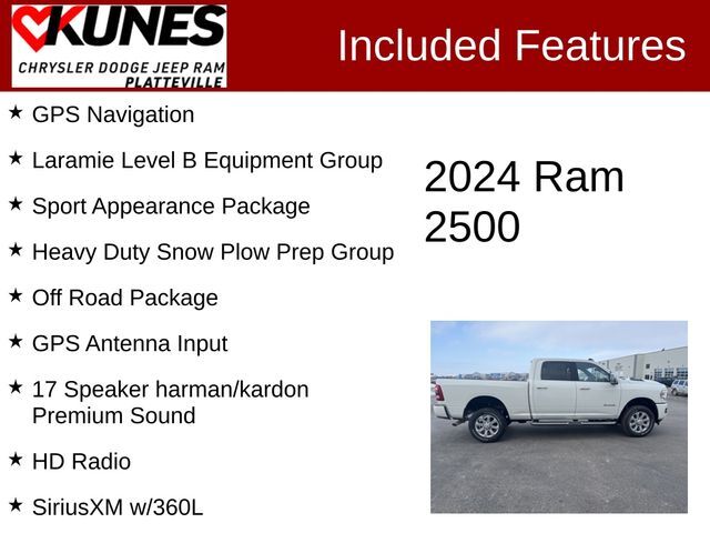 2024 Ram 2500 Laramie Laramie 4WD Dealer Discount of $6,290 off MSRP Pearl White 12 Touchscreen Display, 17 Speaker harman/kardon Premium Sound, 20 x 8.0 Polished Aluminum Wheels, 220 Amp Alternator, 2nd Row In Floor Storage Bins, 4G LTE Wi-Fi Hot Spot, Alexa Built-In, Apple CarPlay, Auto Adjust In Reverse Exterior Mirrors, Auto Dim Exterior Mirror, Auto High Beam Headlamp Control, Auto Power-Folding Mirrors, Auto-Dimming Exterior Passenger Mirror, Black Interior Accents, Blind Spot & Cross Path Detection, Body Color Grille Surround, Center Hub, Chrome Exterior Mirrors, Connected Travel & Traffic Services, Connectivity - US/Canada, Disassociated Touchscreen Display, Exterior Mirrors Courtesy Lamps, Exterior Mirrors w/Heating Element, Exterior Mirrors w/Memory, Exterior Mirrors w/Supplemental Signals, Foam Bottle Insert (Door Trim Panel), For Details, Visit , For More Info, Call844-372-6782, Forward & Reverse Utility Lights, Front LED Fog Lamps, Front Performance Tuned Shock Absorbers, Global Telematics Box Module (TBM), Google Android Auto, GPS Antenna Input, GPS Navigation, HD Radio, Heated Second Row Seats, Heavy Duty Snow Plow Prep Group, Hill Descent Control, Integrated Voice Command w/Bluetooth, Laramie Level B Equipment Group, LED Reflector Headlamps, LED Tail Lamps, Mirror Running Lights, Off Road Package, Off-Road Information Pages, ParkSense Front/Rear Park Assist System, Power Adjust Mirrors, Power Adjustable Convex Aux Mirrors, Power Adjustable Pedals w/Memory, Power Heated Fold Telescopic Mirrors w/Memory, Power Telescoping Mirrors, Radio: Uconnect 5 Nav w/12.0 Display, Rain Sensitive Windshield Wipers, Rear Performance Tuned Shock Absorbers, Rear Power Sliding Window, Rear Window Defroster, Remote Tailgate Release, Selectable Tire Fill Alert, SiriusXM Radio Service, SiriusXM w/360L, Sport Appearance Package, Sport Decal, Sport Performance Hood, Tow Hooks, Trailer Tow Pages, Wheels: 18 x 8.0 Polished Aluminum. 8-Speed Automatic 6.4L V8