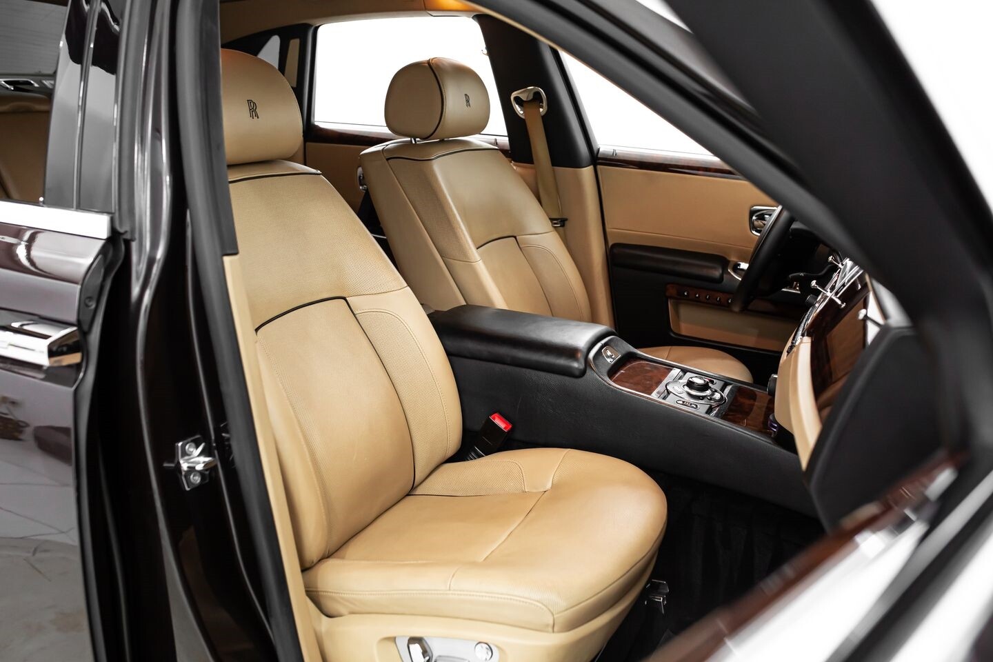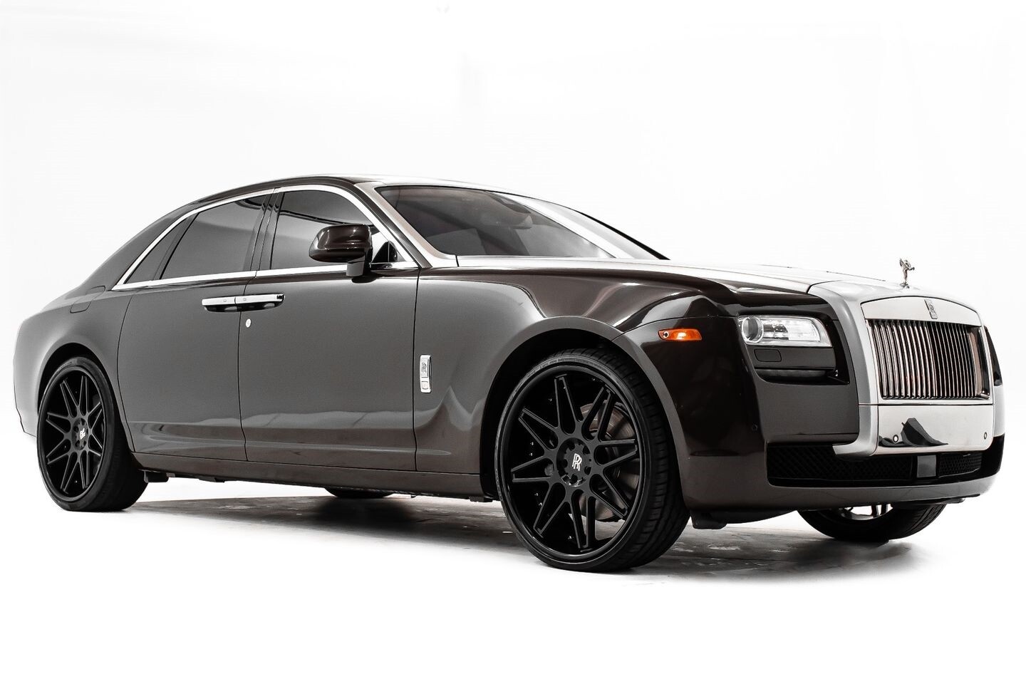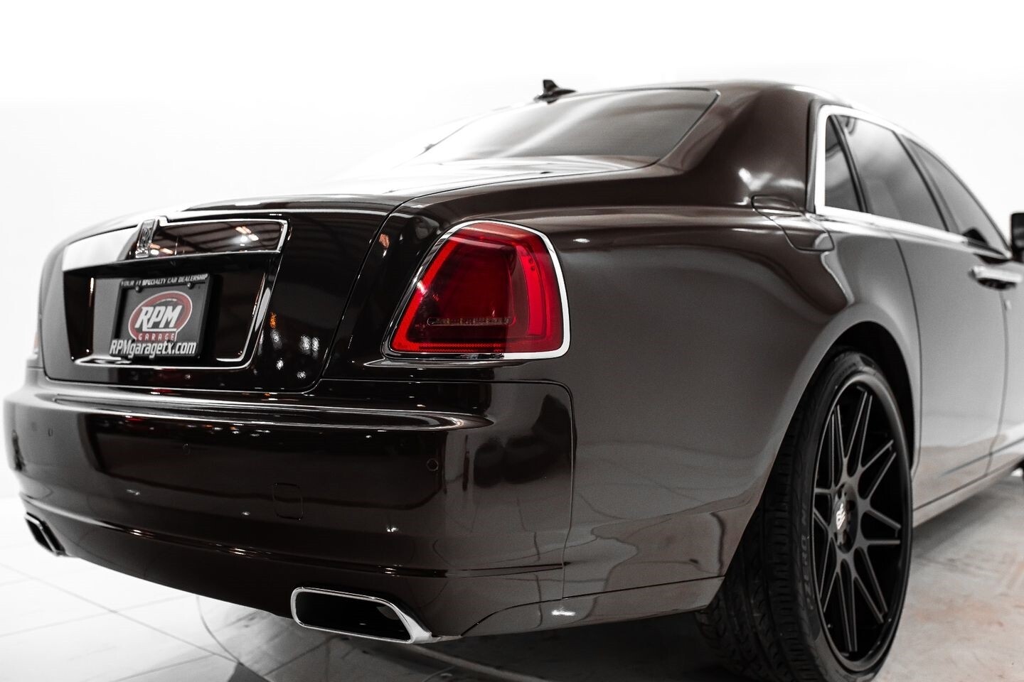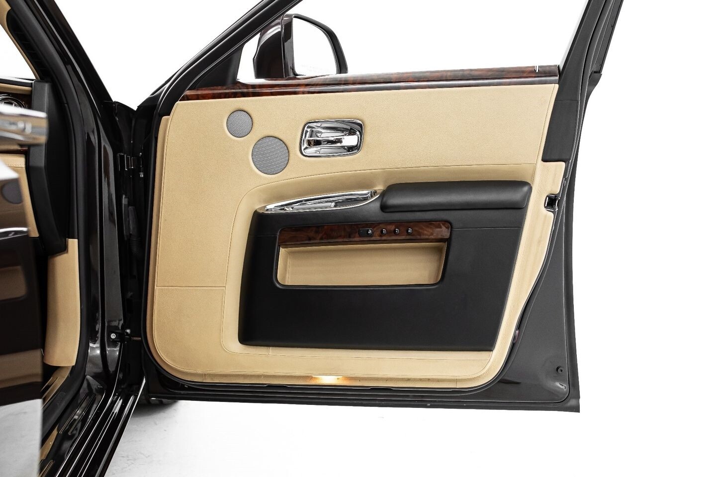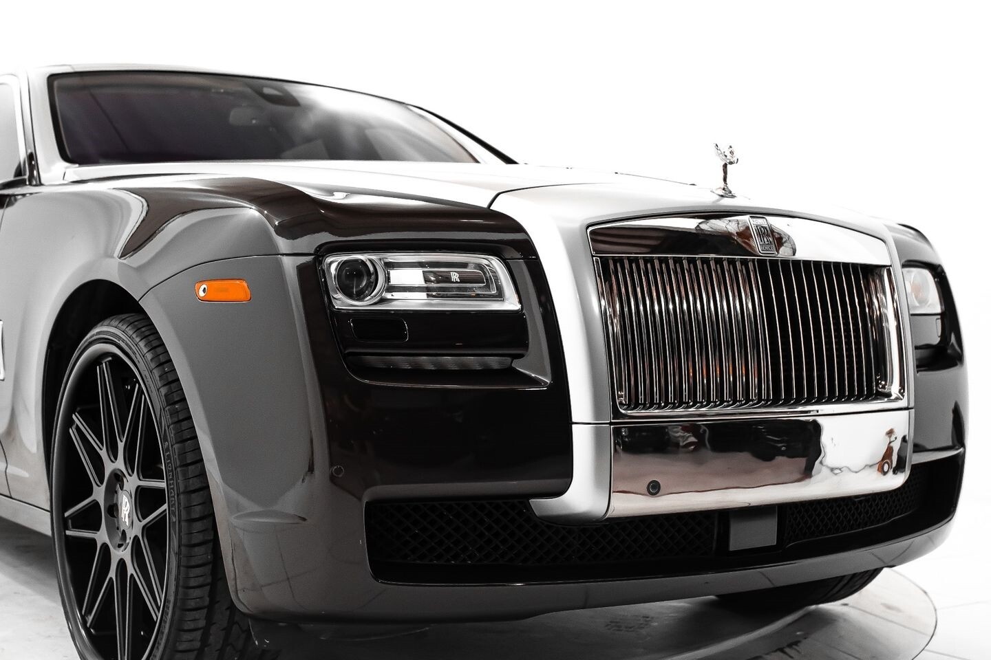 This 2013 Rolls-Royce Ghost is a luxurious sedan that simply has no equivalent. Under the hood, a twin-turbocharged 6.6-liter V12 engine produces 563 horsepower and 575 lb-ft of torque, all of which is sent through a eight-speed automatic transmission to the rear wheels. This eye-catching British masterpiece comes equipped with 24" AZAD wheels in matte black and is one of few examples to receive a factory two-tone paint finish: silver over metallic brown. With this exotic color combination, this Rolls-Royce is a true head-turner. In the interior, this Ghost offers heated and ventilated leather seats in the front and the rear, adjustable rear seats, quad-zone climate controls, a rear entertainment screen package, button push-to-close rear doors, wood interior trim pieces, selectable suspension height settings, a heads-up display, and an infotainment system with Bluetooth, navigation, apps, phone connectivity, CD, AUX, and a backup camera, truly making this car the complete package.