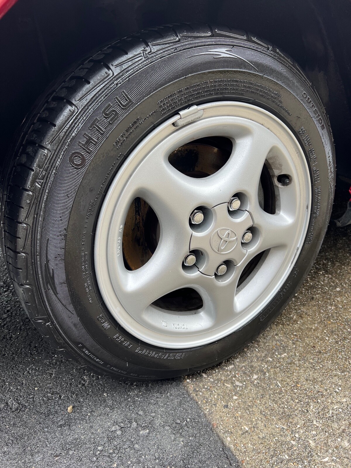 Silver 14? five-spoke alloy wheels are mounted with 195/60 Ohtsu FP0612 A/S tires that show 2019 date codes. Four-wheel disc brakes came standard.