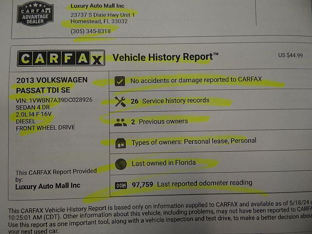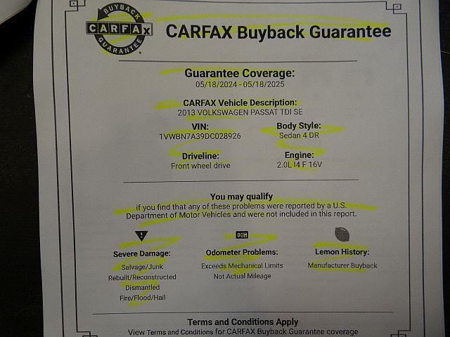 Nice Low mileage 2013 VW Passat SE TDI w/ Sunroof! Only 97K Actual Miles! Carfax NO accidents! Certified Pre-Owned by VW on 08-19-2020! TIMING BELT Replaced at VW @ 92,388 Miles! A BIG plus folks! Well maintained at the dealership! Loaded with heated seats, Sunroof, Powered drivers seat, Alloy Wheels and more! Priced to sell! Dont miss out!