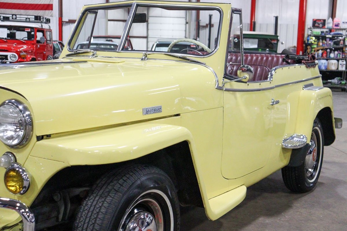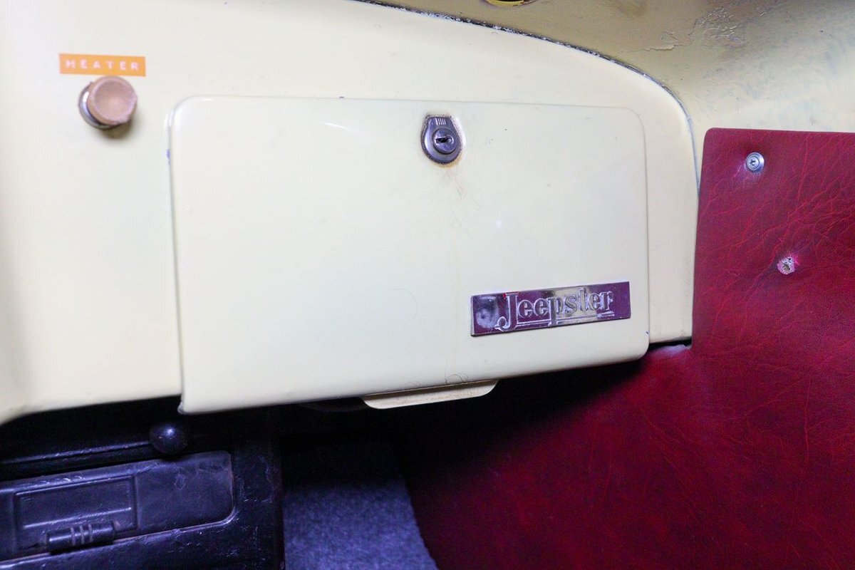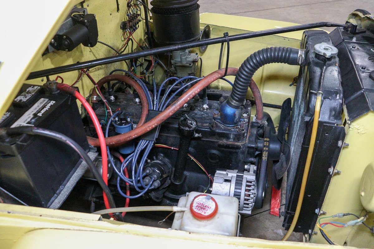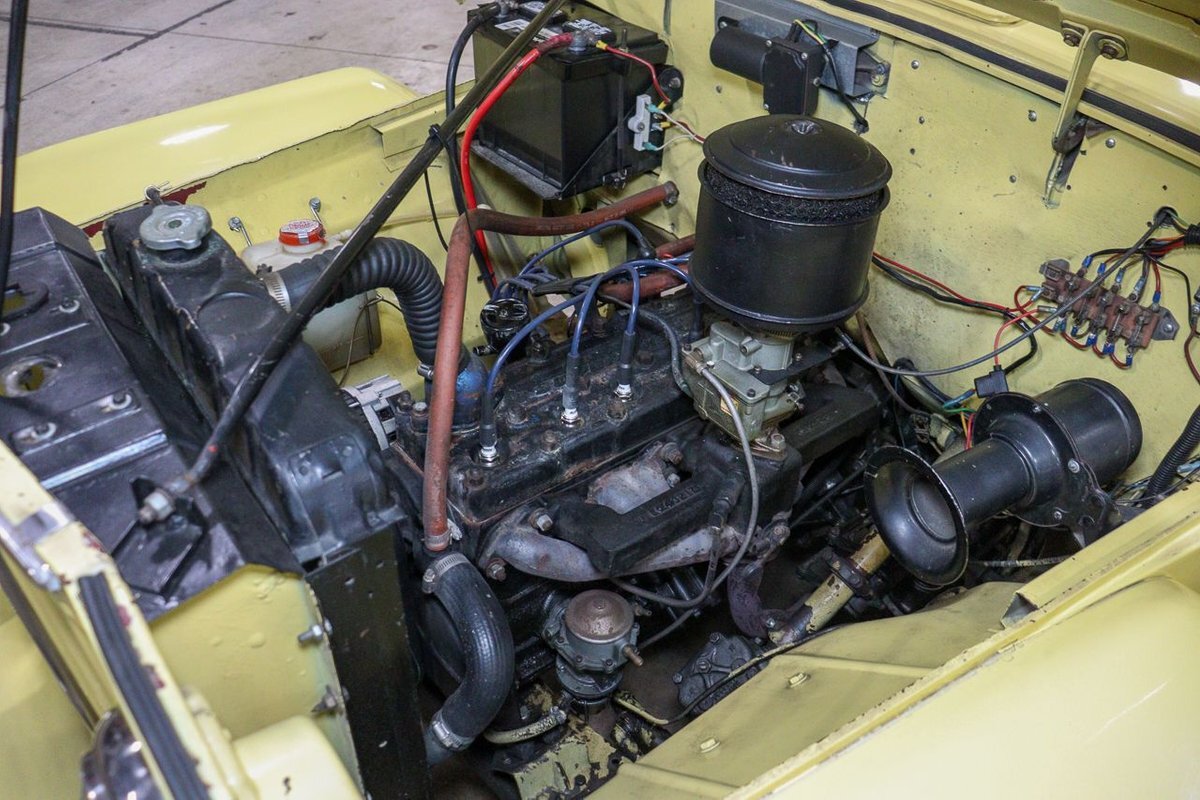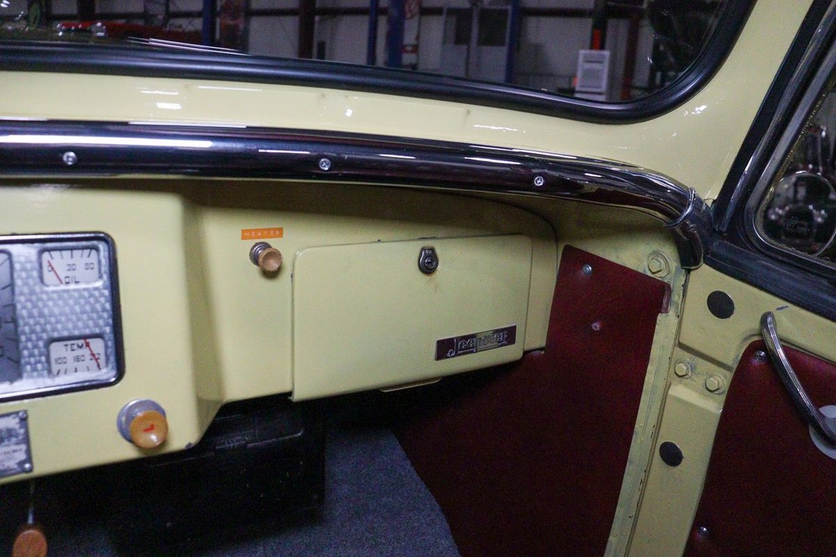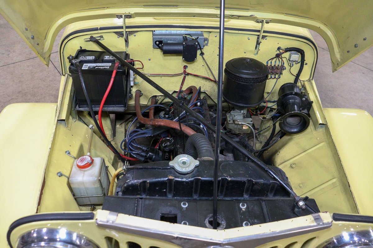 Finished in Fiesta Yellow it has very nice brown leather seats and fresh gray carpets. The interior is in fantastic shape and shows well. The trim is clean and really pops against the fiesta yellow. The convertible top is in good shape and the side curtains are clear to see through. This Jeepster happens to have had the engine upgraded to a more powerful Kaiser inline 6 cylinder. This jeepster also has all new glass, a new rear bumper with the Willys logo, rebuilt steering box, and new rubber mats. The electrical system has been upgraded to a 12 volt system with a new alternator and period correct turn signals. Recent services included all fluids, brakes including master cylinder.