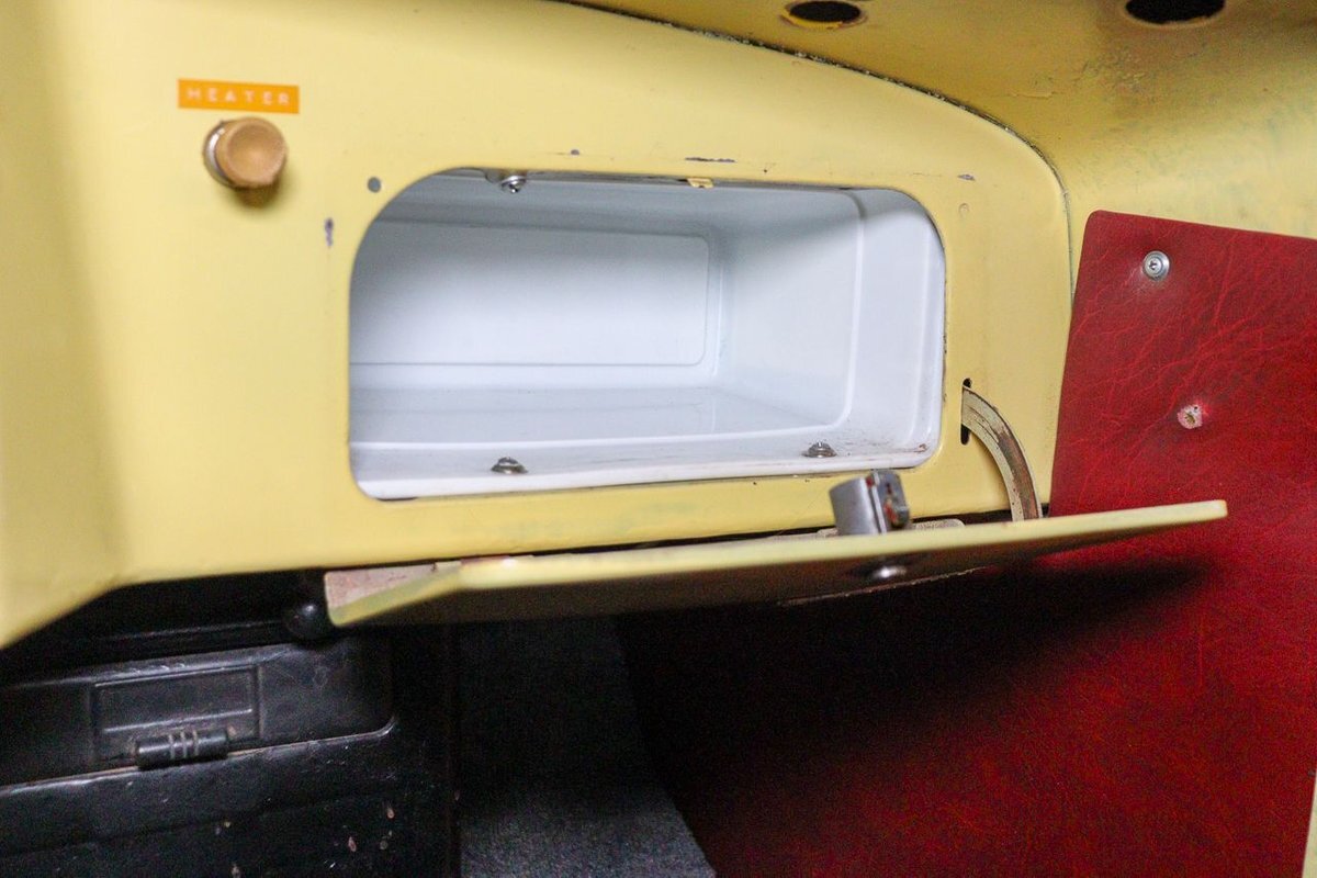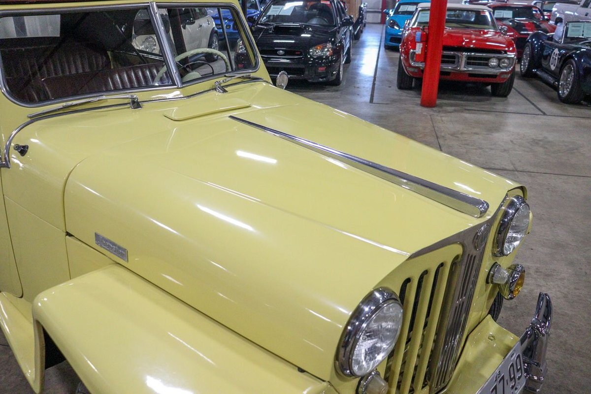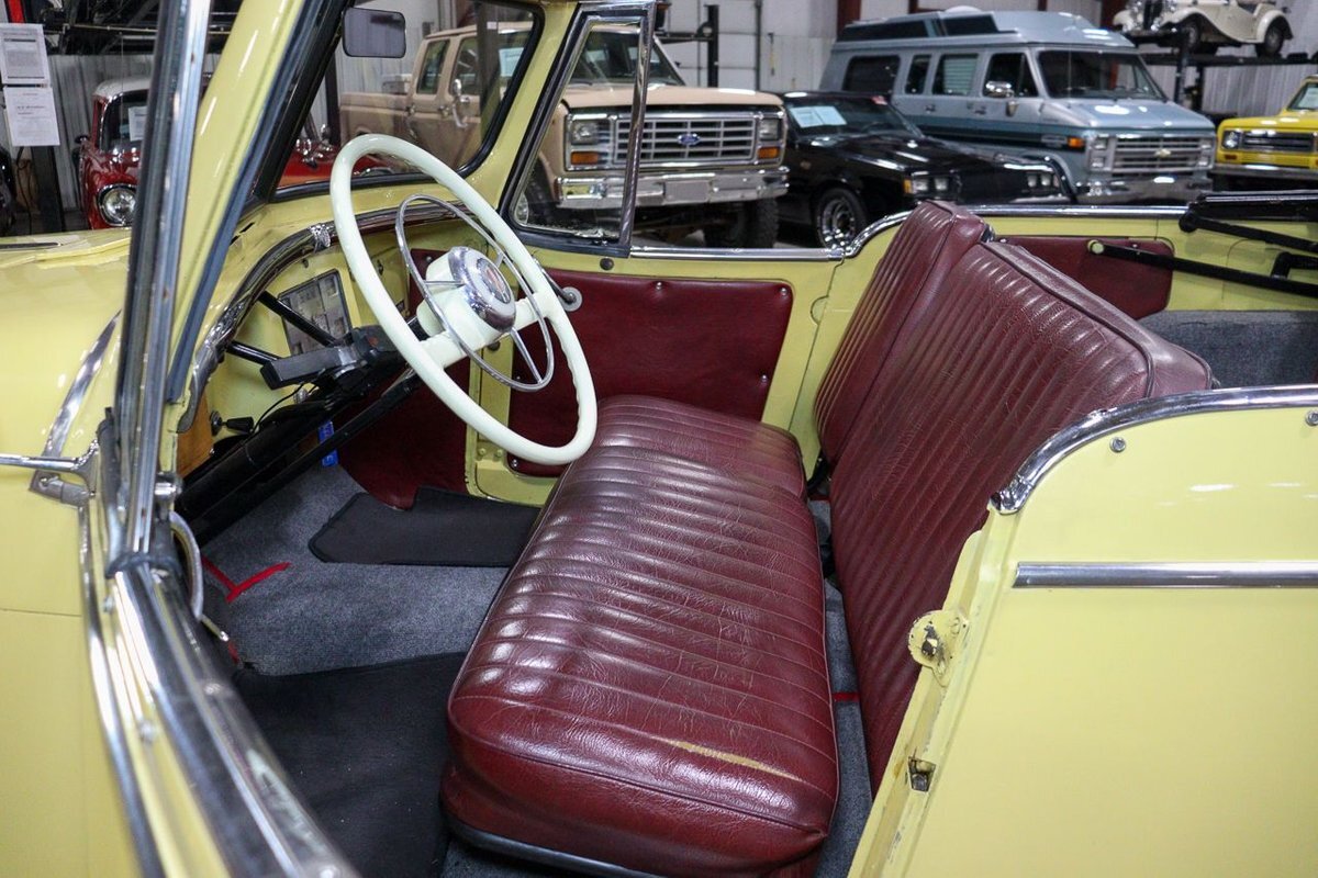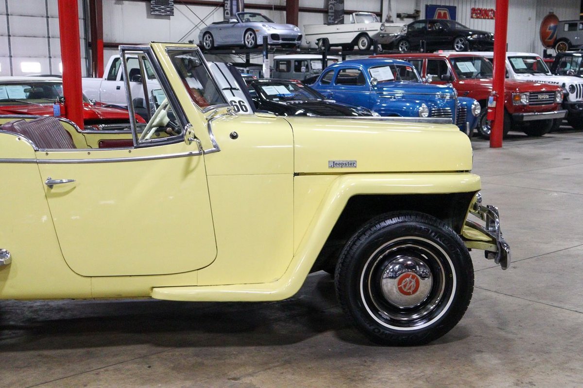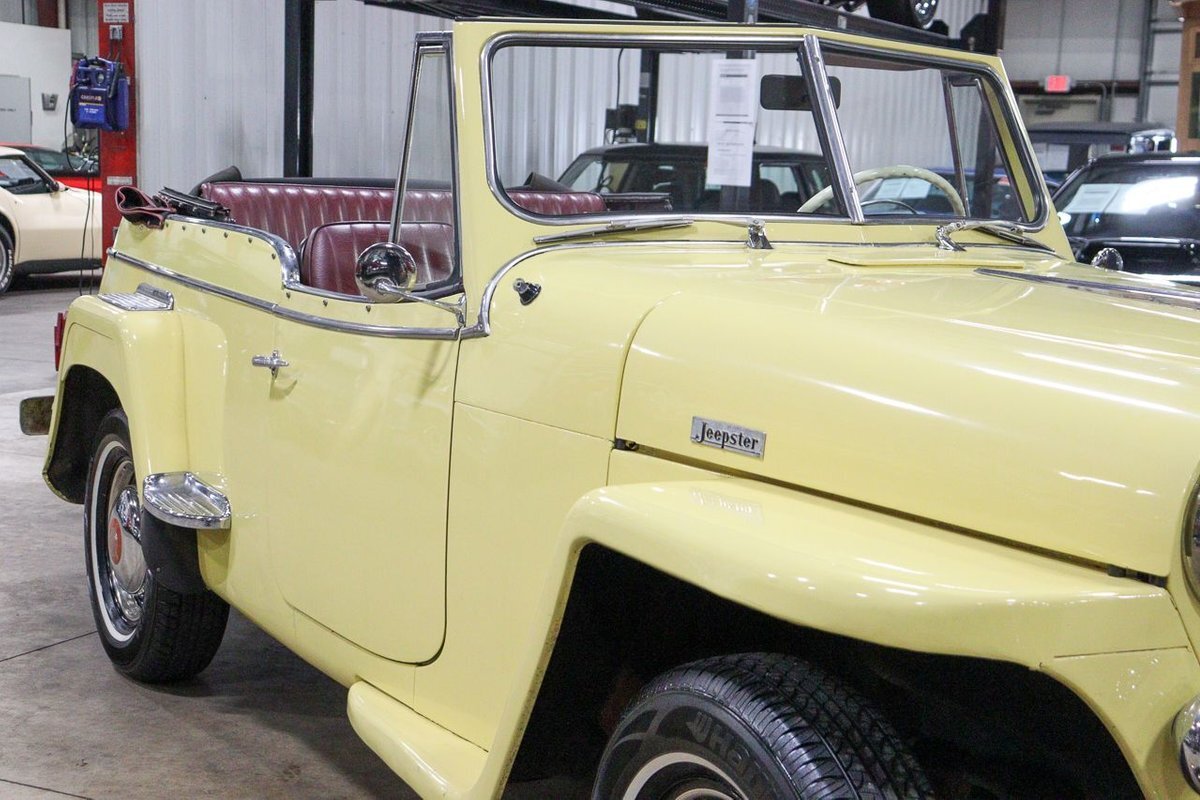 Finished in Fiesta Yellow it has very nice brown leather seats and fresh gray carpets. The interior is in fantastic shape and shows well. The trim is clean and really pops against the fiesta yellow. The convertible top is in good shape and the side curtains are clear to see through. This Jeepster happens to have had the engine upgraded to a more powerful Kaiser inline 6 cylinder. This jeepster also has all new glass, a new rear bumper with the Willys logo, rebuilt steering box, and new rubber mats. The electrical system has been upgraded to a 12 volt system with a new alternator and period correct turn signals. Recent services included all fluids, brakes including master cylinder.