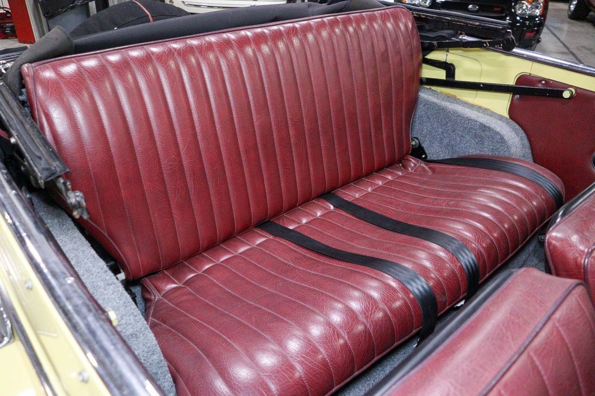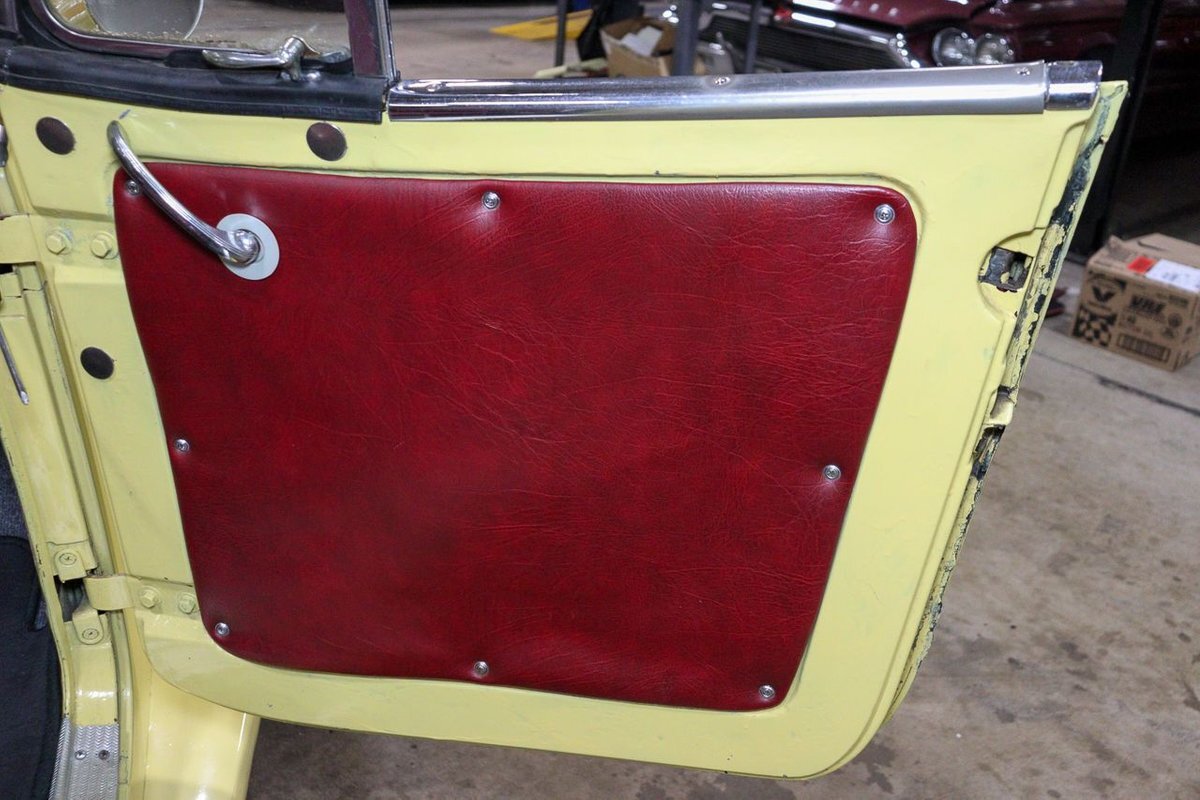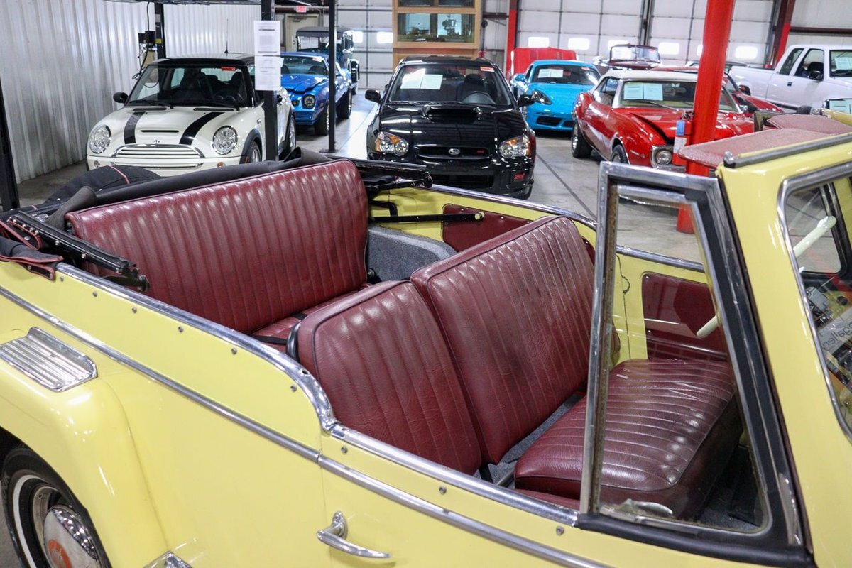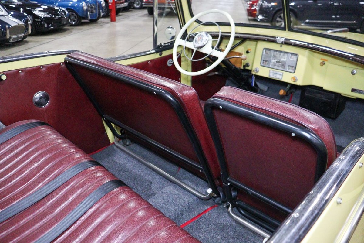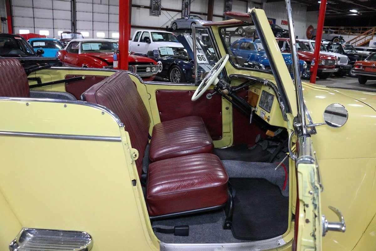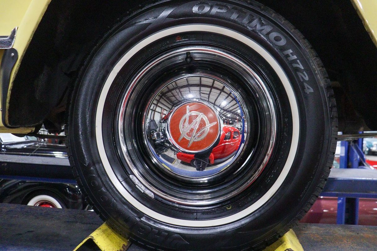 Finished in Fiesta Yellow it has very nice brown leather seats and fresh gray carpets. The interior is in fantastic shape and shows well. The trim is clean and really pops against the fiesta yellow. The convertible top is in good shape and the side curtains are clear to see through. This Jeepster happens to have had the engine upgraded to a more powerful Kaiser inline 6 cylinder. This jeepster also has all new glass, a new rear bumper with the Willys logo, rebuilt steering box, and new rubber mats. The electrical system has been upgraded to a 12 volt system with a new alternator and period correct turn signals. Recent services included all fluids, brakes including master cylinder.