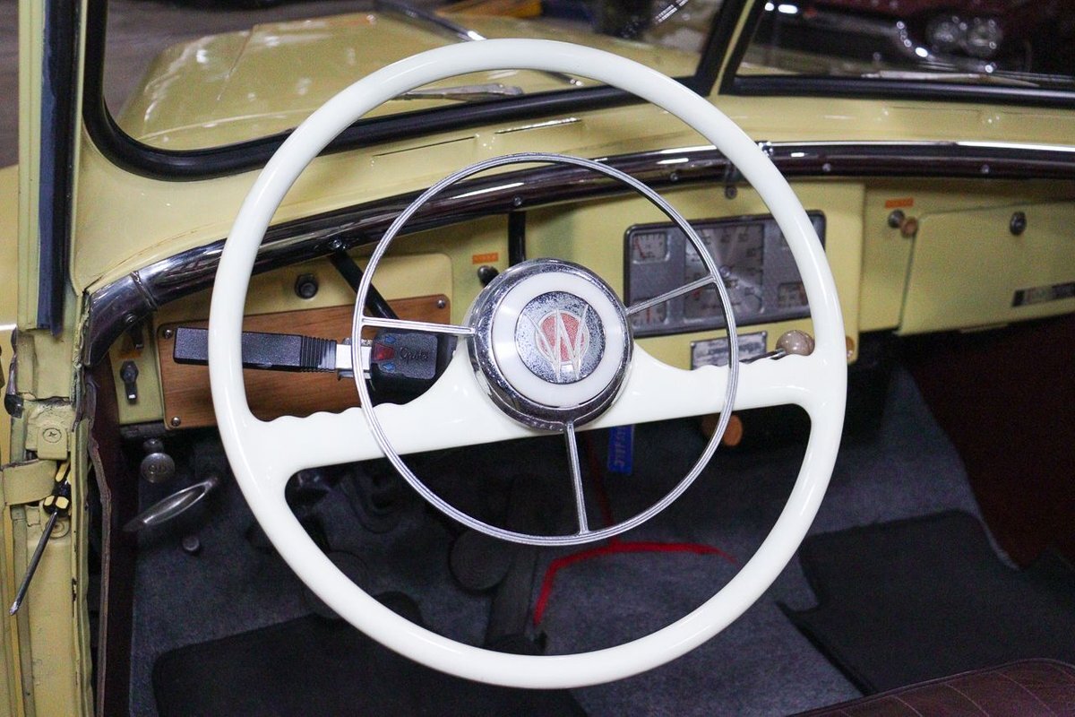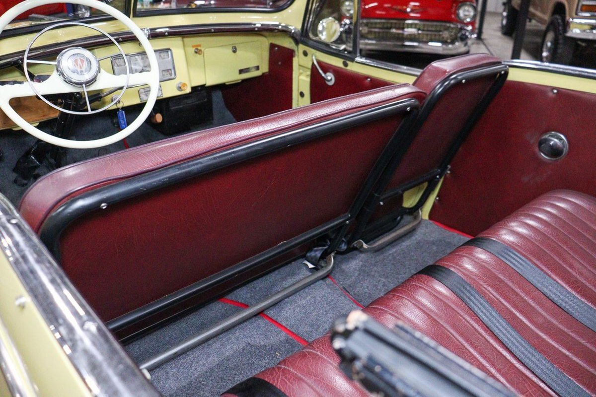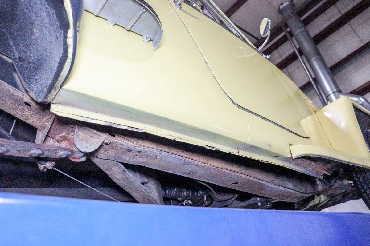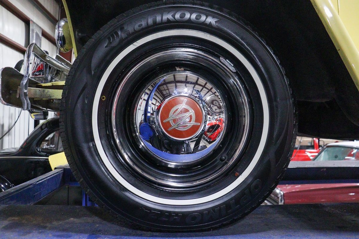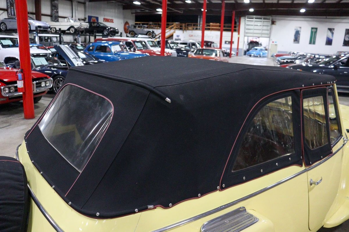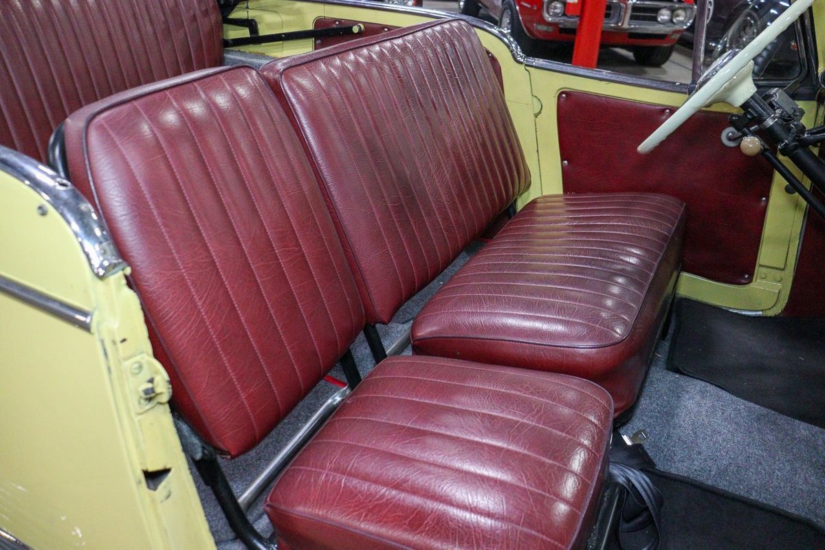 Finished in Fiesta Yellow it has very nice brown leather seats and fresh gray carpets. The interior is in fantastic shape and shows well. The trim is clean and really pops against the fiesta yellow. The convertible top is in good shape and the side curtains are clear to see through. This Jeepster happens to have had the engine upgraded to a more powerful Kaiser inline 6 cylinder. This jeepster also has all new glass, a new rear bumper with the Willys logo, rebuilt steering box, and new rubber mats. The electrical system has been upgraded to a 12 volt system with a new alternator and period correct turn signals. Recent services included all fluids, brakes including master cylinder.