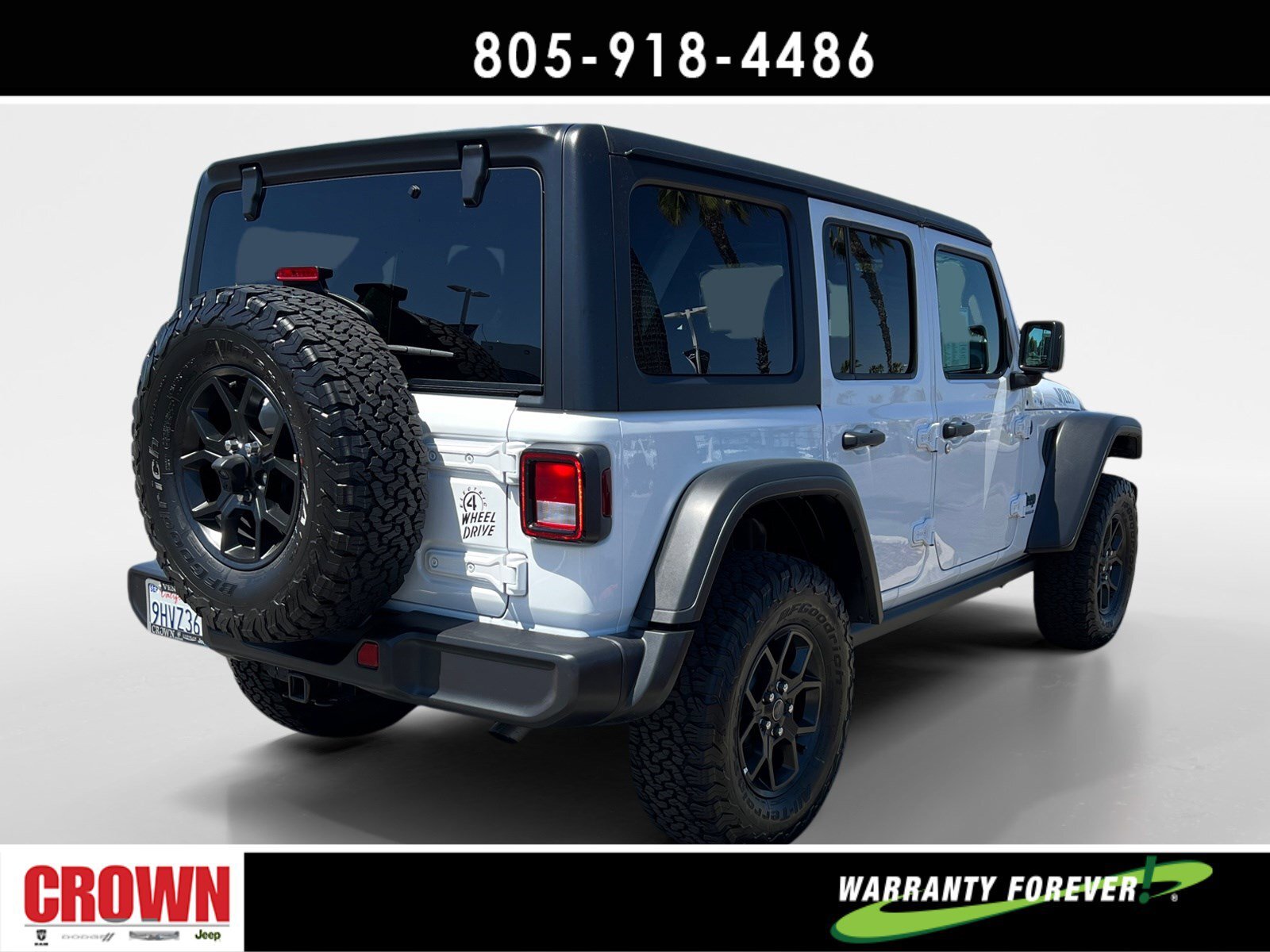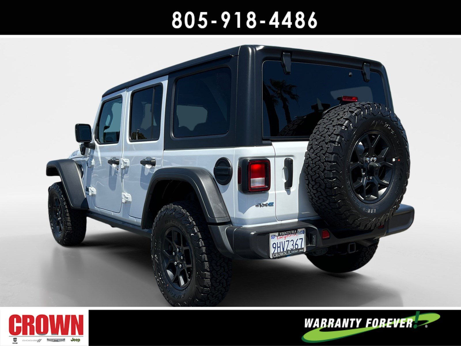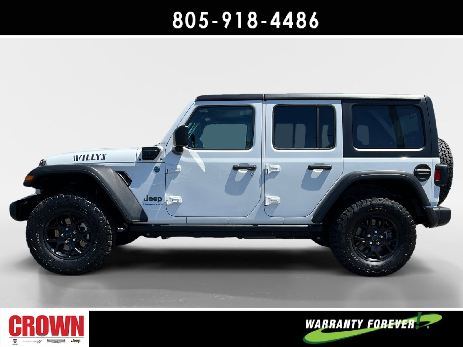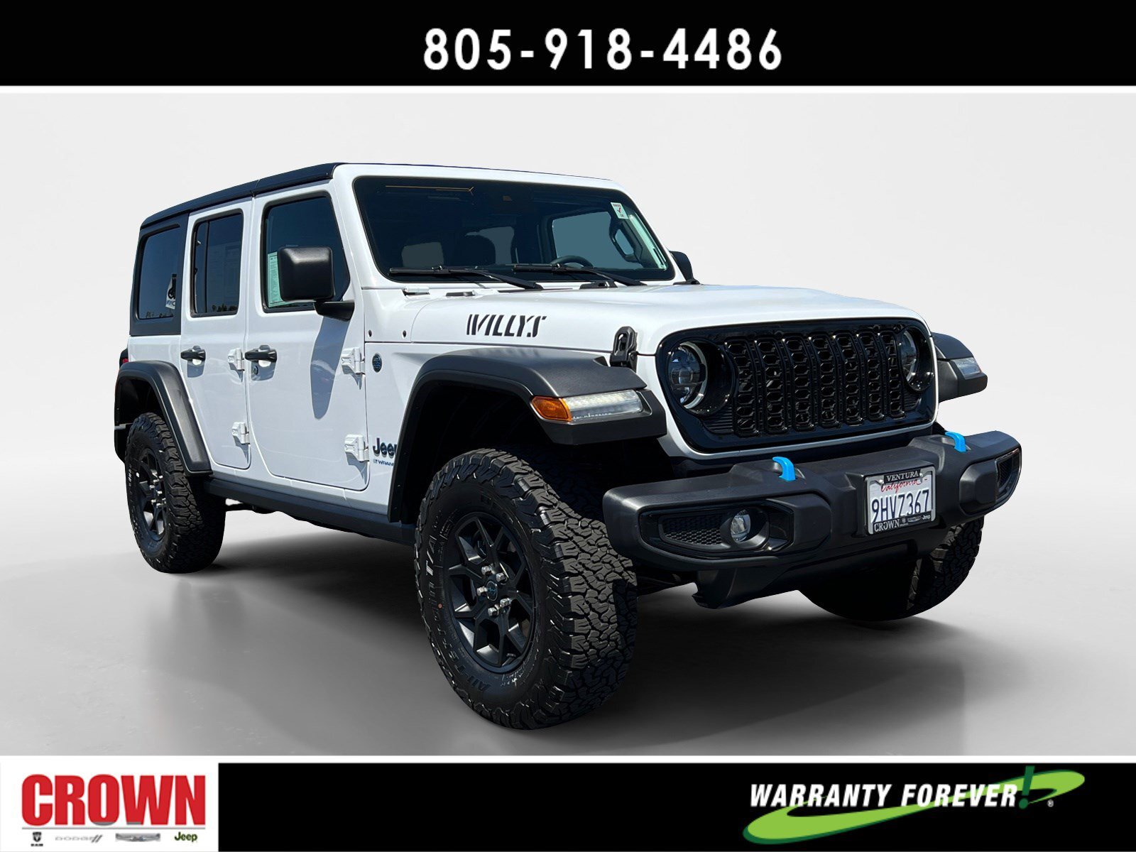 Certified. Bright White Clearcoat 2024 Jeep Wrangler Willys 4xe 4WD 8-Speed Automatic 2.0L I4 DOHC ** 1 Owner Clean CarFax **, 2.0L I4 DOHC, 4.10 Rear Axle Ratio, 4xe 4-Wheel Drive Swing Gate Decal, 7 & 4 Pin Wiring Harness, Apple CarPlay/Android Auto, Automatic temperature control, Auxiliary Switches, Black 3-Piece Hard Top, Black Grille, Cloth Low-Back Bucket Seats, Compass, Conventional Differential Front Axle, E-Locker Rear Axle, Freedom Panel Storage Bag, Front dual zone A/C, Front fog lights, Front LED Fog Lamps, Fully automatic headlights, Heated door mirrors, Illuminated entry, LED Premium Reflector Headlamps, Molded in Color Rubicon Highline Flare, No Soft Top, Off-Road Plus Mode, Outside temperature display, ParkView Rear Back-Up Camera, Power door mirrors, Quick Order Package 29W Willys, Radio: Uconnect 5 w/12.3 Display, Rear Window Defroster, Rear Window Wiper/Washer, Remote keyless entry, Security system, Split folding rear seat, Sport Suspension, Steering wheel mounted audio controls, Wheels: 20 x 8 Machined/Painted Gray, Willy's Suspension, Willys, Willys 4xe Hood Decal.FCA US LLC Certified Pre-Owned Details:* Transferable Warranty* Powertrain Limited Warranty: 84 Month/100,000 Mile (whichever comes first) from original in-service date* Vehicle History* 125 Point Inspection* Limited Warranty: 3 Month/3,000 Mile (whichever comes first) after new car warranty expires or from certified purchase date* Includes First Day Rental, Car Rental Allowance, and Trip Interruption Benefits. SiriusXM 3 month trial subscription* Warranty Deductible: $100* Roadside AssistanceHere at Crown Dodge Chrysler Jeep RAM, we believe that great service means more than just offering our new Dodge, Chrysler, Jeep, and RAM lineup. We believe that great service also includes helpful advice, friendly car financing, and the highest quality parts and repairs for your car. Our staff works hard to make your full automotive experience at our car dealership in Ventura, CA enjoyable, and we look forward to helping you today! All vehicles at Crown Dodge have our SWAT security system $995,Clear Shield $395, Pulse $395, Wheel Locks $395, Windshield Protection $995, Nitro Fill $499, Screen Protector $395 and $1295 Paint/Fabric Protection pre-installed. Prices on the website do not include dealer-added equipment. Discounts include $2,000 Trade-In Dealer Assist Cash. Must trade in a 2015 or newer vehicle on a retail purchase. Trade-in must have less than 15,000 miles on average per year stated on Carfax Report, clean title, and Clean vehicle history report. Expires 02/19/2024. Expires 02/29/2024.