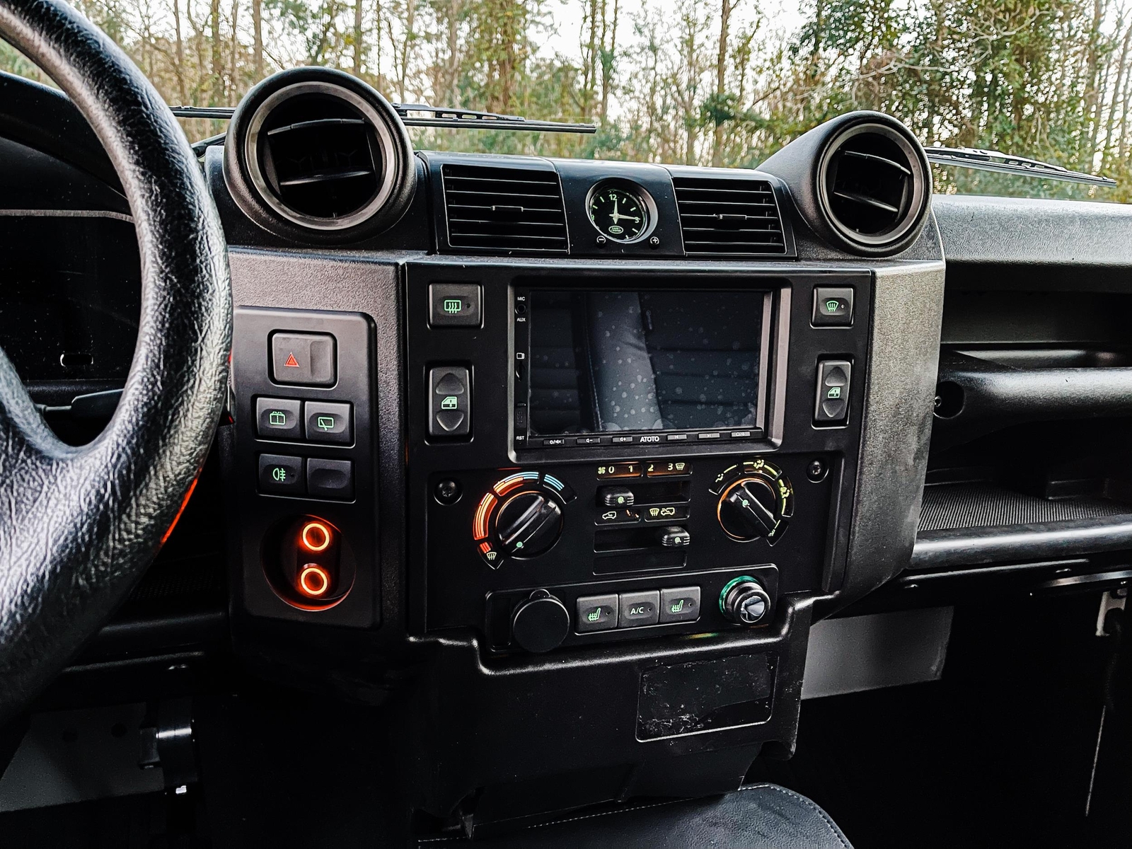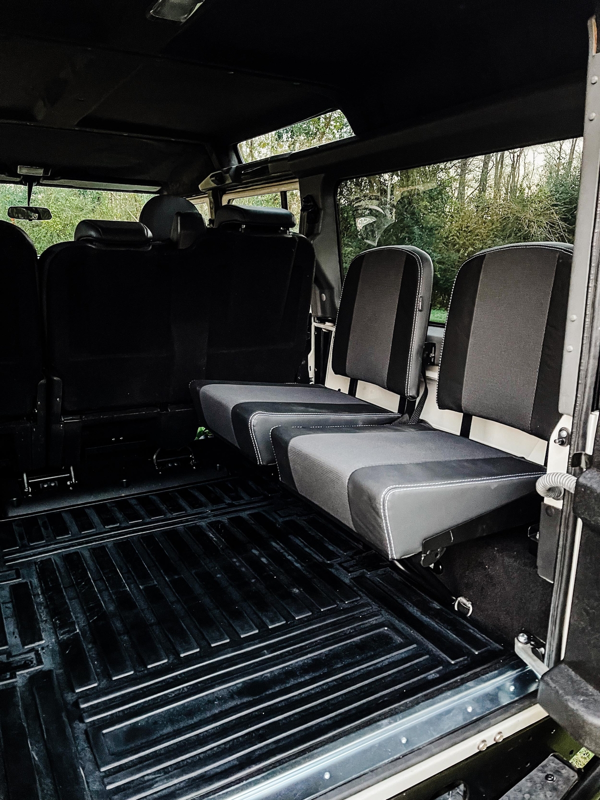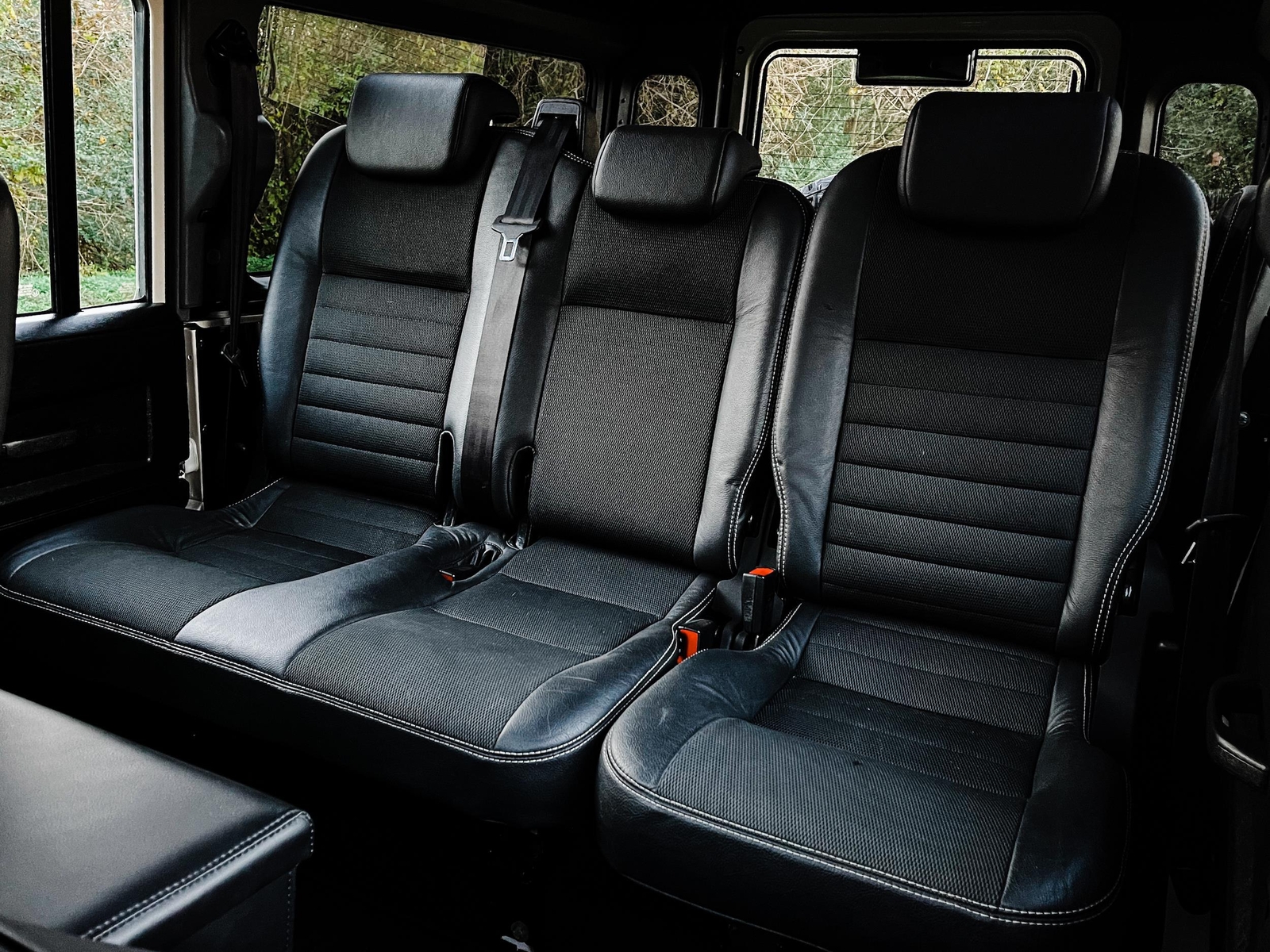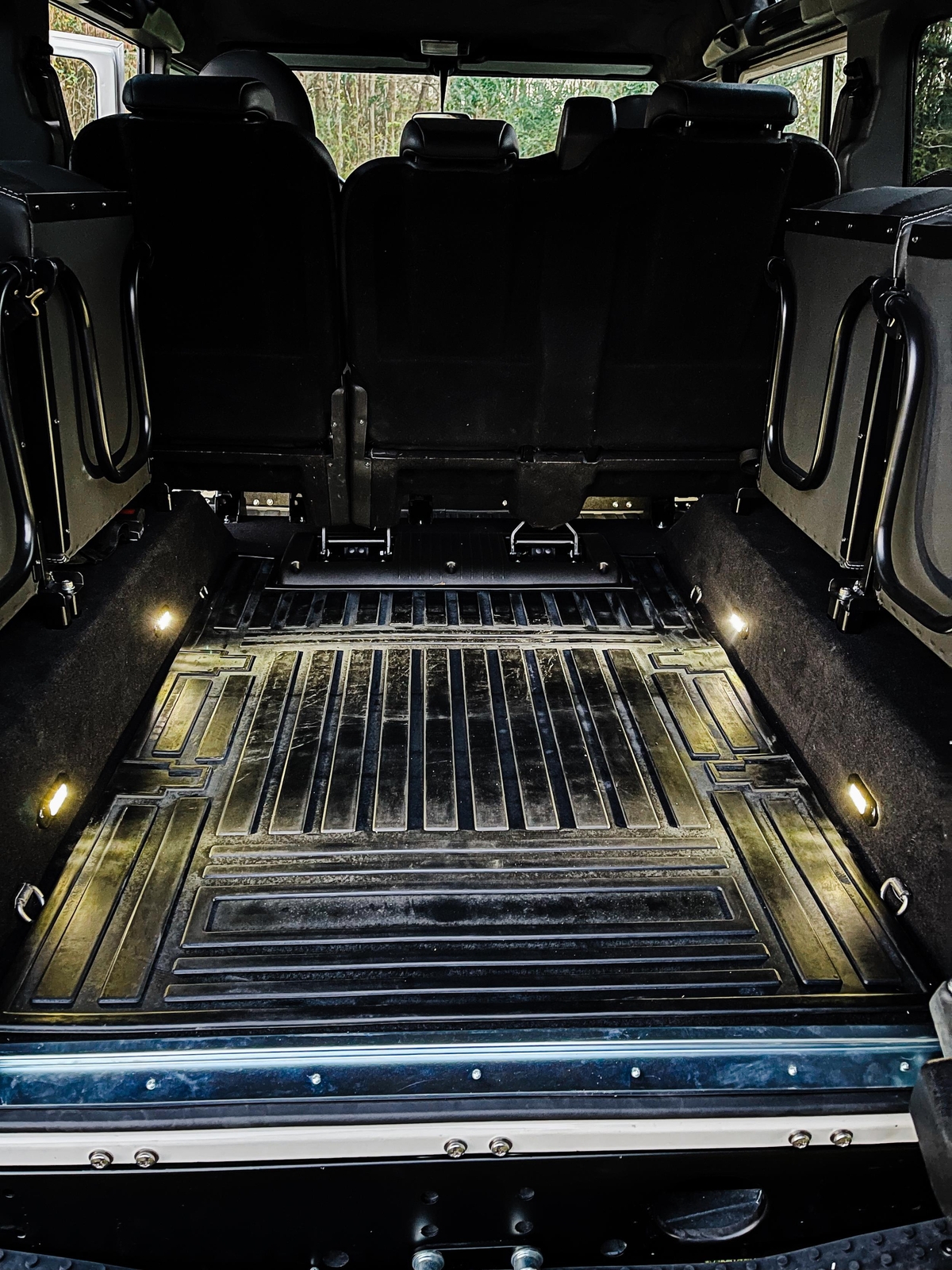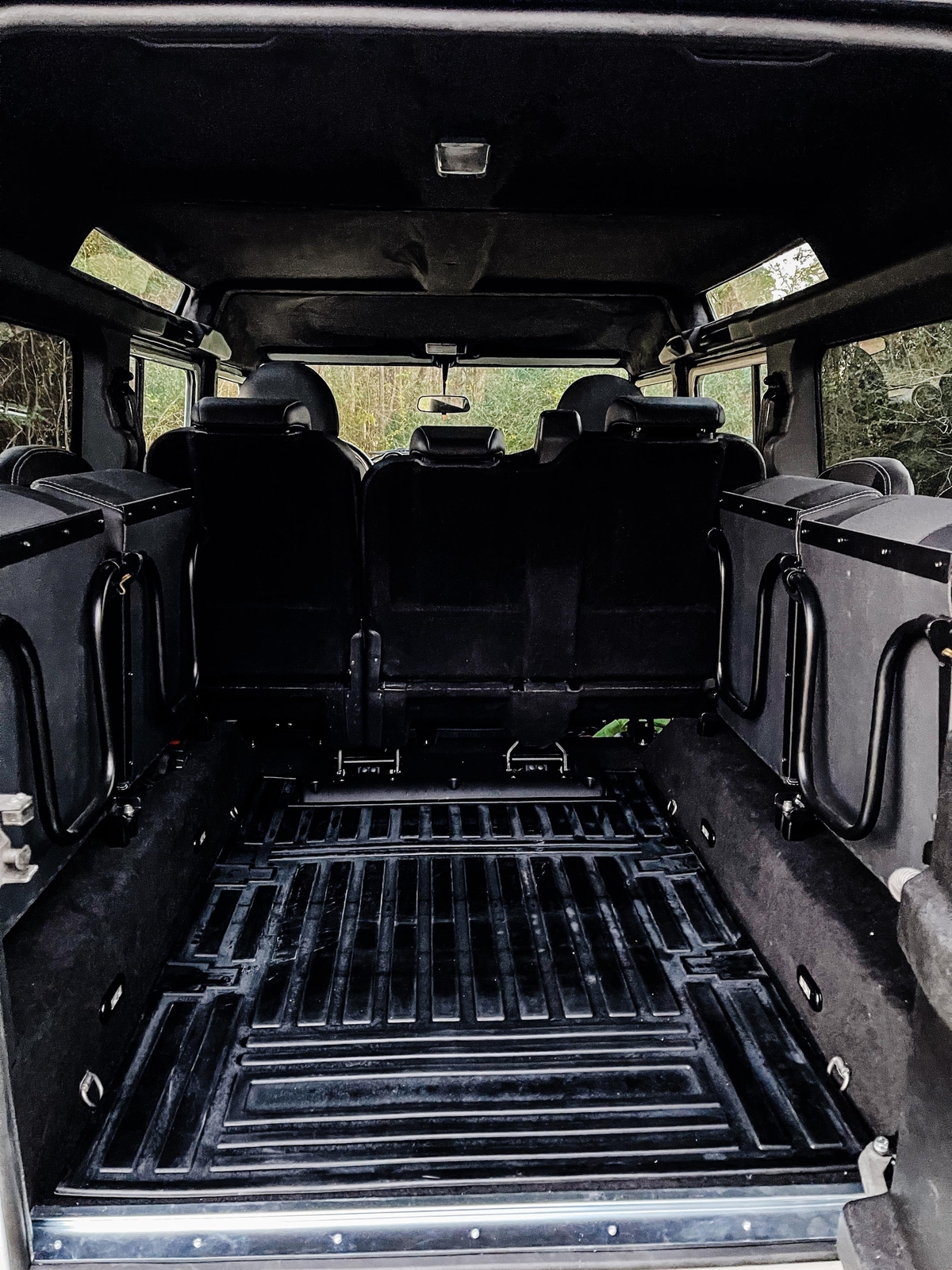 Satin black, powder-coated tubular side steps assist with ingress and egress to the very well-appointed passenger cabin, where you’ll find a modern-style dash that provides excellent heating and air conditioning — ensuring the occupants are comfortable year-round. The heated front sport seats are upholstered in Exmoor Trim® XS-Spec Black Rack & 1/2 Leather with contrasting white stitching, as are the 3 flat-folding, high-back middle-row seats, and 4 stowable, side-facing rear seats. This 9-passenger Station Wagon is equipped with rear air conditioning nestled in the leather-wrapped center console, providing your guests with additional cooling on those hot summer days. The console is also fitted with a convenient storage cubby, a wireless fast-charging pad for mobile devices, USB charging points, and two oversized aluminum cup holders. The front windscreen is heated for those extra-brisk mornings, and to top it all off, the headliner is swathed in Charcoal Alcantara. Unlike many others, this premium SUV offers true utility — swing open the rear cargo door and you’ll find over 56 cubic feet of usable space — and heavy-duty rubber floor mats protect the fully carpeted footwells and rear cargo area.
