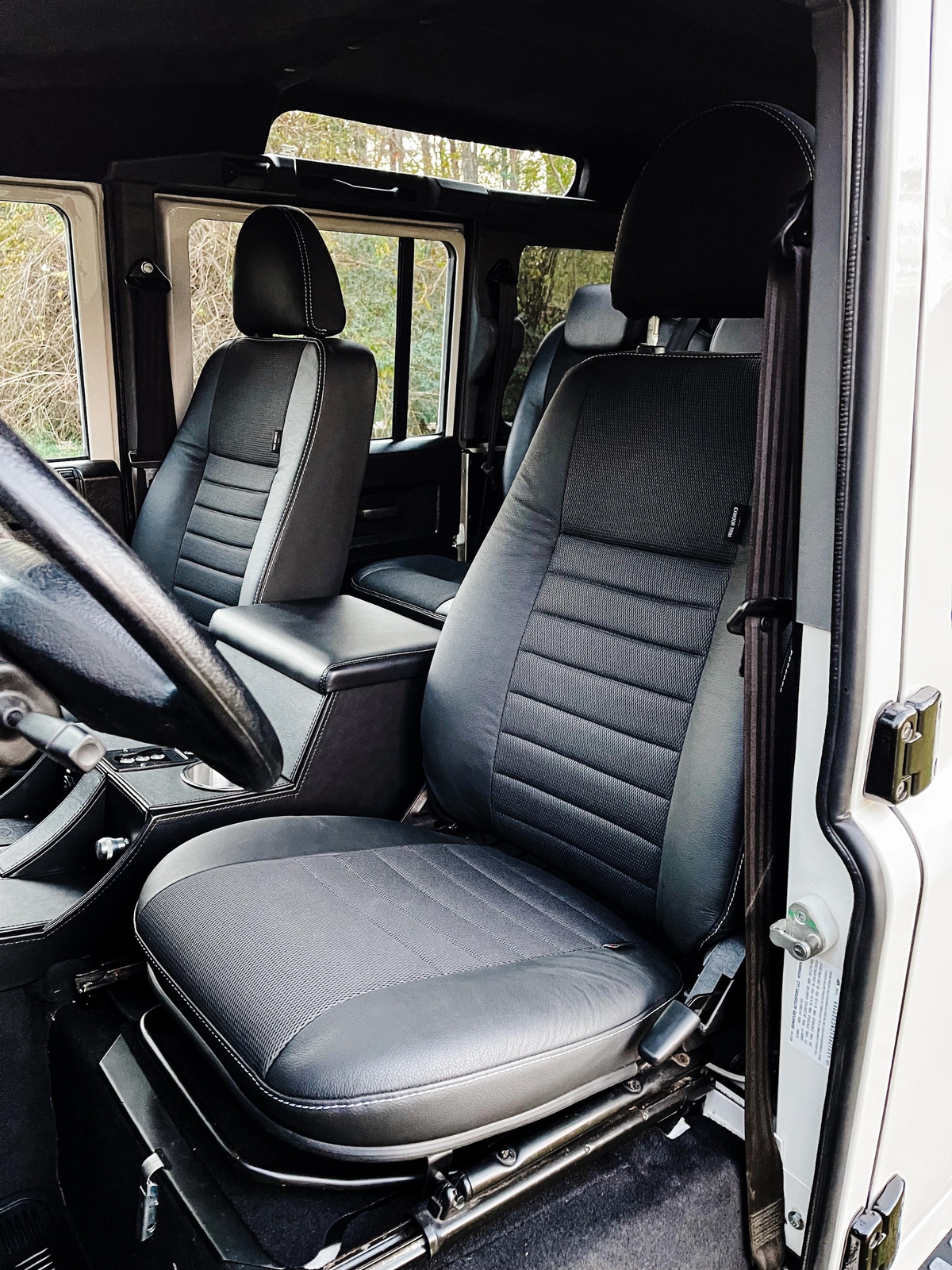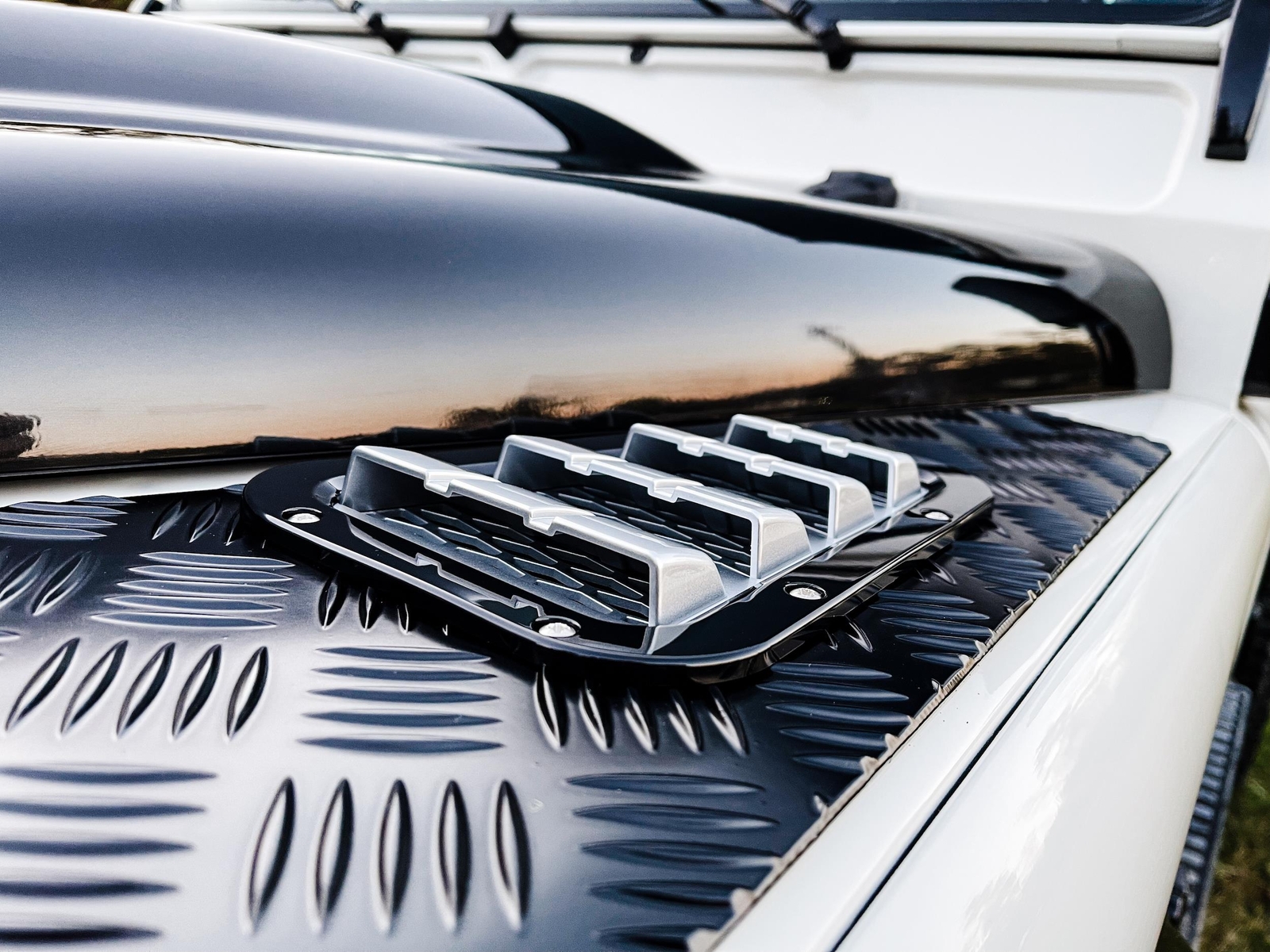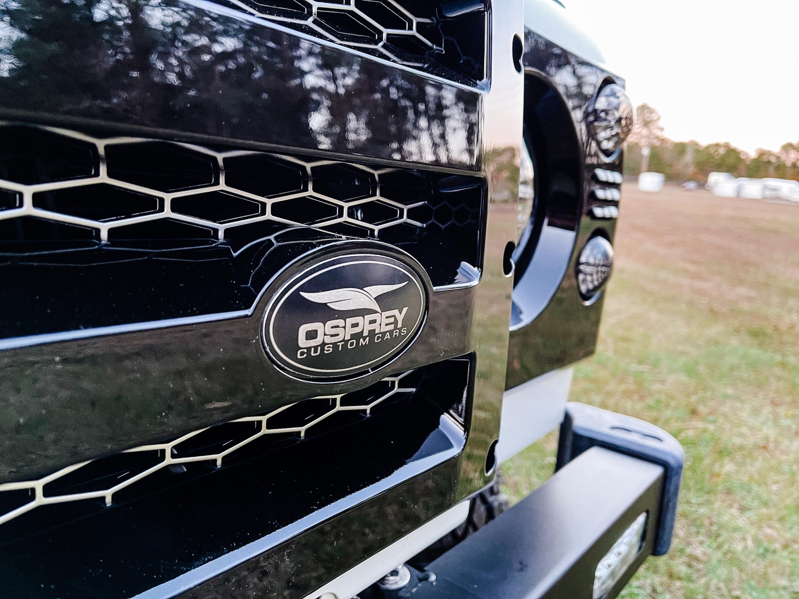 The body, expertly finished in crisp Fuji White with contrasting gloss black roof, wheel arches, and trim, was carefully reunited with the chassis once back from our in-house body and paint shop. The deep-tinted, flush-fitting rear side- and rear quarter-glass panels lend an air of modern sophistication. “Osprey” engraved black anodized aluminum exterior door handles compliment the black billet aluminum door, bonnet, and windscreen hinges and enhance the stealthy appearance. The front end was treated to gloss black wing top chequer plate protection, a gloss black premium grille with custom “Osprey” badging, gloss black light surrounds, and side intake and forced-air wing top vents finished in gloss black with silver accents. The front bumper is home to LED running lamps, and the tubular rear step bumper accommodates a high-definition rearview camera, a 2" hitch receiver, and jacking/recovery points. A heavy-duty, swing-away rear tire carrier neatly wraps up the tail end.