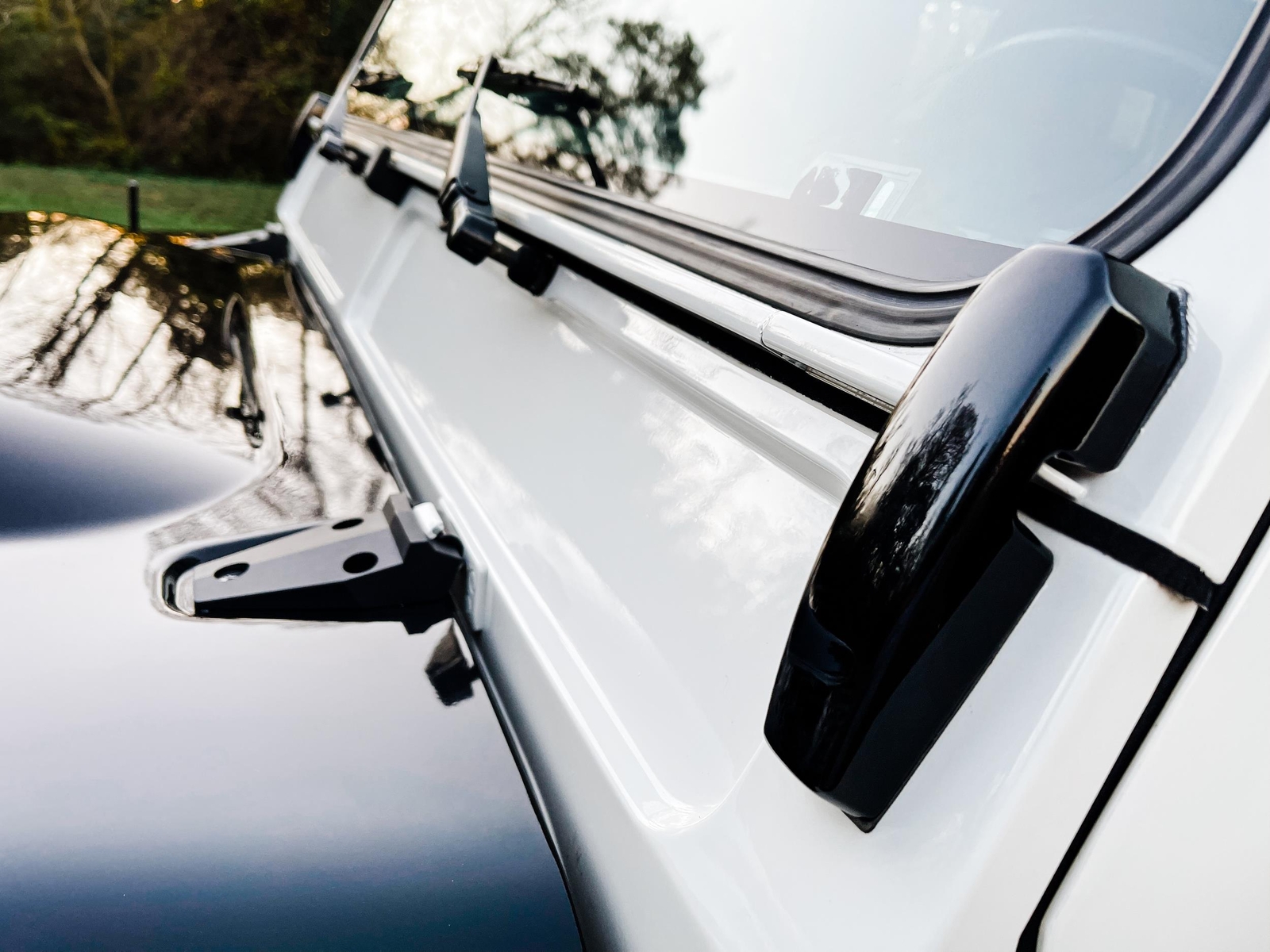 - Black billet aluminum door, bonnet, and windscreen hinges