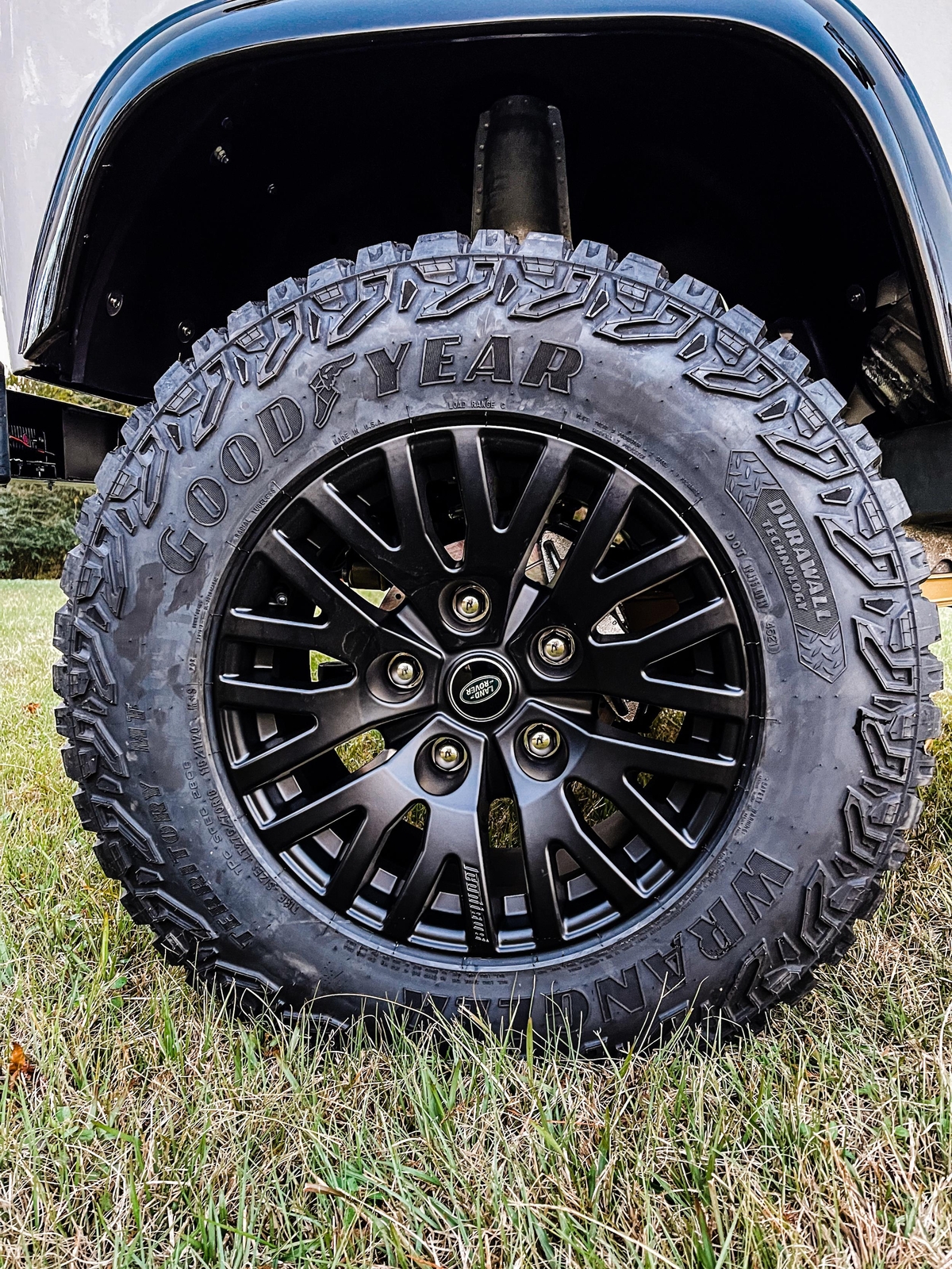 The upgraded, heavy-duty front and rear axles are situated by slightly elevated Terrafirma® shocks and springs, Terrafirma® caster-corrected front and cranked rear radius arms, track rod, drag link, and Terrafirma® steering damper, all protected by a heavy-duty aluminum front skid plate. It rides on bold, satin black 18-inch Iconisus® “ICON7” alloy wheels wrapped with 275/70R18 Goodyear® Wrangler Territory® MT (Maximum Traction) tires — offering superb traction, on or off-road and its open tread design helps the tread clear mud from the tire and provides the traction you need even when the pavement ends.