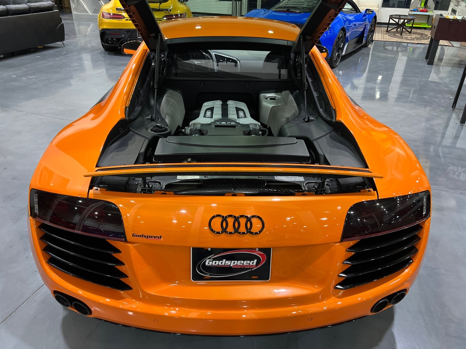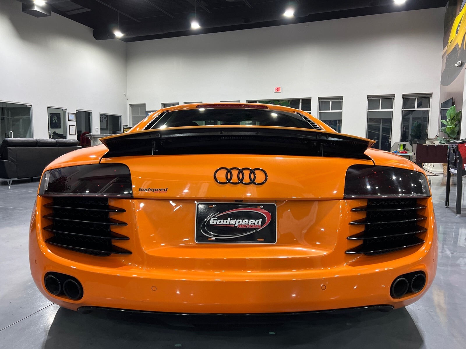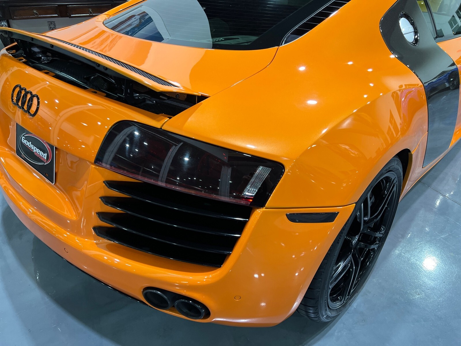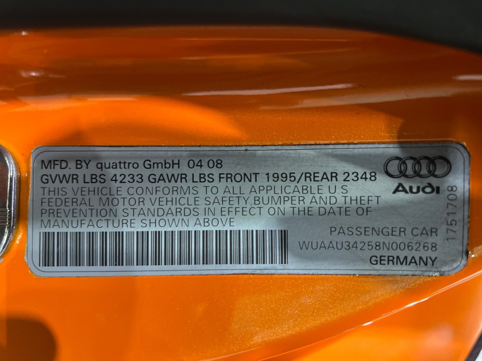 Clean CARFAX, naturally-aspirated 4.2L V8 rated at 420 horsepower, automated 6-speed transmission, custom pearl orange paint, black leather interior w/ leather dashboard/door inserts/door handles, alcantara headliner, carbon fiber side blades, carbon fiber mirror caps, 19 5-arm double spoke gloss black wheels, Bang & Olufsen audio, Bluetooth handsfree phone connectivity, navigation, front and rear parking sensors, back-up camera, and more! Desirable platform with timeless style! $137,100 MSRP when new in 2008! Link to video displaying exhaust sound: ZzX4jNsp7SU Known modifications include: Coilover suspension and cat-back exhaust! Recent service/maintenance include: NEW VALVE COVER GASKETS, OIL CHANGE, ALIGNMENT, and FOUR TIRES! (~$3,000 parts/labor) **Window sticker is a duplicate version, prices and options might vary** MSRP $118,000.00 INSTALLED OPTIONS [PLG] Fine Nappa Leather Seat Trim included [PND] Audi Navigation System Plus 6.5 TFT color display (2) SD card inserts DVD-based maps for US/Canada phase diversity radio data system (RDS) autostore function graduated audio level adjustment (GALA) voice guidance (5) language settings $2,000 [6W9] Front Grille Filler Panel $0 [PL3] Enhanced Leather PKG fine Nappa leather seat trim leather door inserts & door handles black leather dashboard black leather cowl $5,500 [PPD] Premium PKG front/rear Audi parking system w/rearview camera 6-disc CD changer Audi hill hold assist HomeLink Bluetooth phone prep auto-dimming exterior mirrors seatback storage nets luggage net on rear shelf $3,500 [PL1] Leather Elements fine Nappa leather seat trim leather door inserts & door handles $2,000 [9VK] Bang & Olufsen Sound System (12) speakers 10-channel amplifier w/465-watt combined output digital signal processing (DSP) vehicle noise compensation w/microphone True Image $1,800 [6NN] Black Alcantara Headliner $1,300 [6H3] Carbon Sigma Side Blade $2,000 Original Shipping Charge $1,000 RETAIL PRICE (ORIGINALLY NEW) $137,100.00