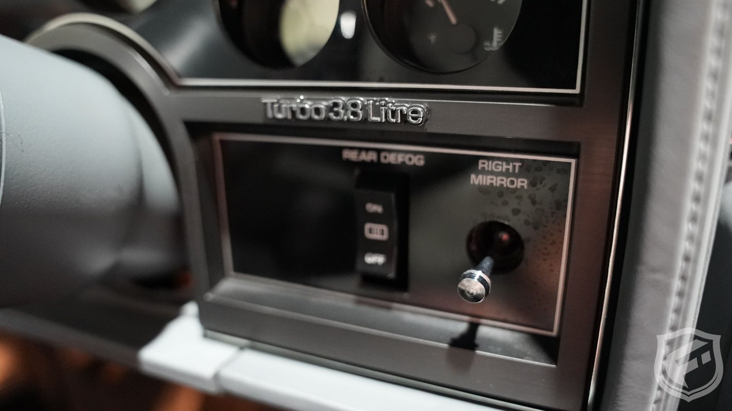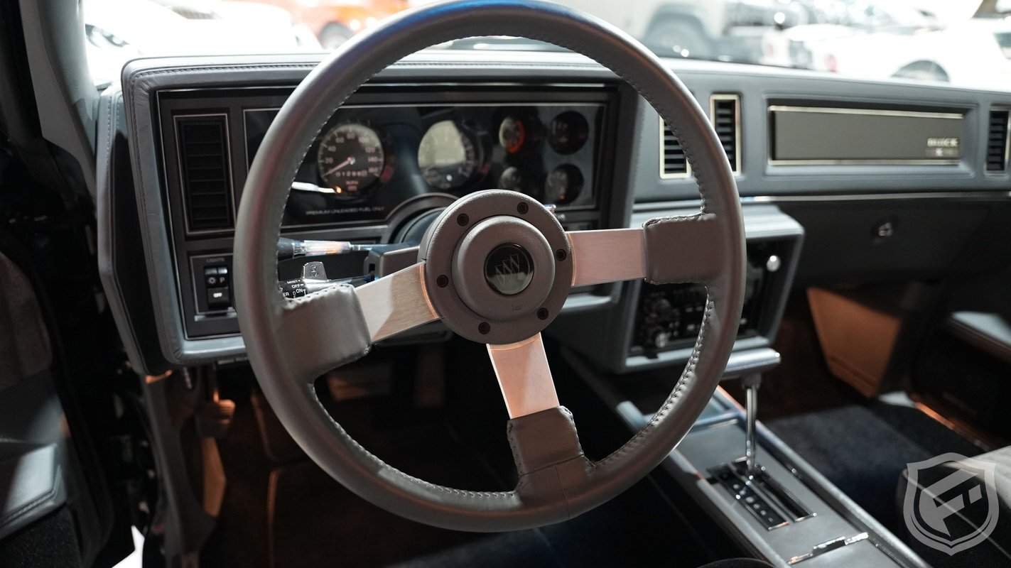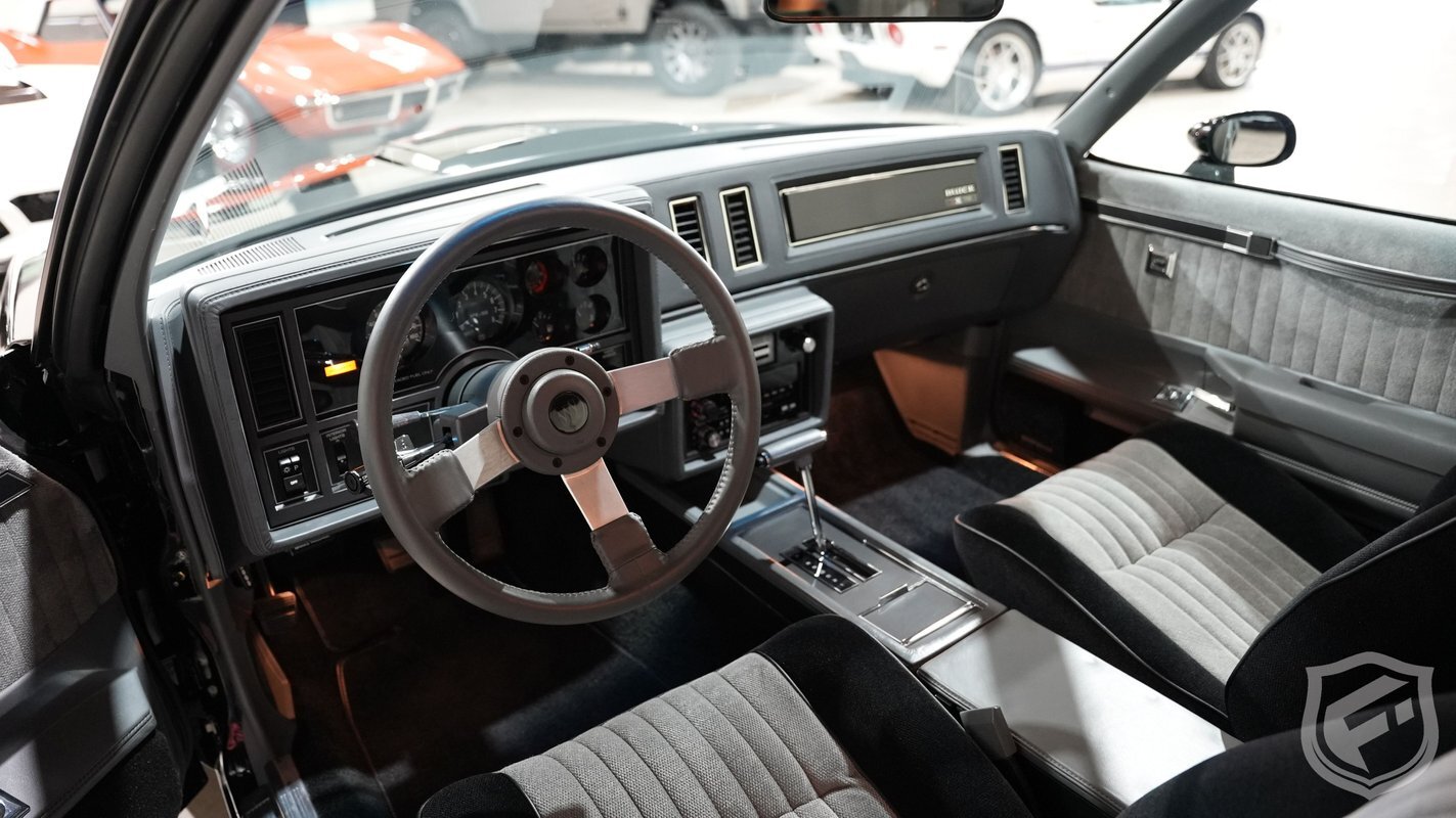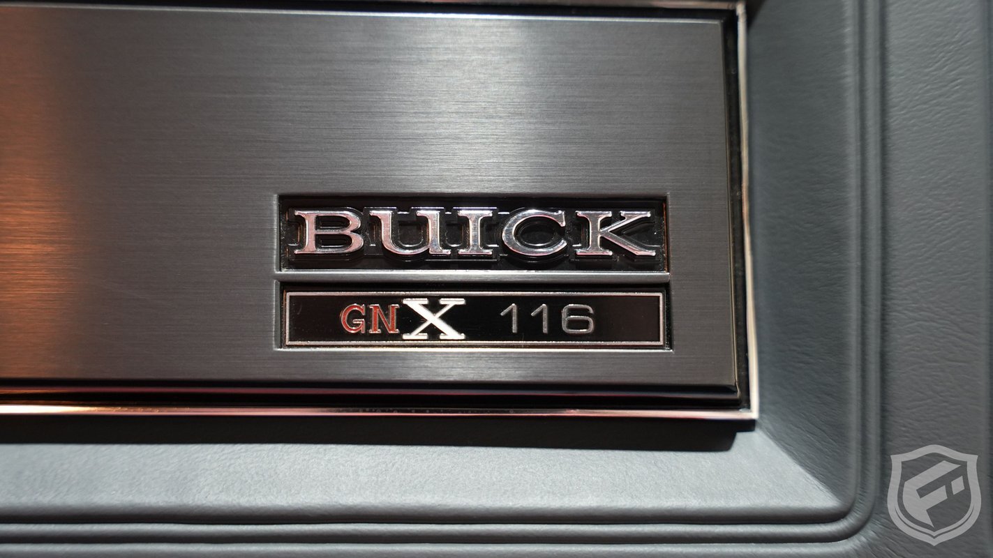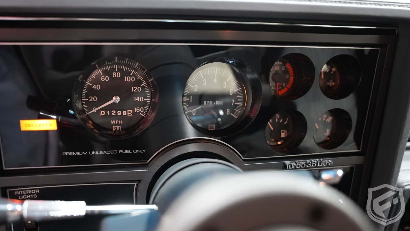 Exterior styling changes include vents located on each front fender, 16 inch black mesh style wheels with VR-speed rated tires, and deletion of the hood and fender emblems. The interior changes of the GNX included a serial number on the dash plaque and a revised instrument cluster providing Stewart-Warner analog gauges, including an analog turbo boost gauge.