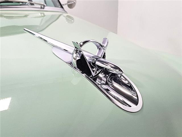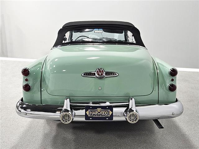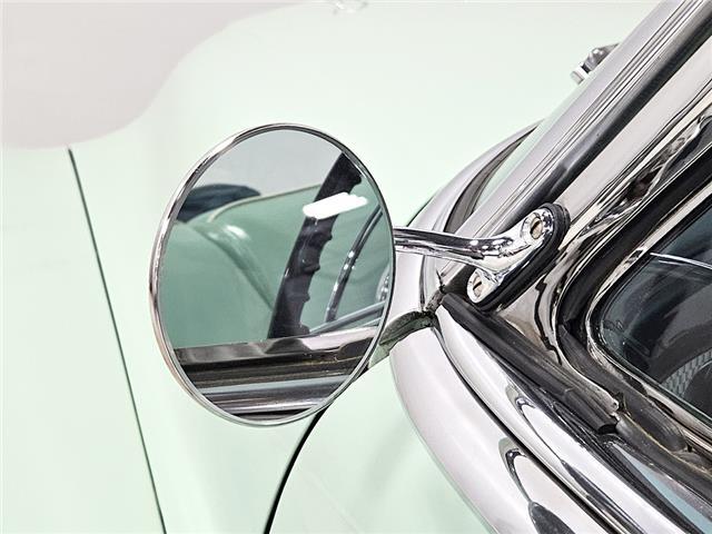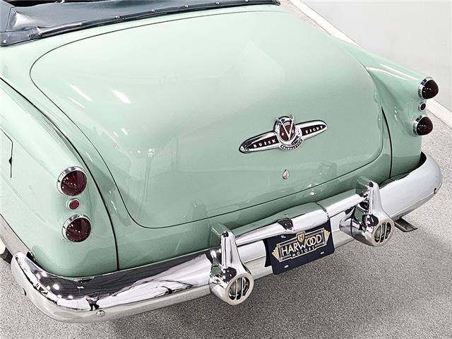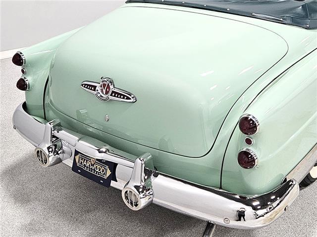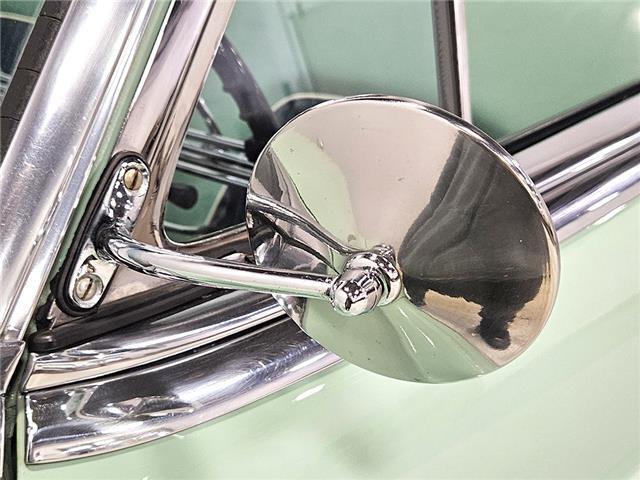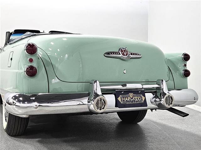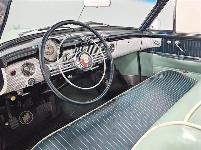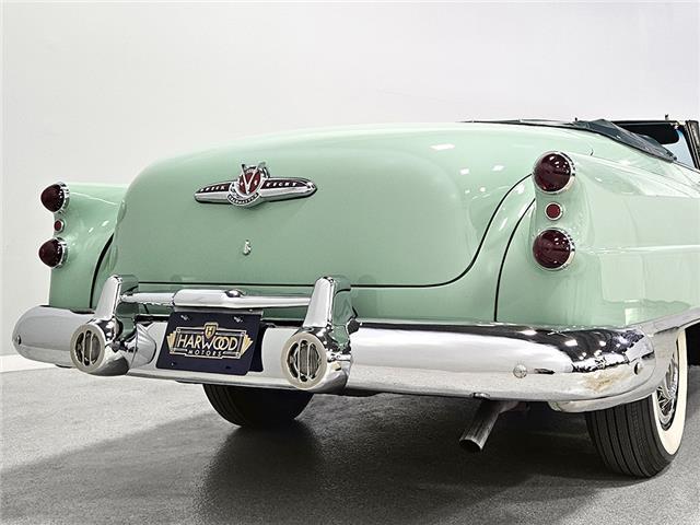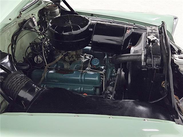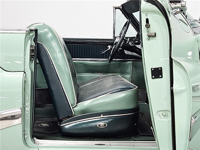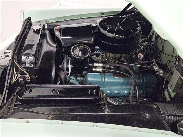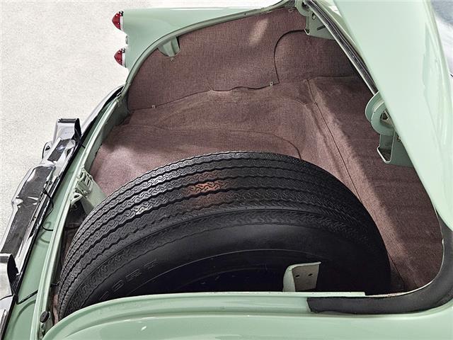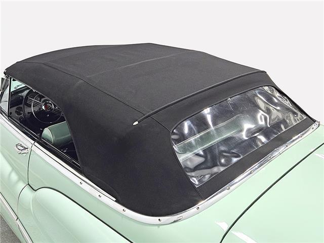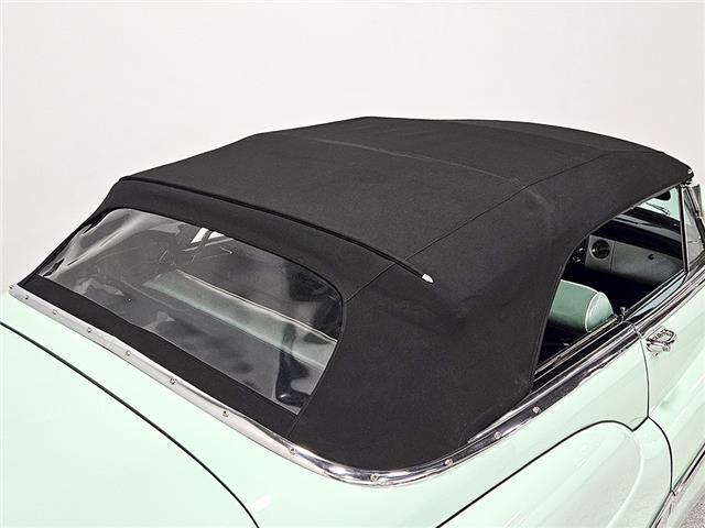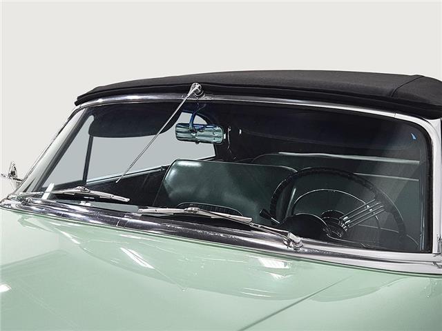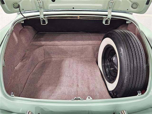 The matching two-tone green interior is likewise how this car was built in 1953, and it’s quite stylish with contrasting white piping. The door panels continue the theme and were restored with the rest of the interior, and the carpets offer the proper nap and texture. The instrument panel is a cool pattern that stretches from end to end, and the gauges are contained in three round pods that are easy to read. The big steering wheel is color-matched to the interior and shows both a “POWER STEERING” callout and a 50th anniversary emblem on the horn button. The original AM radio works and has a supplemental connector that will enable you to use your phone, a great feature! Even the clock ticks away reliably over there on the passenger’s side. Power windows, a power seat, and a power convertible top were standard equipment and the entire hydraulic system has just been serviced so they all work like they should. And speaking of the top, it’s beautifully fitted black canvas with a correct green vinyl boot to give the car a finished look. Back seat space is big enough for real-sized adults and there’s a massive, well-upholstered trunk that includes a full-sized spare tire.
