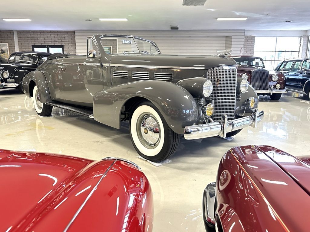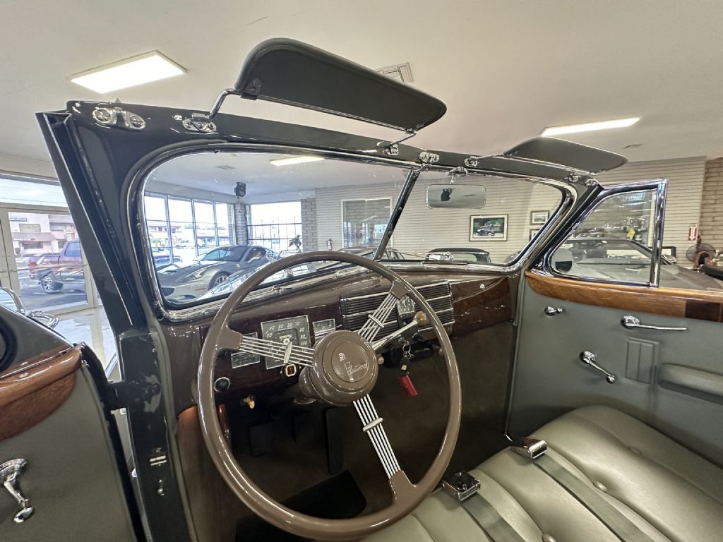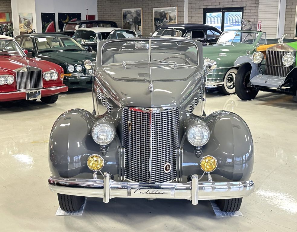 We are pleased to offer for sale this gorgeous 1938 Cadillac 75 Series, Fleetwood Bodied Convertible Coupe, Style 38-7567, Body Number 20 of 44 produced, Vin No. 3271124. A complete body-on restoration, to concours standards but intended also for touring. The quality of the restoration is easily qualified to show at the finest of concours events, including Pebble Beach. Importantly, of the 44 Series 75 Cadillac convertible coupes made in 1938, this is one of only two that were built without side mounted spares. Within the classic car hobby, the side mount deleted cars are considered by far the most beautiful because of the unbroken lines that make the car look much longer and sleeker. The side mounts really shorten the look of the front. So this is only one of two ever made. A brief history of the car: Built in Detroit and shipped by truck to the South Chicago Cadillac Agency where it was sold. It did not spend a lot of time in Chicago, as the owner found a business card in the trunk when the restoration was started from a tailor shop near Wilshire Blvd in Los Angeles with a telephone number of WA-0691 (dates to the 1950s). Ed Gunther a long-standing member of the Cadillac LaSalle Club remembers this car being for sale in L.A. back in the 60s. It was sold and Ron VanGelderen restored the car the first time and it was awarded a Senior Badge from CCCA, #697 back in 1975. It was also the cover car for the January 1986 issue of the Self Starter with an accompanying story of the car. Dick Haeberle from New Jersey owned the car which was sold in 1992. It then bounced up to New York for a while owned by Burdette Pomeroy who sold it in 2000 and the present owners purchased it on Feb 15th, 2003, from Randy Hall of Saratoga CA. Randy had purchased the car while he was restoring his 1938 75 Series Convertible Sedan. The car at that point was somewhat drive-able and in need of a total redo. Shortly after that the ten year nut & bolt restoration began. Features of the car: To put it mildly this is one massive automobile with a 141-1/2 wheelbase. All 75 (V-8s) and 90 (V-16s) series Cadillacs in this era were on the same chassis and almost identical custom built Fleetwood bodywork. They were offered in many different custom built body styles, the majority being seven passenger sedans This is one of two non-side mounted 75 Series convertible coupes made in 1938. New features for 1938 were, the gearshift was moved from the floor to the steering column. Also new for 38 was the fact that there was no longer a rumble seat on this model, instead there were two jump seats behind the main seat giving this car a trunk that is almost seven feet deep! The car is equipped with the following options: pleated (or tufted) main seat, a working master radio with a cowl mounted antenna, very rare script Cadillac 6 diameter amber fog lights, a cowl mounted heater-defroster unit, full wheel discs, two outside rearview mirrors and the correct car jack and period tool kit. There is also an original, never used key case from the delivering dealer! Additional features that have been added for safety and comfort are: a Gear Vendors Overdrive unit for better drivability (as the only rear end ratio offered was a 4.58), two period correct Harrison under seat heaters for greater comfort while motoring with the top down. These units became an option for Cadillac about two years later, front seat extenders moving the seat further back and tilting it back also giving a much more comfortable driving position, a master dis-connect electrical switch, a Pertornix solid state ignition system, two lap style seat belts, 5 Michelin radial tires with the sidewalls buffed clean, self-cancelling turn signals that are incorporated into the fog lights and rear lights, a special tonneau cover for the entire rear compartment in addition to the regular tonneau , The convertible top is lined for greater comfort, a concealed period motorcycle siren, an enameled CLC badge on the grill as well as a small enameled Saint Christophers badge on the dash, two flag stanchions on the front bumper, two vinyl cases for the engine side panels (should they be removed in very hot weather, and an electric fuel pump to aid in starting after the car has been sitting for long periods of time. The engine block and its internal parts are from a 1948 Cadillac (this was the engine that was in the car when we purchased it. All other parts of the entire engine are period correct. This practice of swapping the 346 Cu. In. engine was very common as Cadillac made this same engine from 1936 through 1948. The restoration was completed about two years ago and the car has been driven about 1,690 miles. It has been shown three times winning first place awards each time. The LaConner Classic in 2016 where it won Best in Show and last summer at the Forrest Grove Concours in Forrest Grove Oregon where it took Best in Class and also the Jerry Hanauska Memorial Award. During the restoration every part of the car was gone over and brought back to original or better than original condition. Where there were minor rust outs or fiberglass all areas were cut out and new steel patch panels put in. The old pieces were saved. There were no corners cut anywhere on this car. The paint is a PPG single stage acrylic enamel for ease of repairs. The wheels were powder coated in a similar color of the leather interior. The outcome of the restoration was above my expectations, it not only looks absolutely beautiful, it drives amazing well for an eighty-year-old automobile. Bumps are hardly noticed while driving. The choice of colors are extremely pleasing and blend very well. Everything on the car is fully functional including the clock and the 6-way adjustable headlights! There are numerous photos of the car during the entire restoration. This magnificent automobile is ready to be shown at any show through any club, or simply driven where ever one wishes to go with complete confidence. A complete file 
