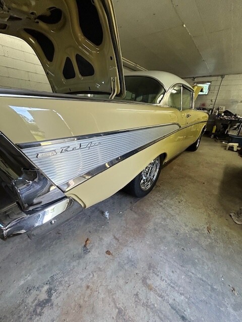 1957 chevy 2 door HT very nice paint 4 small patch panels in floor all factory floor @ trunk pan. all new glass chrome nice new wheels @ tires new dis brake rear drum new dig dash all new in side in boxes need to install my loss your gate Call BOBBY 864-551-3574 for more info.