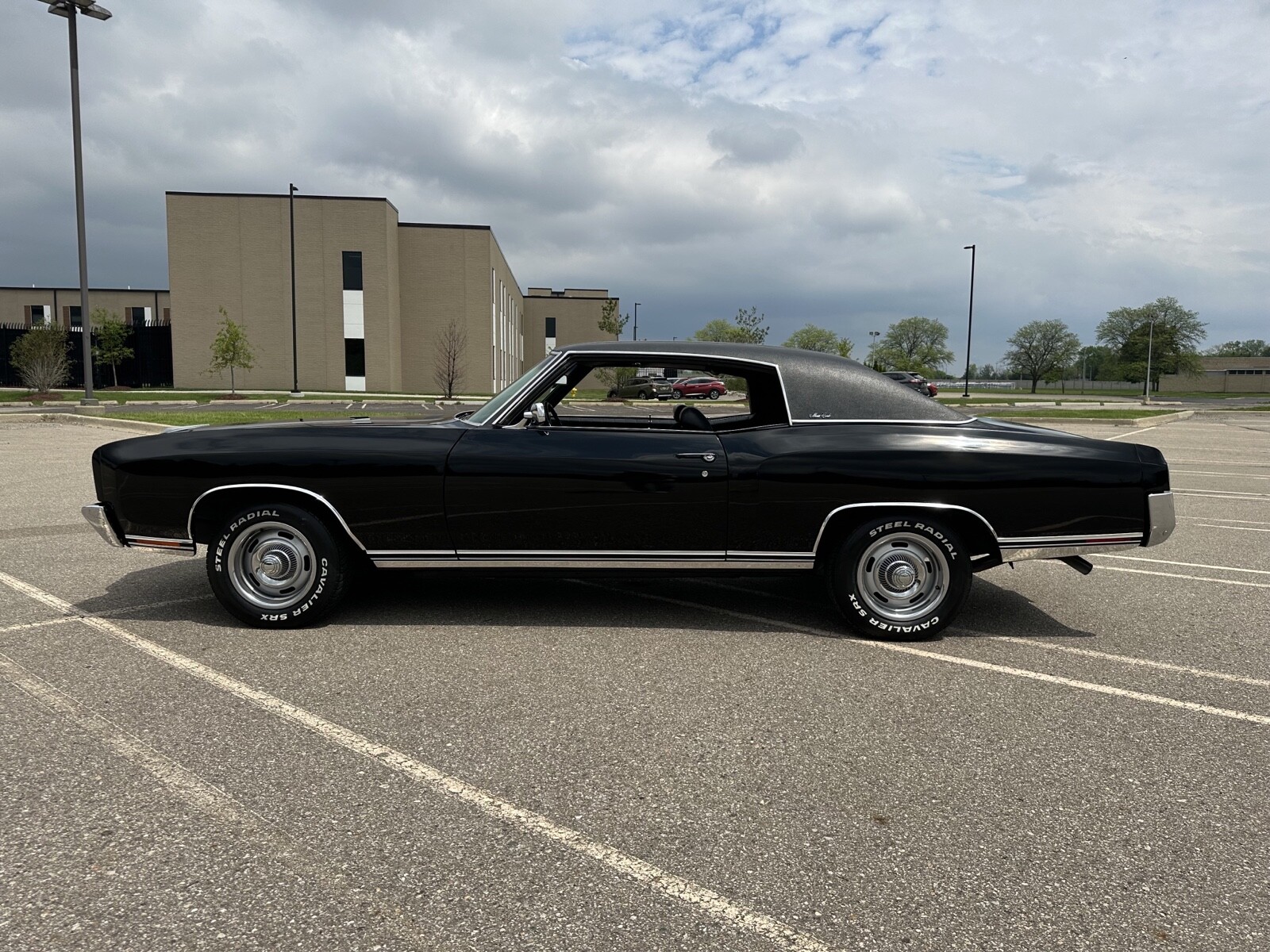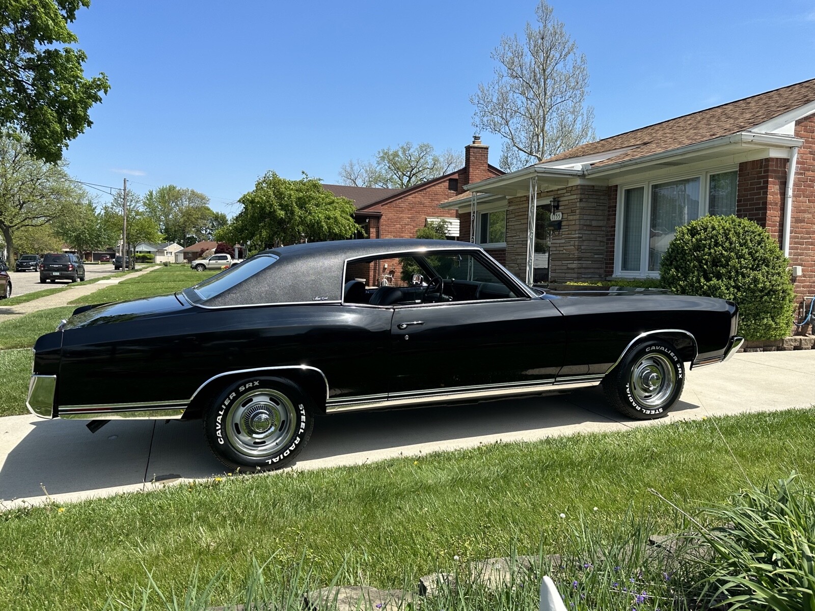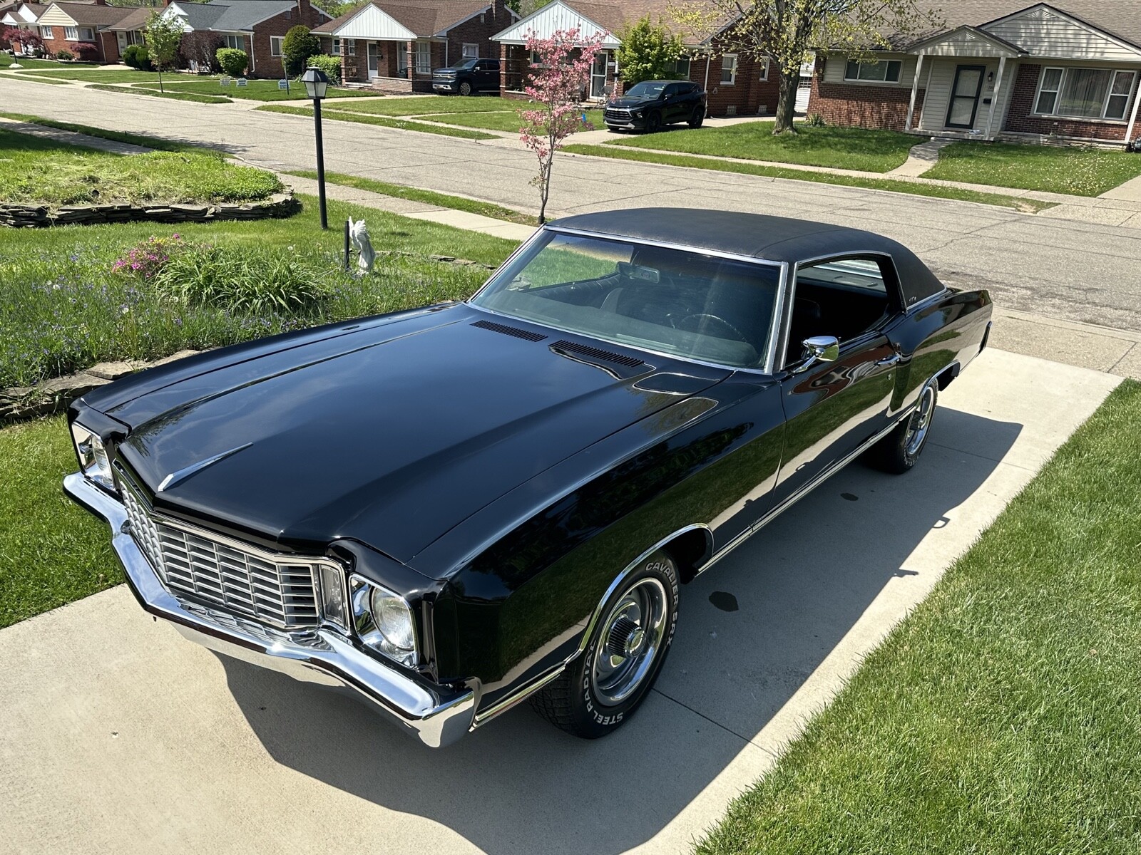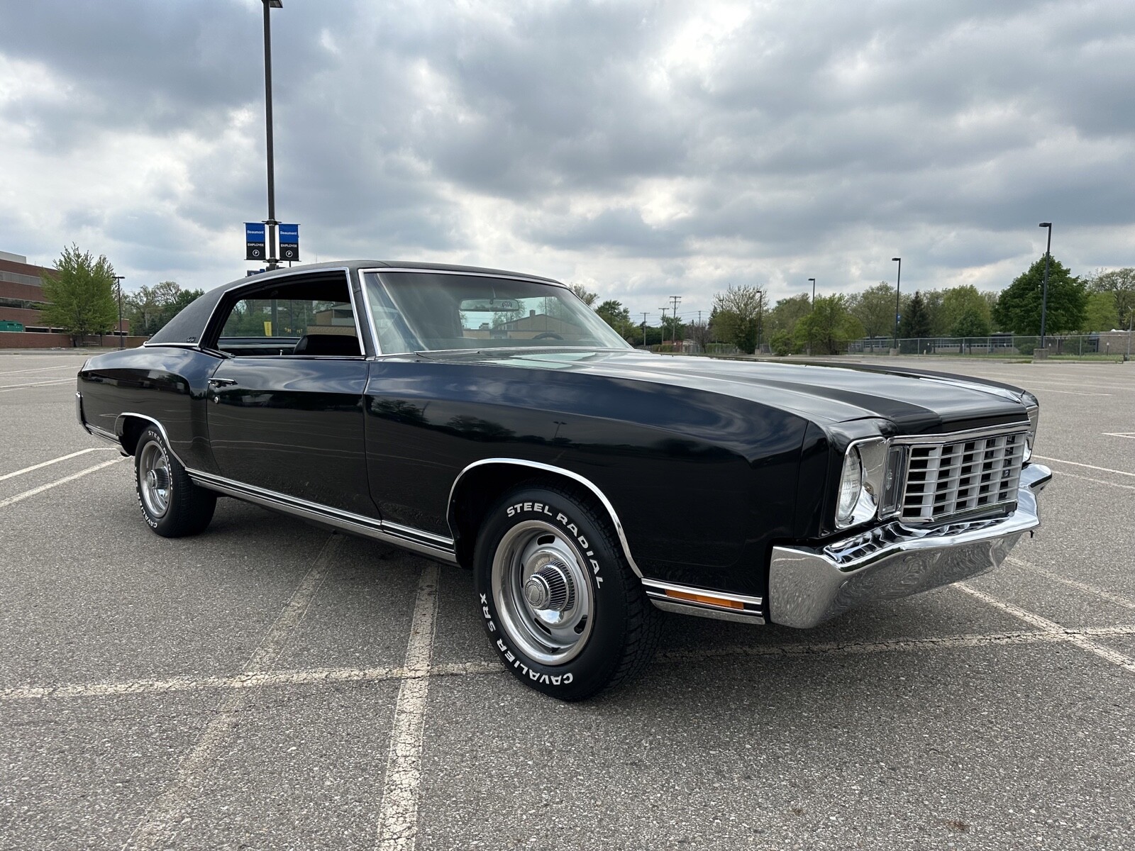 1972 Chevrolet Monte Carlo in excellent shape. Black, black bench seat interior, black vinyl top with Chevrolet rally wheels wrapped in raised white letter tires.
