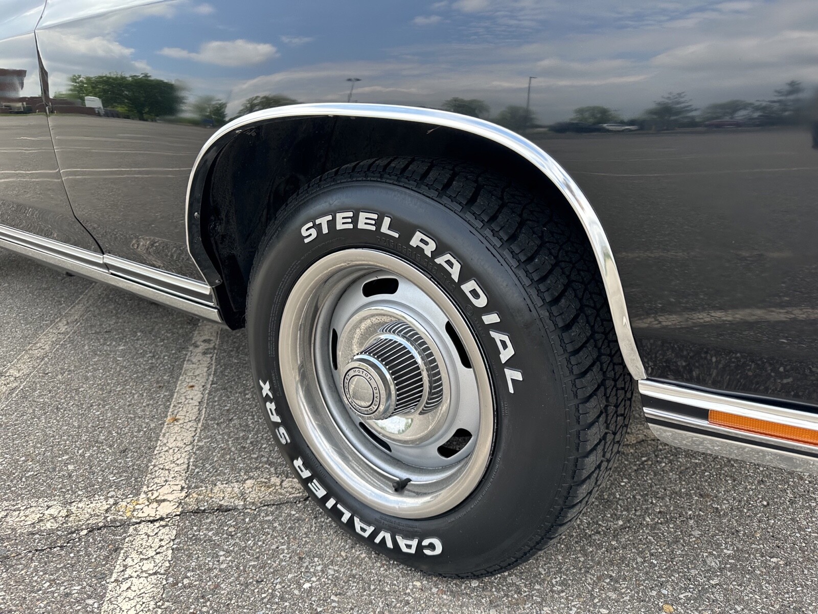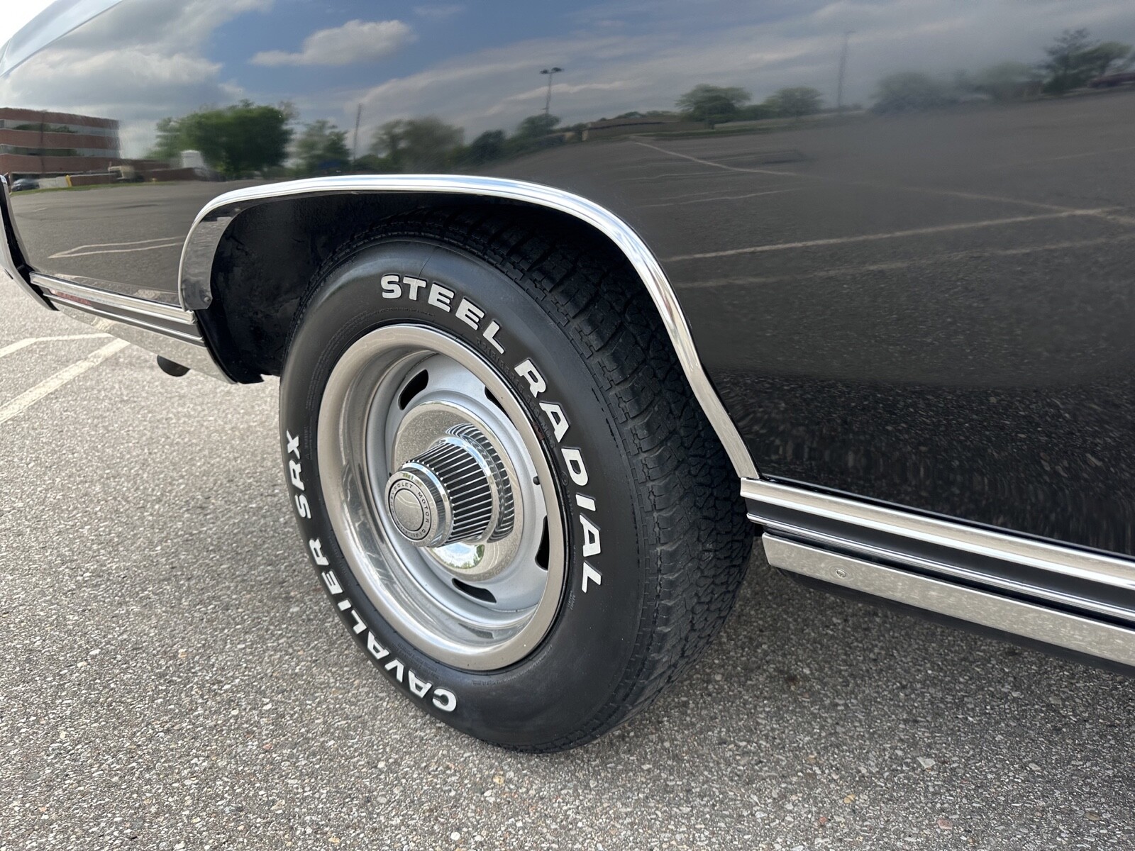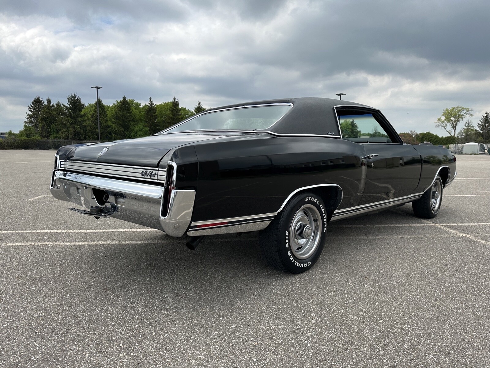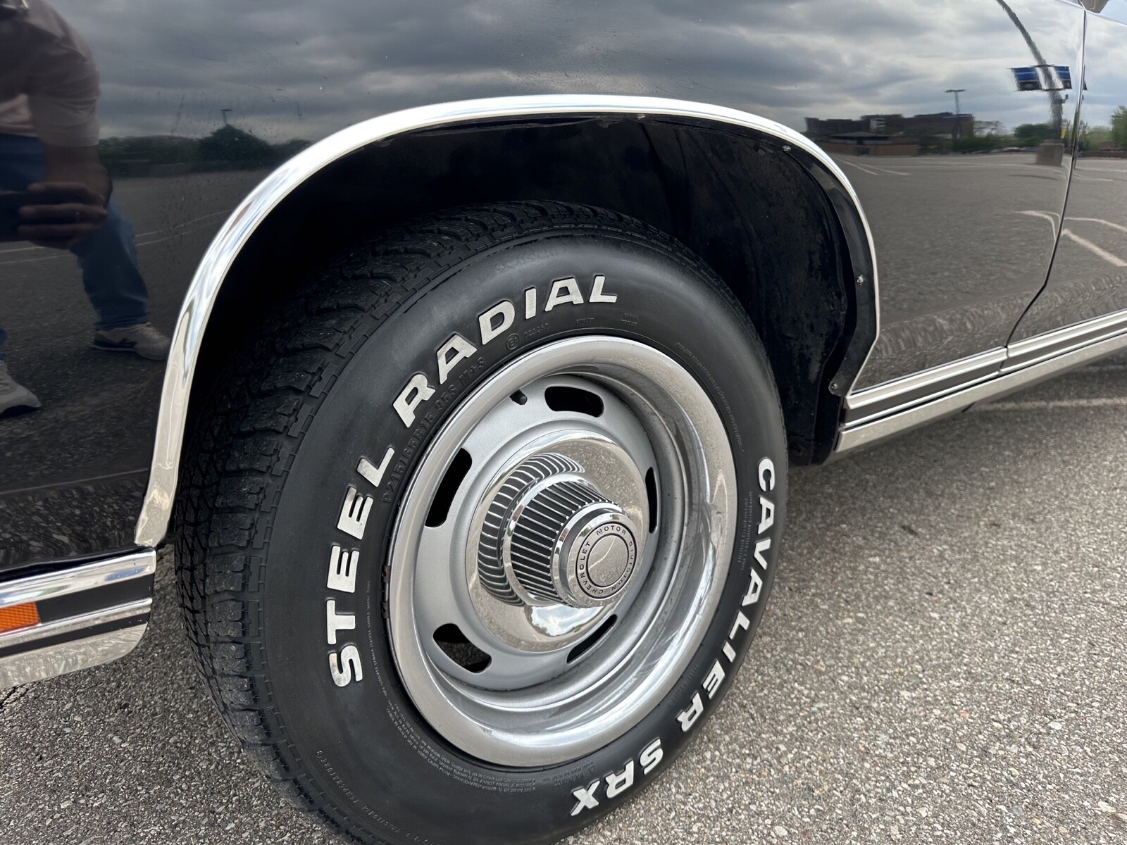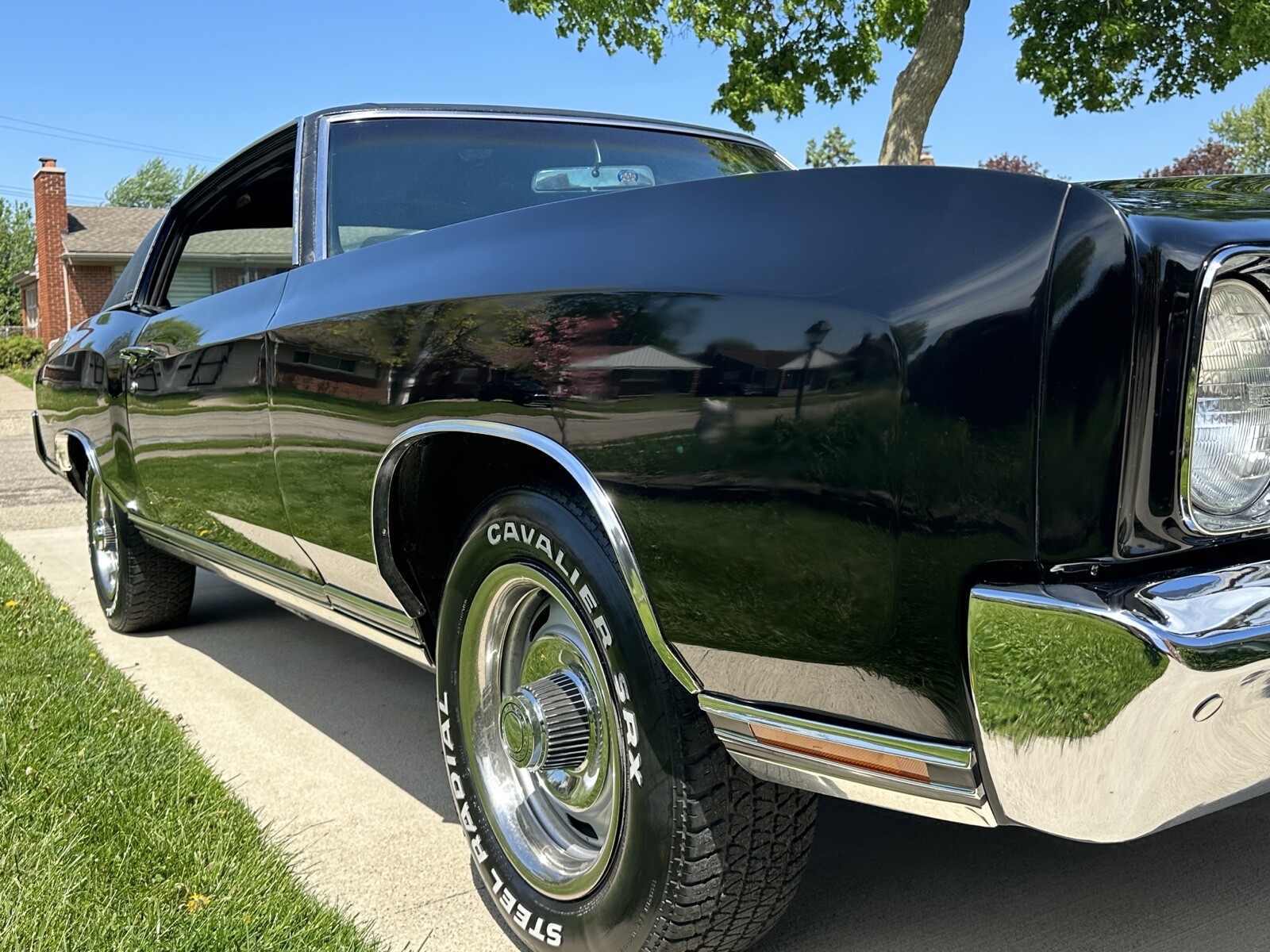 1972 Chevrolet Monte Carlo in excellent shape. Black, black bench seat interior, black vinyl top with Chevrolet rally wheels wrapped in raised white letter tires.