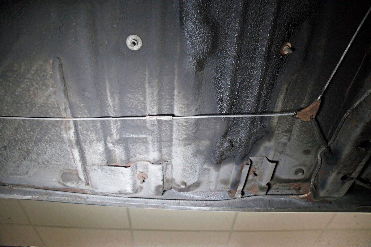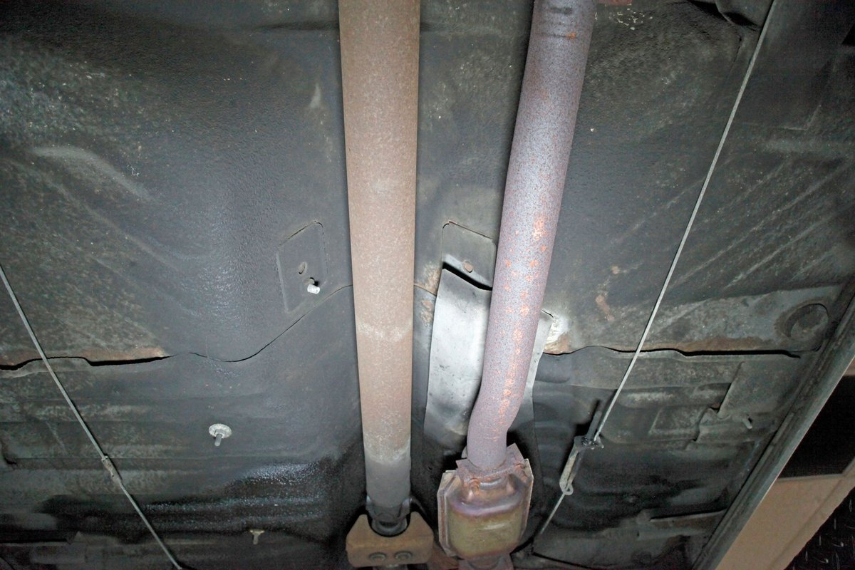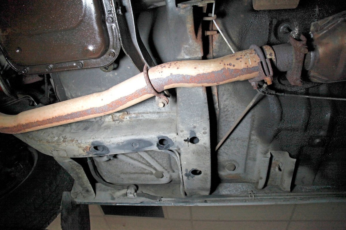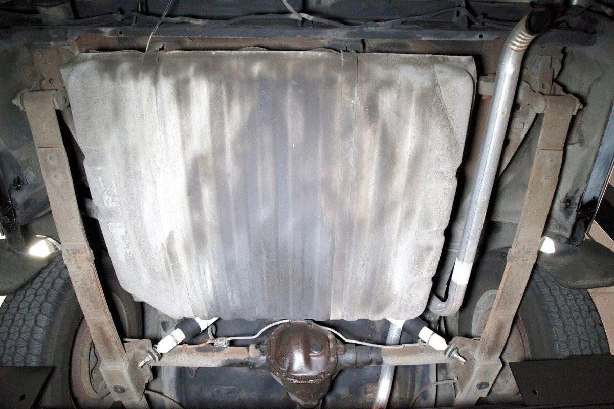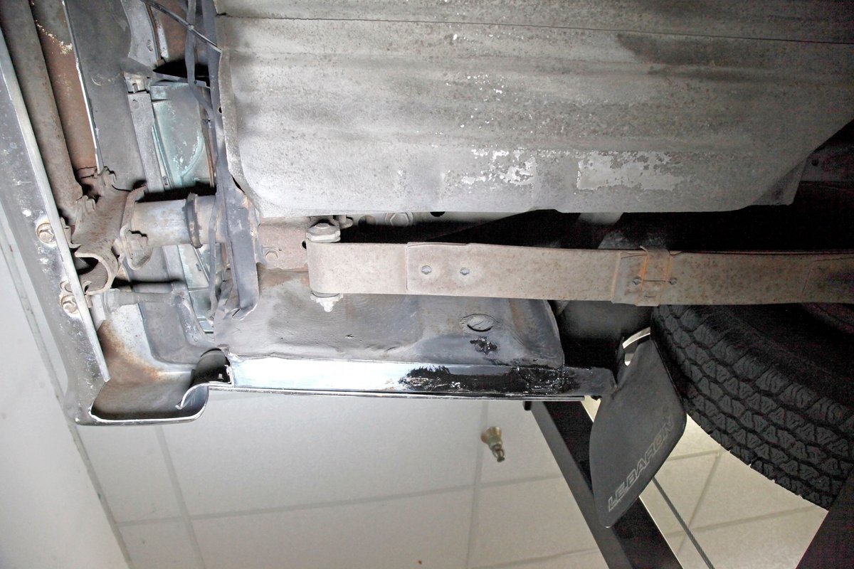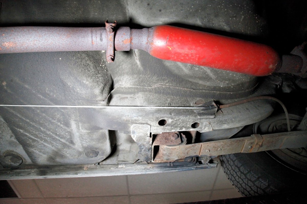 Patina and surface rust is noted throughout. There is invasive rust on the left front unibody rail that has been painted over with fresh black paint but it's still there. The floor pans are solid and there is a cherrybomb glass pack style muffler on an otherwise rusted exhaust pipe. Suspension is front transverse torsion bars and rear leaf springs. Braking is front power discs and rear power drums.