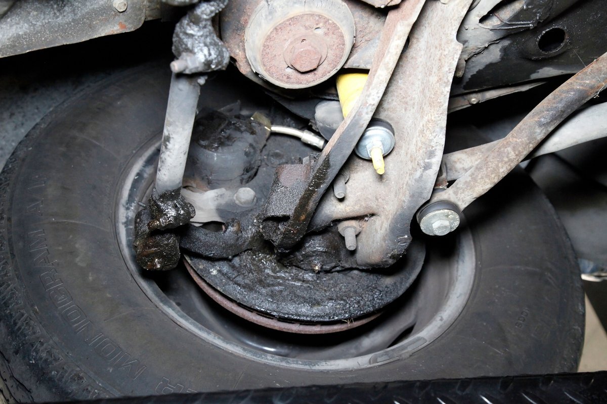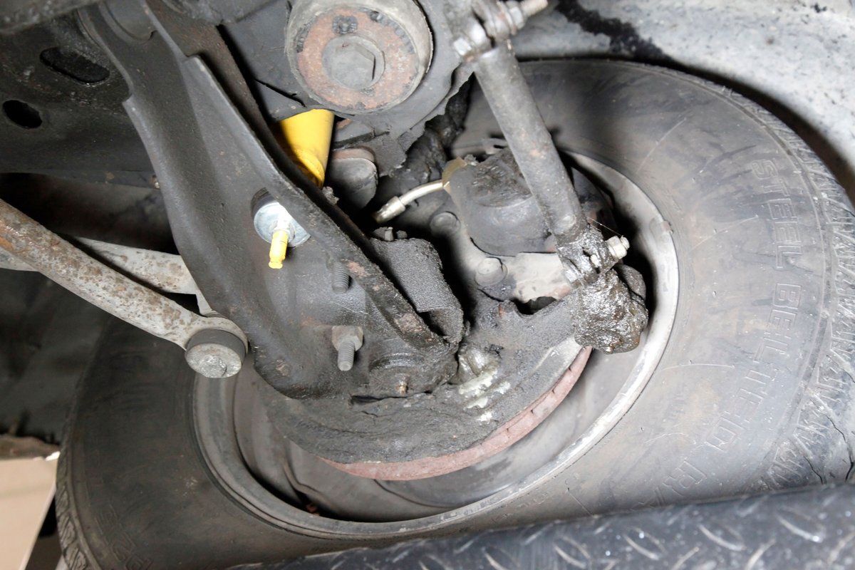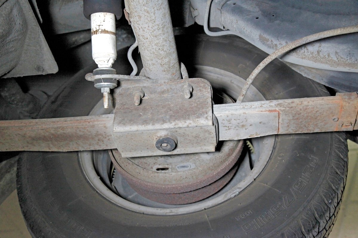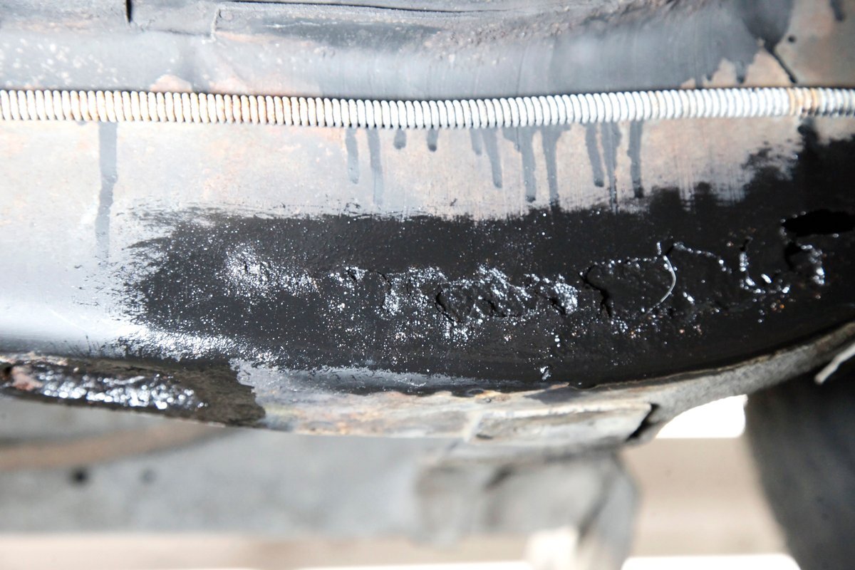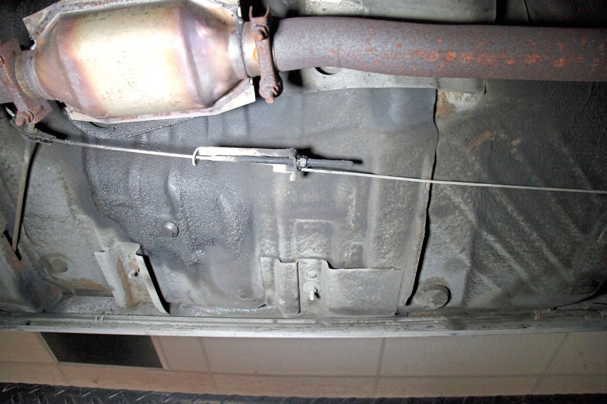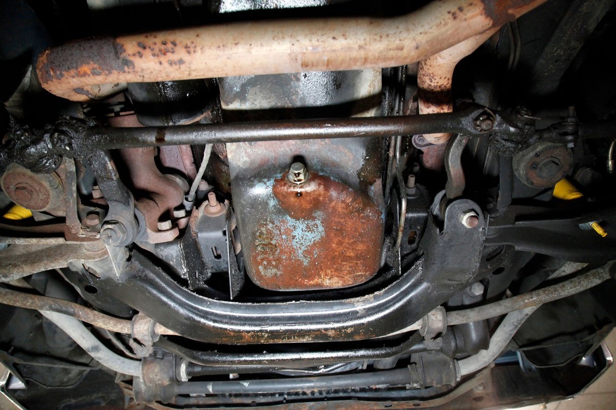Patina and surface rust is noted throughout. There is invasive rust on the left front unibody rail that has been painted over with fresh black paint but it's still there. The floor pans are solid and there is a cherrybomb glass pack style muffler on an otherwise rusted exhaust pipe. Suspension is front transverse torsion bars and rear leaf springs. Braking is front power discs and rear power drums.