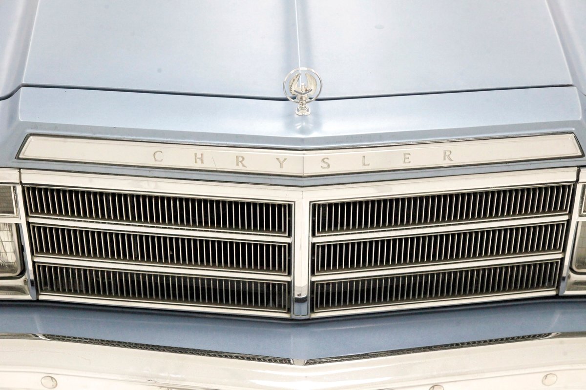 Cadet Blue Metallic covers steel panels all squared off and minding gaps very nicely. In front we see a lazy V outward facing grille with a central egg crate design and a grid of dual head lighting on the bottom with square headlights above dual horizontal running lights to match the lower headlight size. These lights wrap around the corner of the front quarter and emulate the shiny bumper below. A radiator surround is in the blue and a hood ornament is atop. The hood starts its journey rearward to the windscreen which is initially topped with metal roof then it turns to vinyl covered darker blue and we can call it a true landau top with a vertical rectangular opera glass insert. Some darker blue pin striping is highlighting the edge of the body bump out and does a great job of doing so especially on the rear quarter which uses one of the few curved surfaces in the bump out. A nice spacious trunk frames wide rectangular horizontal tail lights made up of 3 squares and trimmed by thin chrome edging. A C H R Y S L E R badge is noted on the bottom edge of the lid and a shiny bumper with inset backup lighting is below. The car rides on 15-inch dinner plate hubcaps and wheels which are wrapped in 215/75R15 thin whitewall rubber.
