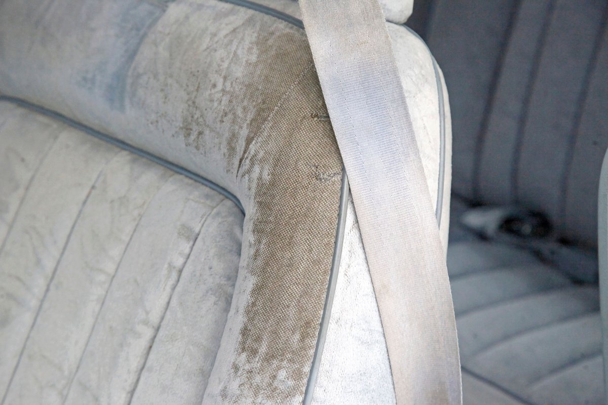 Richly appointed tri tone blue shows up on the door panels and it utilizes a medium blue vinyl as the framing for a central lighter "ice chip" blue panel where we see the door pull strap and armrest. This panel shows as slightly soiled on the drivers side. The lowers are dark blue carpeting and for some extra interest a wood applique panel is behind the window crank. Turning out attention to the inside seating is wide bucket seats meshed together by a center armrest and seat panel.. These are covered by light blue velour broadcloth with smooth bolsters and tuck and roll inserts. Some dark blue piping delineates these surfaces. The driver's upper edge of the seat as you enter the car is worn off off it fuzz. The back seats are also in the dual bucket with central panel format and appear to be much less used. In the upper center is a wood applique panel is noted on the top of the seats. These chairs float on faded and soiled blue carpeting. To the dash where some wood applique wood background wraps around the instruments to create a dash that contains round sweep instruments with brushed aluminum instruments sporting 2 large and a left cluster of smaller rounds just beside these larger rounds. To the driver's right is another panel which houses the temp sliders and a JVC AM/FM/Cassette radio. The padded and stitched dash pad surrounds this panel and cluster and is crack free. On the passenger's side we see an AC vent and another wood applique panel covering the glovebox. The headliner is a solid darker blue vinyl and is a single panel nice and tight.