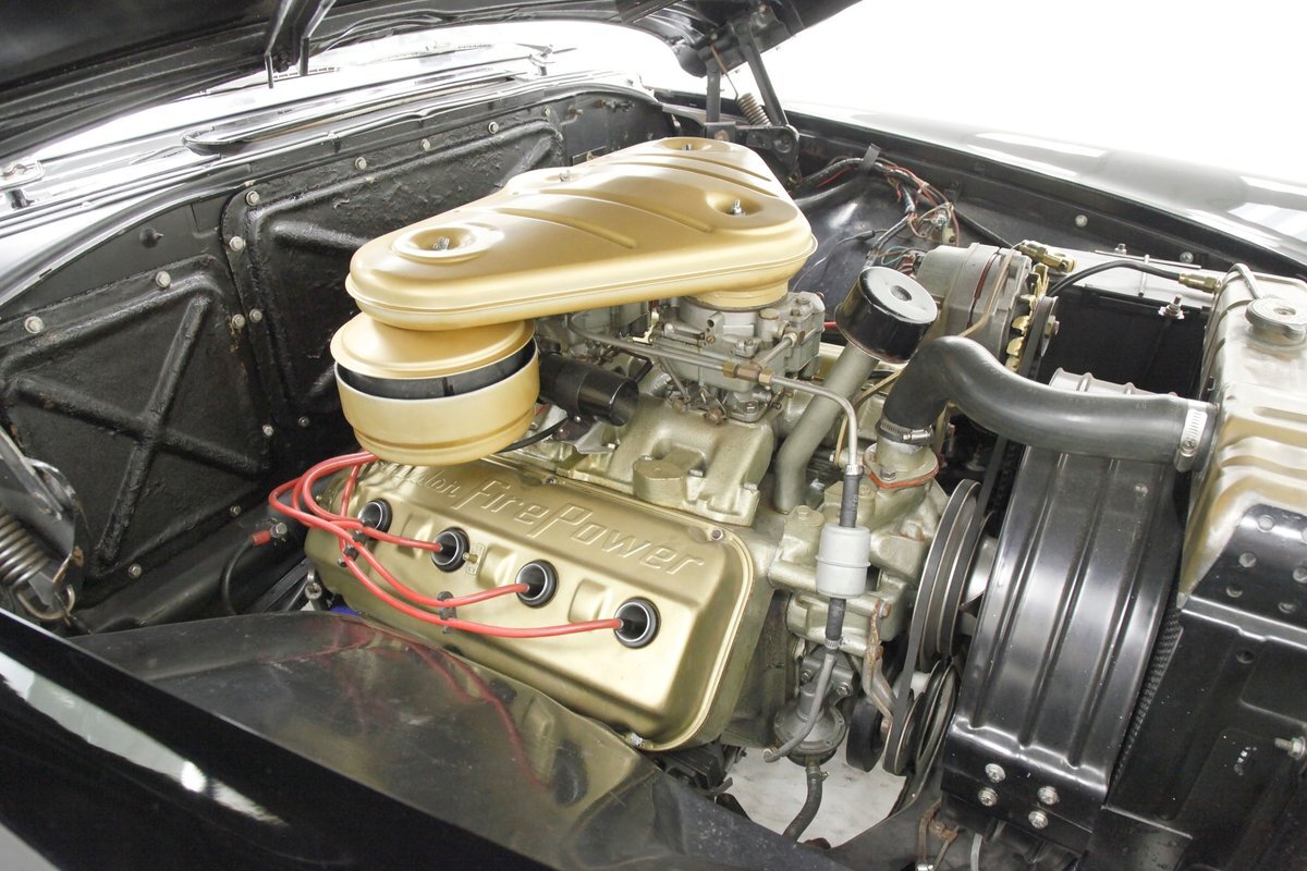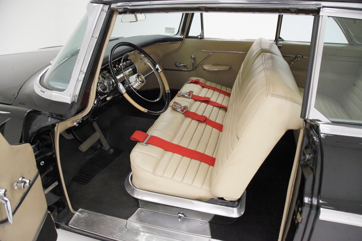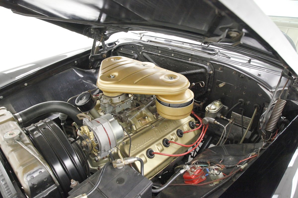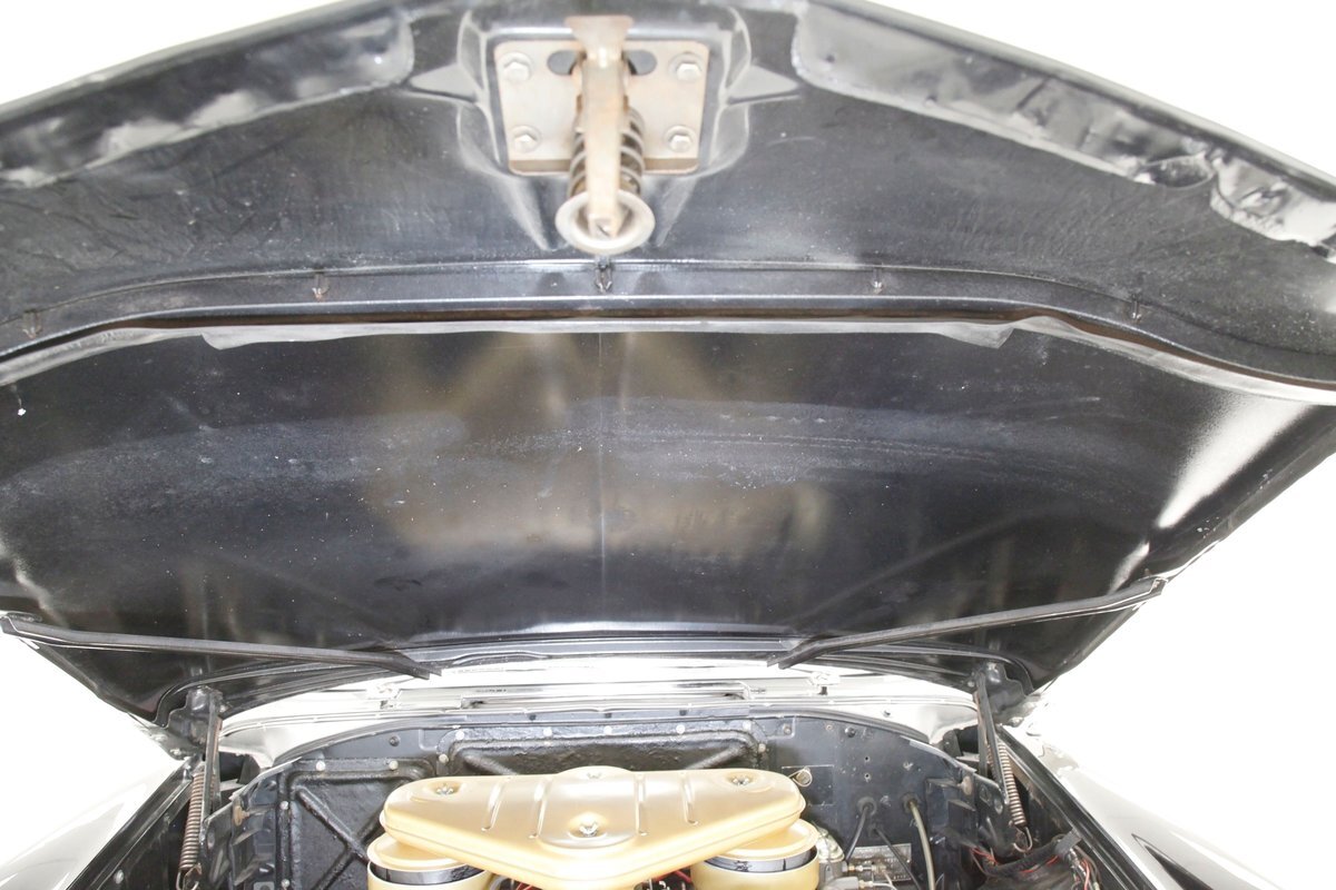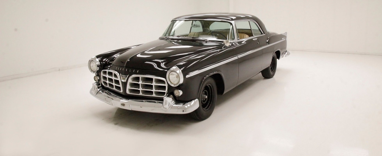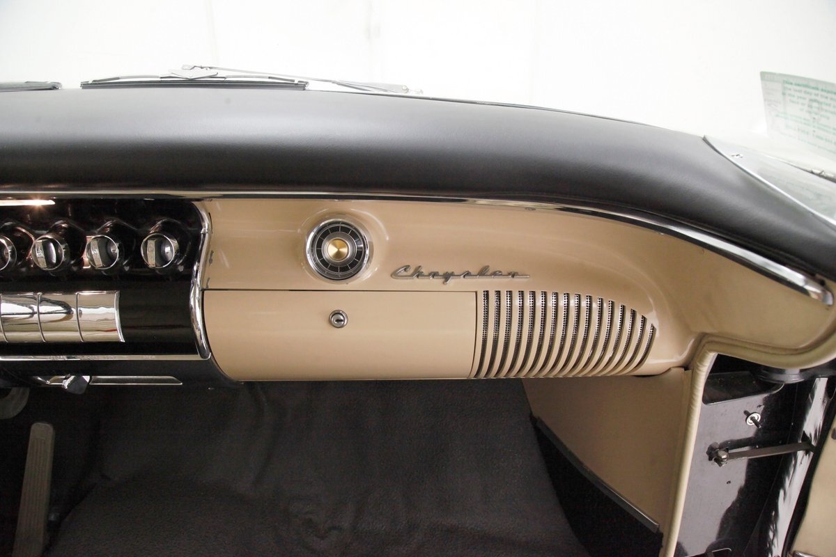 Styled by Virgil Exner and his team, Chrysler had now positioned itself at the forefront of the industry. The new look began with an all new big split egg crate grille set below lowered front fenders and hood lines and boasting heavy chrome. The black paint on this car looks positively radiant under the lights in our photo studio. Make no mistake, this is a big car, but its proportions are cleverly disguised by brilliant design. Starting at the front grille which uses wide openings and heavy horizontal and vertical bars to create the cubby hole grille. It's a dual design and forms a graceful V with a large cloisonne badge in its center on the black bodywork. A single visored bezeled headlight is flanking the grille and these are mounted on the rounded front quarters. A big bumper below emulates the curve to the grille and turn signals and running lights are rounded and placed just below the main head lighting. On the sides is the beginnings of a long chromed trim spear which runs the gamut of the side to the rear bumper. The door panels and slab sides are straight and rust free and other trimmings interrupting the black steel are sparse for the time period, but very effective. A bubble rear glass is seen and this meets up with a large trunk lid and deck. On the back a large bumper is on the bottom and trim spears on either rear quarter panel top create a housing for the tall and thin chrome encased "twin tower" tail lights. Dual exhaust tips peek out the back and black painted 15-inch steel wheels are on all 4 corners and are wrapped by like new 235/75R15 rubber and the factory beauty covers are included with your purchase.