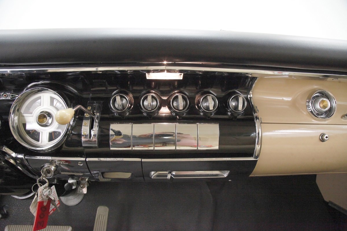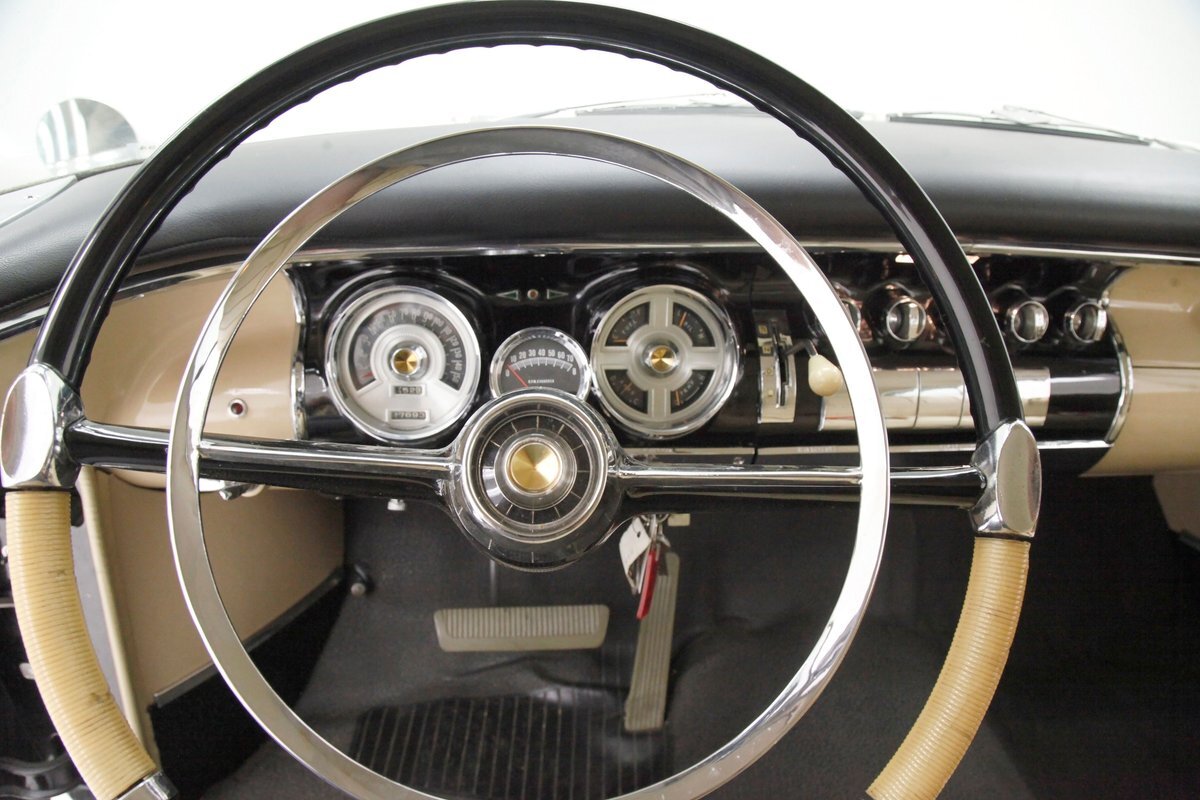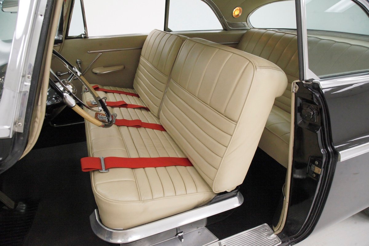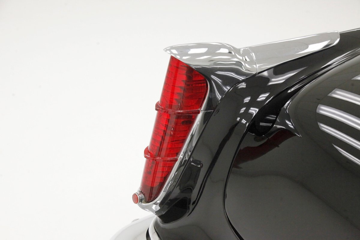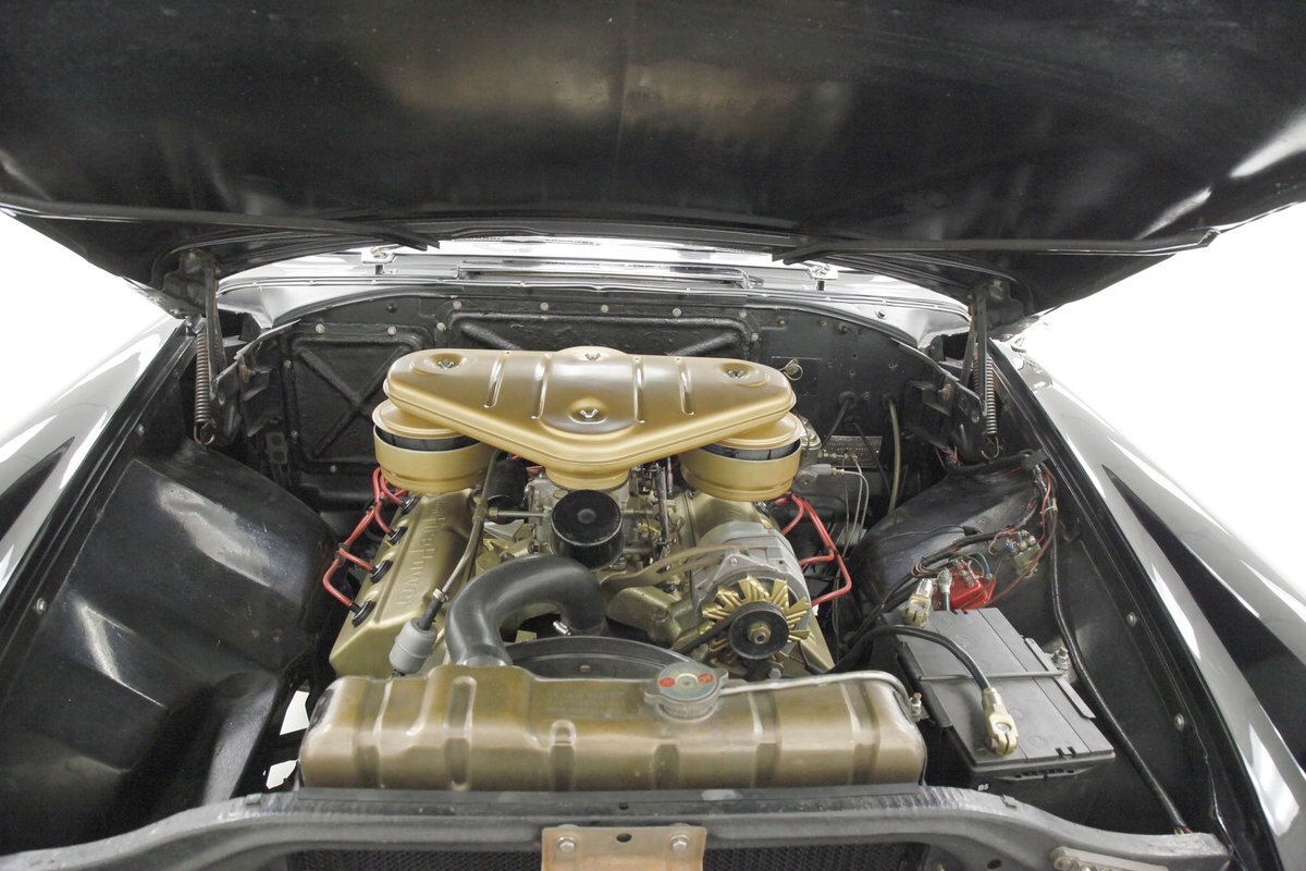 Styled by Virgil Exner and his team, Chrysler had now positioned itself at the forefront of the industry. The new look began with an all new big split egg crate grille set below lowered front fenders and hood lines and boasting heavy chrome. The black paint on this car looks positively radiant under the lights in our photo studio. Make no mistake, this is a big car, but its proportions are cleverly disguised by brilliant design. Starting at the front grille which uses wide openings and heavy horizontal and vertical bars to create the cubby hole grille. It's a dual design and forms a graceful V with a large cloisonne badge in its center on the black bodywork. A single visored bezeled headlight is flanking the grille and these are mounted on the rounded front quarters. A big bumper below emulates the curve to the grille and turn signals and running lights are rounded and placed just below the main head lighting. On the sides is the beginnings of a long chromed trim spear which runs the gamut of the side to the rear bumper. The door panels and slab sides are straight and rust free and other trimmings interrupting the black steel are sparse for the time period, but very effective. A bubble rear glass is seen and this meets up with a large trunk lid and deck. On the back a large bumper is on the bottom and trim spears on either rear quarter panel top create a housing for the tall and thin chrome encased "twin tower" tail lights. Dual exhaust tips peek out the back and black painted 15-inch steel wheels are on all 4 corners and are wrapped by like new 235/75R15 rubber and the factory beauty covers are included with your purchase.
