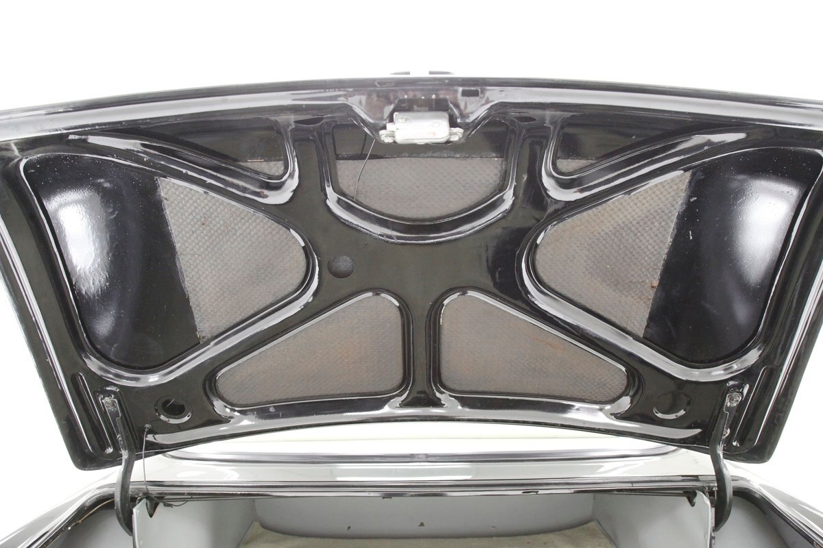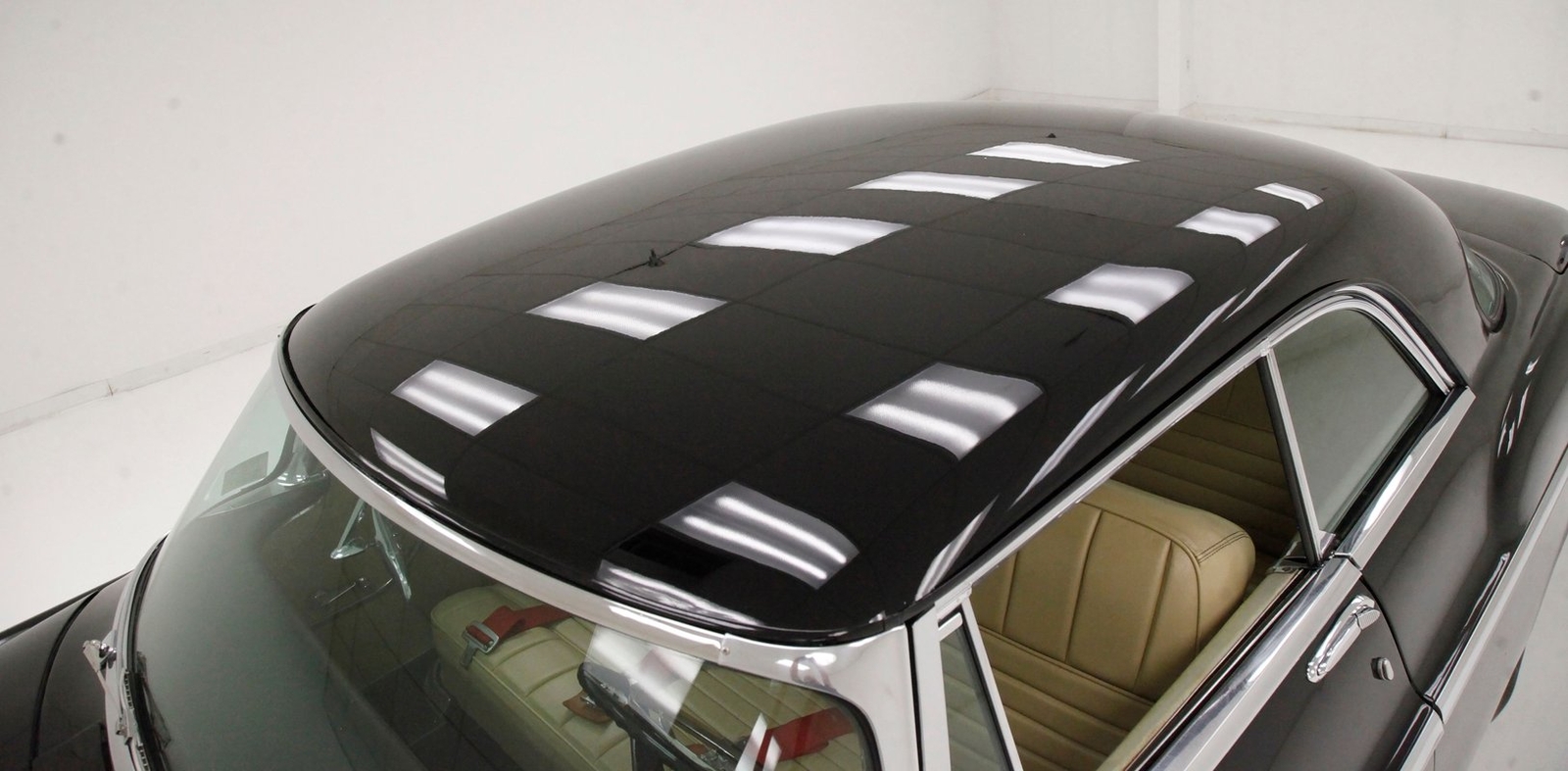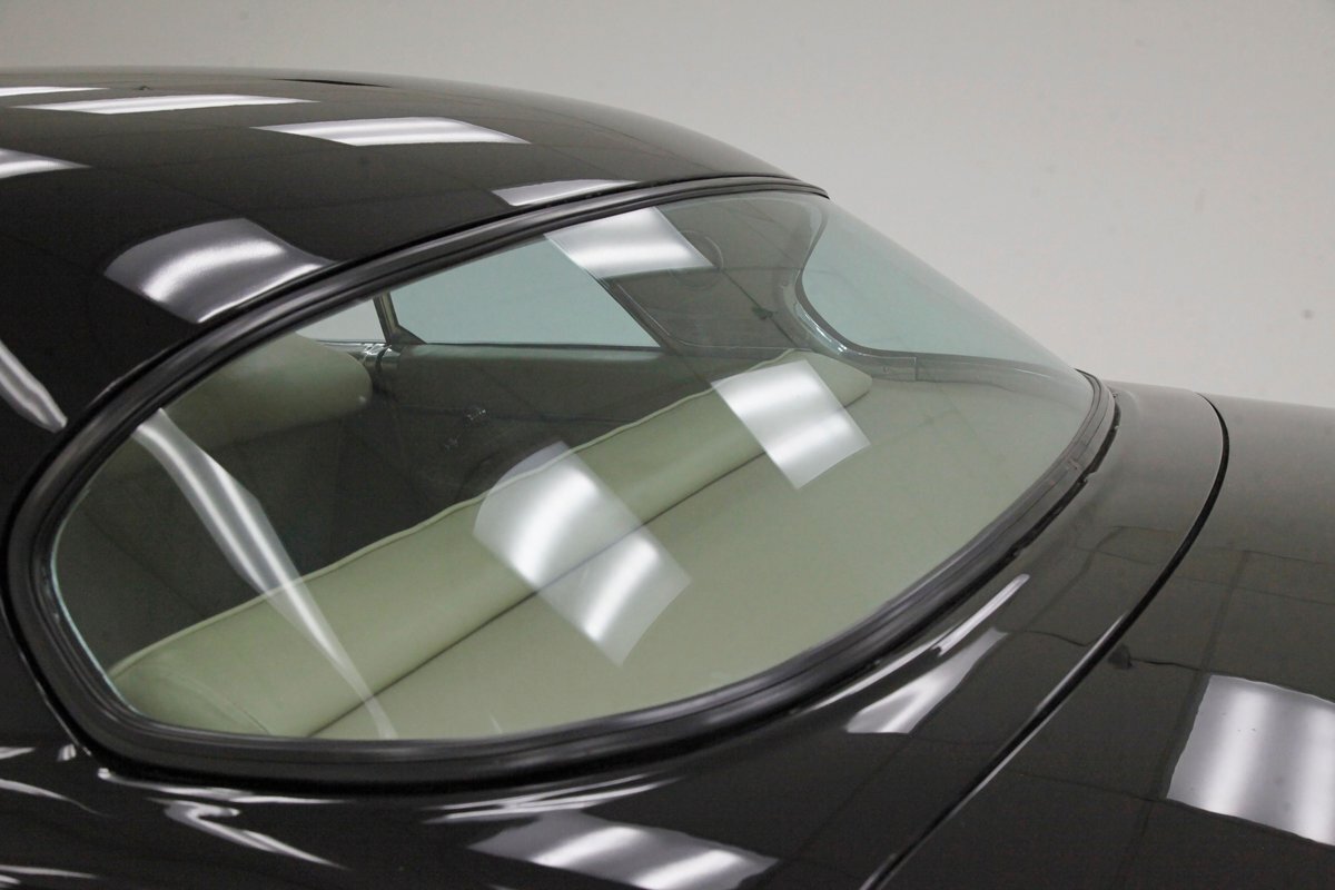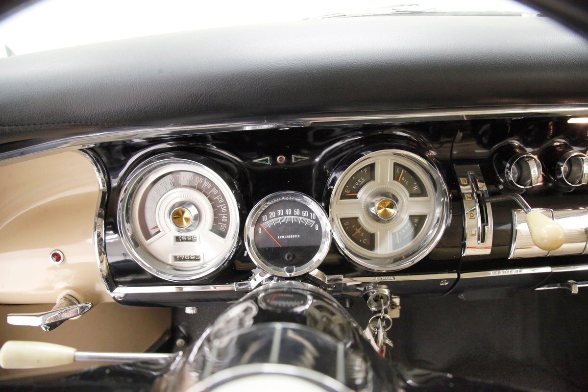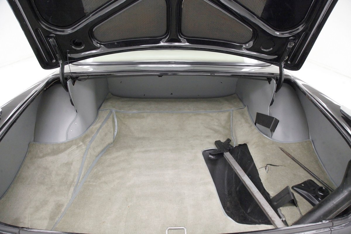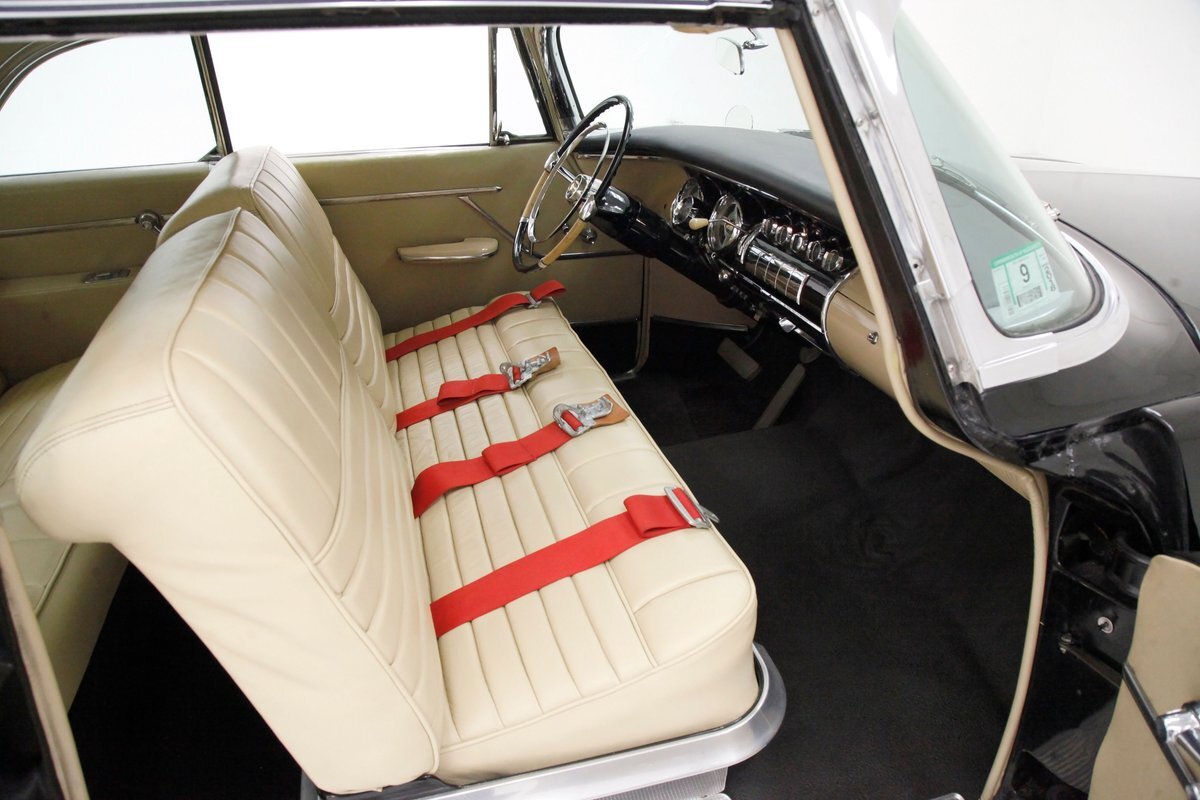 Styled by Virgil Exner and his team, Chrysler had now positioned itself at the forefront of the industry. The new look began with an all new big split egg crate grille set below lowered front fenders and hood lines and boasting heavy chrome. The black paint on this car looks positively radiant under the lights in our photo studio. Make no mistake, this is a big car, but its proportions are cleverly disguised by brilliant design. Starting at the front grille which uses wide openings and heavy horizontal and vertical bars to create the cubby hole grille. It's a dual design and forms a graceful V with a large cloisonne badge in its center on the black bodywork. A single visored bezeled headlight is flanking the grille and these are mounted on the rounded front quarters. A big bumper below emulates the curve to the grille and turn signals and running lights are rounded and placed just below the main head lighting. On the sides is the beginnings of a long chromed trim spear which runs the gamut of the side to the rear bumper. The door panels and slab sides are straight and rust free and other trimmings interrupting the black steel are sparse for the time period, but very effective. A bubble rear glass is seen and this meets up with a large trunk lid and deck. On the back a large bumper is on the bottom and trim spears on either rear quarter panel top create a housing for the tall and thin chrome encased "twin tower" tail lights. Dual exhaust tips peek out the back and black painted 15-inch steel wheels are on all 4 corners and are wrapped by like new 235/75R15 rubber and the factory beauty covers are included with your purchase.