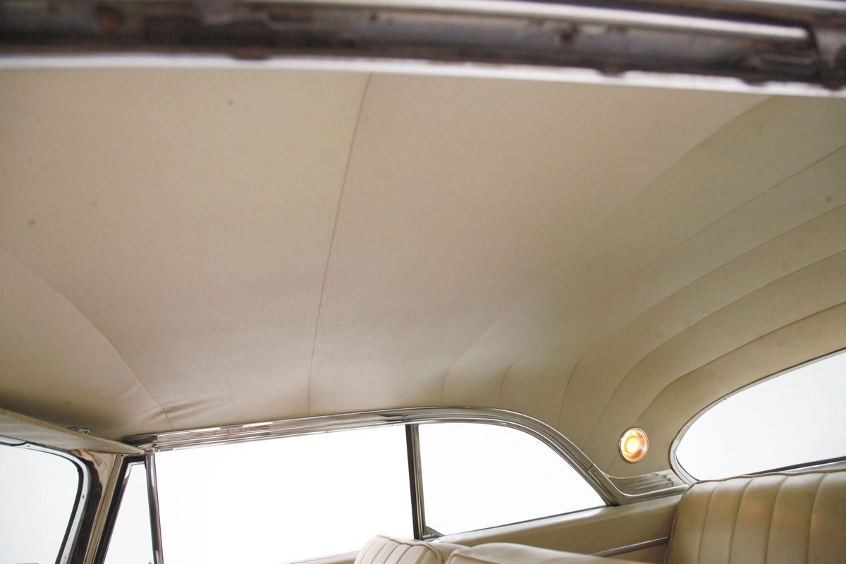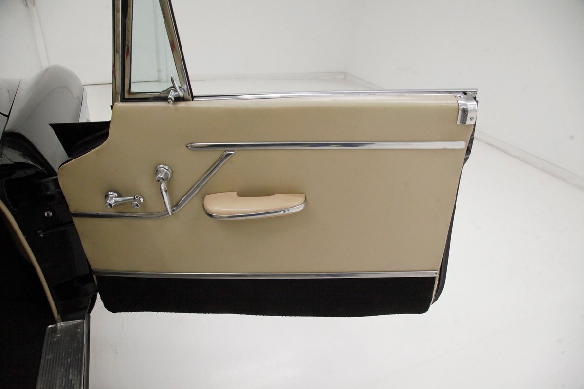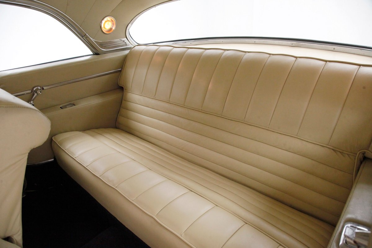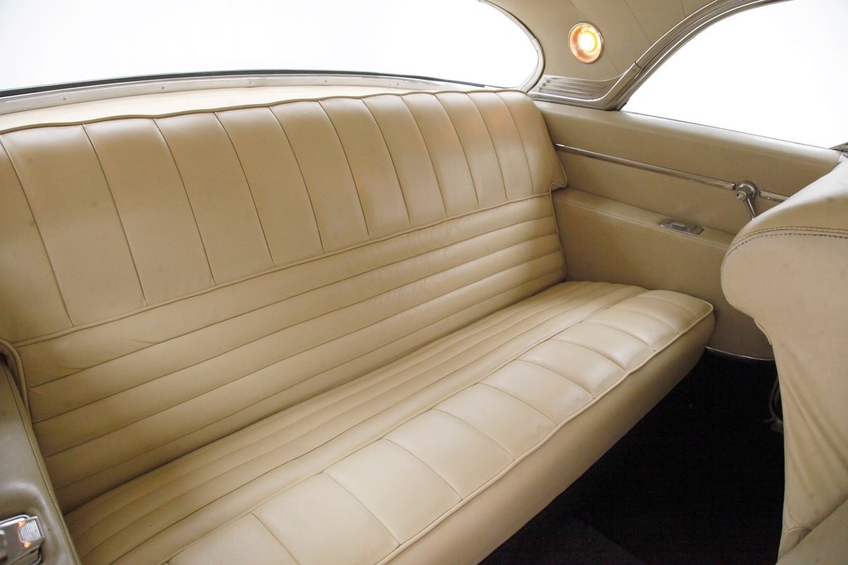 A swing of the well-balanced doors and we get a taste of the interior on the door panels. Here we see smooth beige leather covering the doors. This is broken up by more curved trim spears on a much smaller scale than on the exterior. The window cranks and the door actuator is nice and shiny. Inside, the luxurious interior is 2 long benches and the one in front has tuck and rolled, piped and square paneled leather and presents like new. The rear bench presents in the same pattern and is very clean. Upfront the curved overhang padded topped dash is full metal jacket and trades off between tan and black painted steel. Gauges, knobs, levers and switches abound, and we see the transmission shift lever to the driver's right. In the center dash a lineup of round knobs for all the controls including the radio and heater delete panels. In front of the passenger is a rounded door and speaker vertical ribbed tan metal panel with a round dial insert just above the glove box door. Above all this is a beautifully preserved tan headliner, and even on the B pillars inside are more ribbed trimmings. Can you say lap of luxury and textures?
