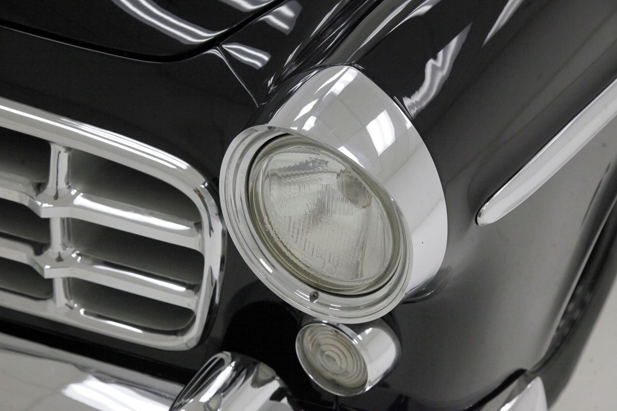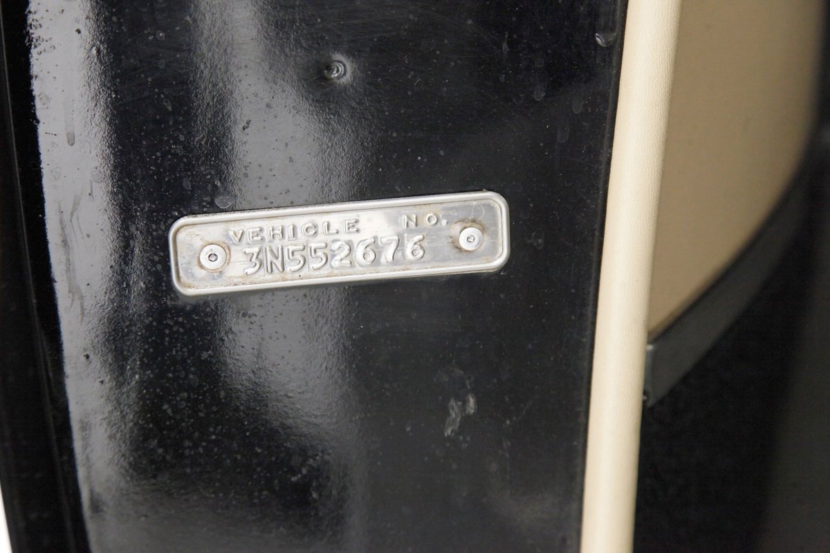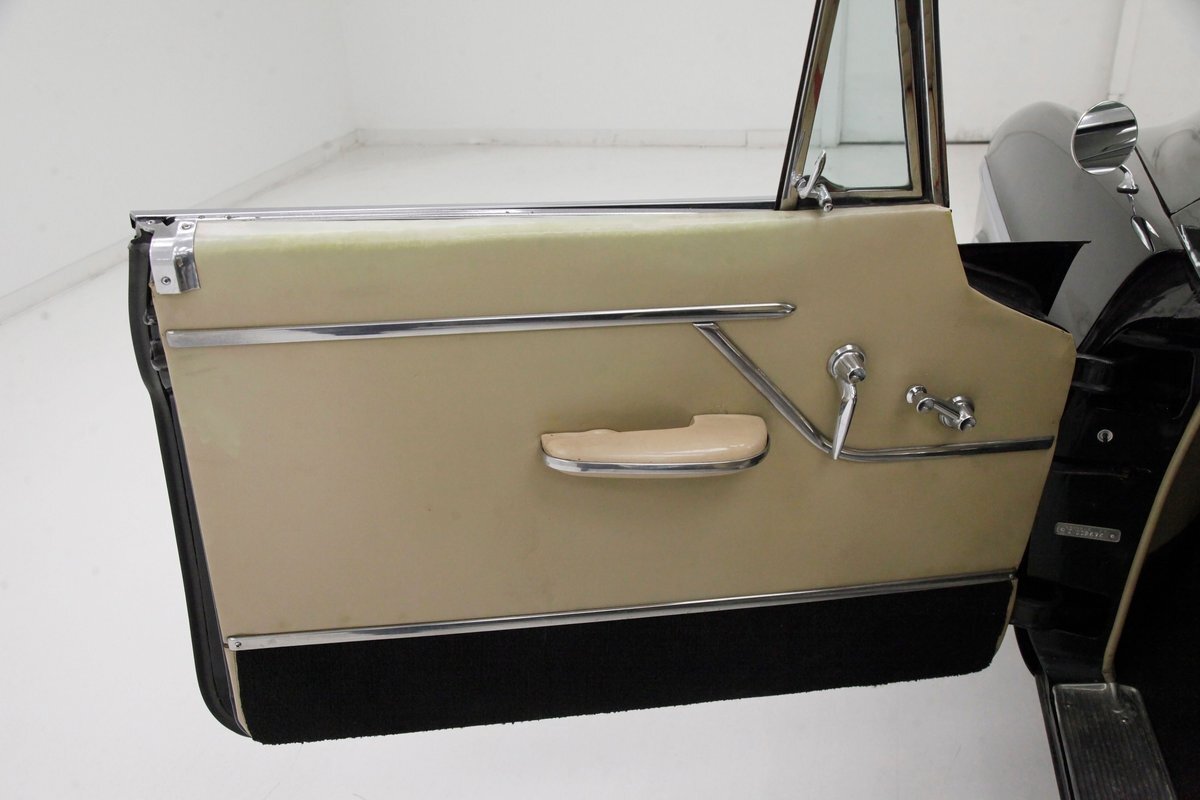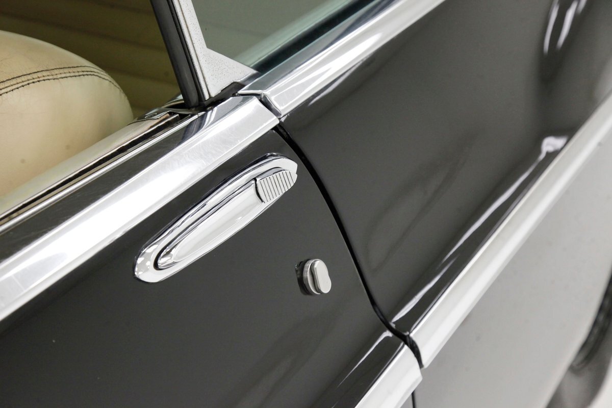 A swing of the well-balanced doors and we get a taste of the interior on the door panels. Here we see smooth beige leather covering the doors. This is broken up by more curved trim spears on a much smaller scale than on the exterior. The window cranks and the door actuator is nice and shiny. Inside, the luxurious interior is 2 long benches and the one in front has tuck and rolled, piped and square paneled leather and presents like new. The rear bench presents in the same pattern and is very clean. Upfront the curved overhang padded topped dash is full metal jacket and trades off between tan and black painted steel. Gauges, knobs, levers and switches abound, and we see the transmission shift lever to the driver's right. In the center dash a lineup of round knobs for all the controls including the radio and heater delete panels. In front of the passenger is a rounded door and speaker vertical ribbed tan metal panel with a round dial insert just above the glove box door. Above all this is a beautifully preserved tan headliner, and even on the B pillars inside are more ribbed trimmings. Can you say lap of luxury and textures?