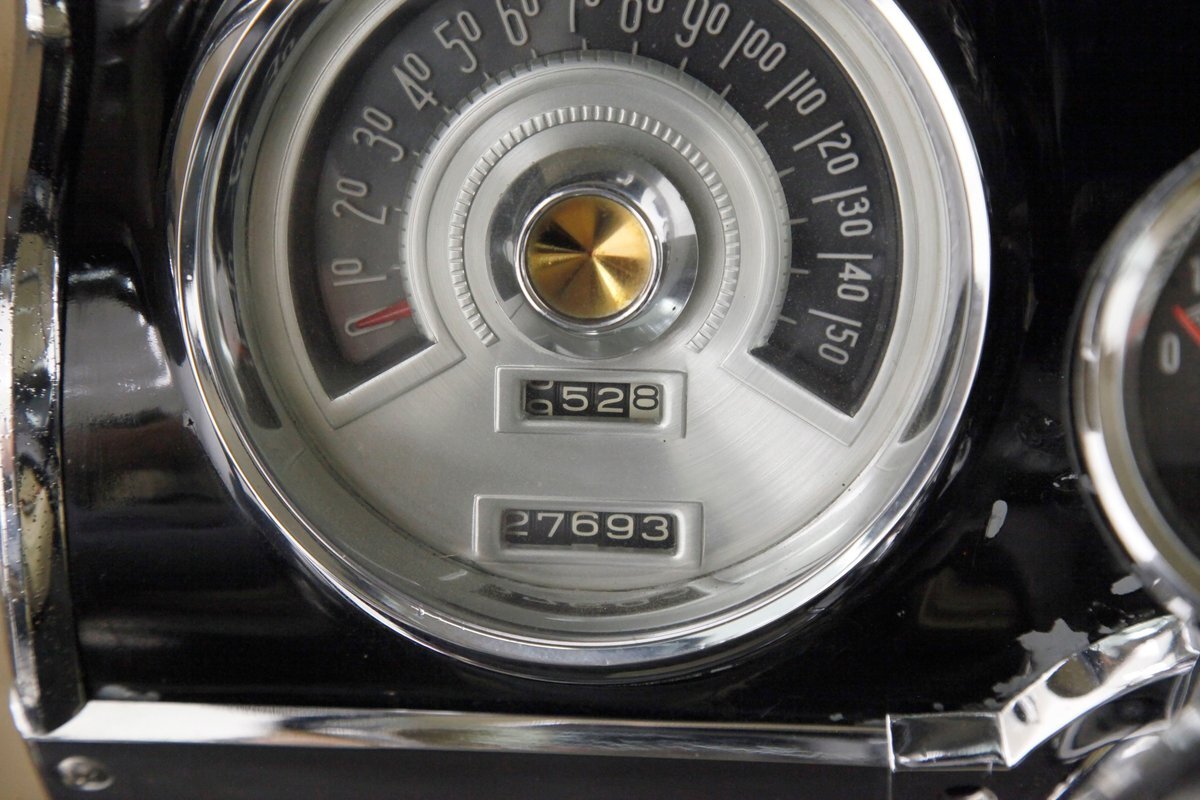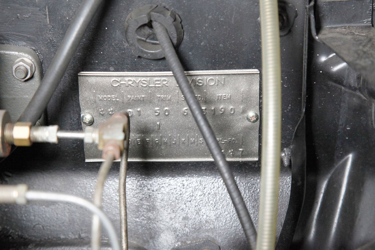 Under the big hood is a very detailed engine bay. Shoehorned in is a rebuilt 500 miles ago 331ci V8 Hemi engine that is rated at 300hp. On top are Carter dual 4-barrel carbs, and actuating the valves is a factory hi-lift solid flat tappet camshaft. Behind this Hemi is a Powerflite 2-speed automatic which has proven to be pretty much bulletproof. The optional 3.54 rear axle is on the back. Noted are gold painted accents including the sculpted air cleaner cover covering the dual quads, and gold valve covers. All else is dirt and grease free and clean including the upgraded 12 volt alternator and high torque starter.