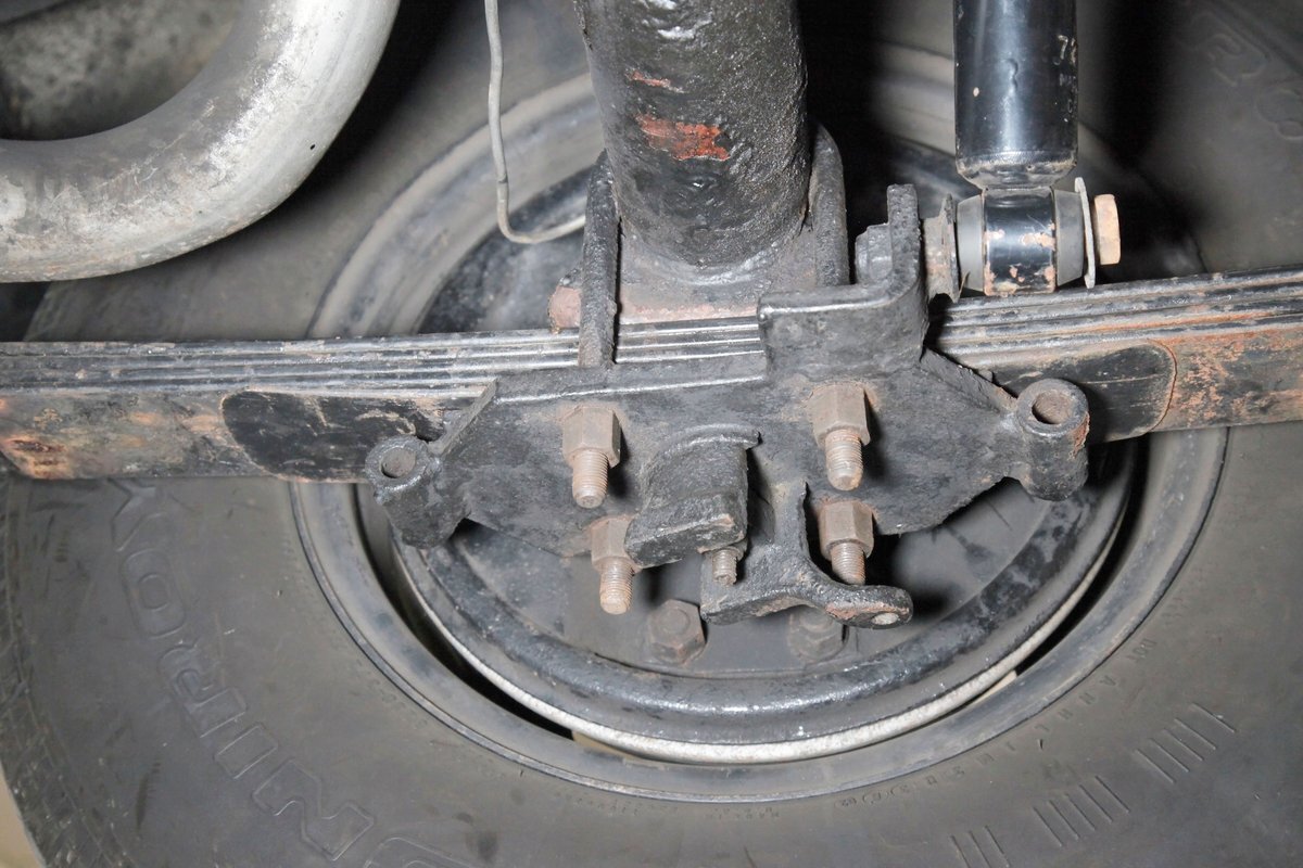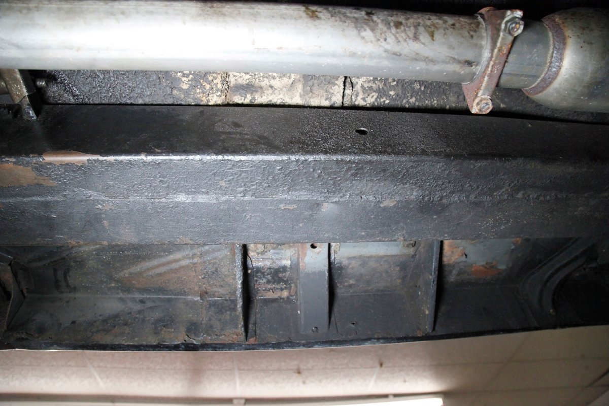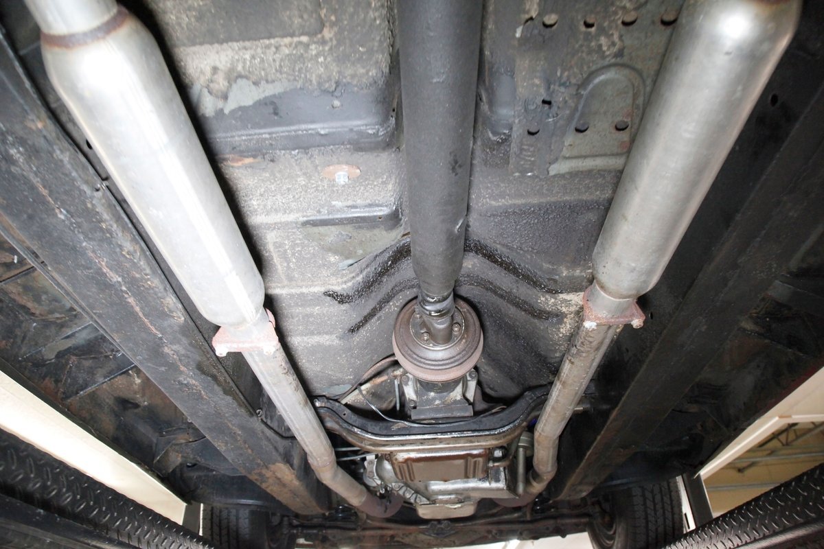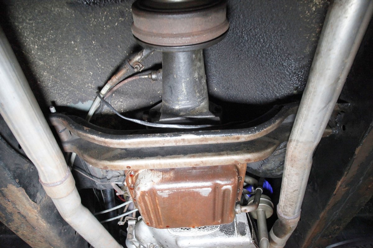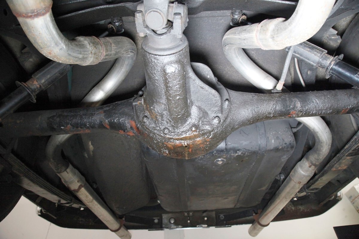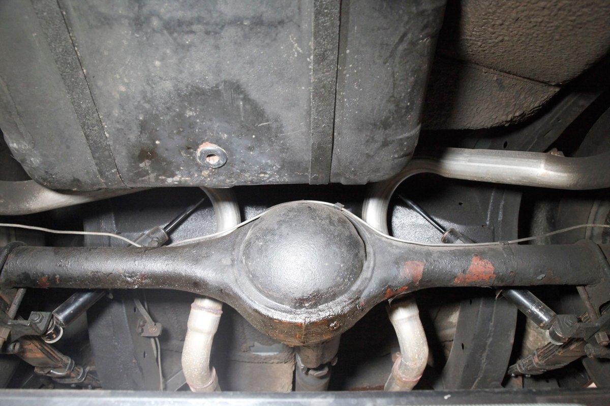Here we find a heavy coating of rustproofing and can see some chips exposing the factory steel underneath. A strong black painted frame provides the backbone for the body and bolt ons and we note the body hangers remain intact as do the inner rockers. Custom built headers are on along with like new glasspack muffler equipped dual exhaust and independent coil spring suspension is in front and leaf springs for the back provide the ride. Drum brakes are on all 4 corners with the added benefit of a dual reservoir master cylinder.