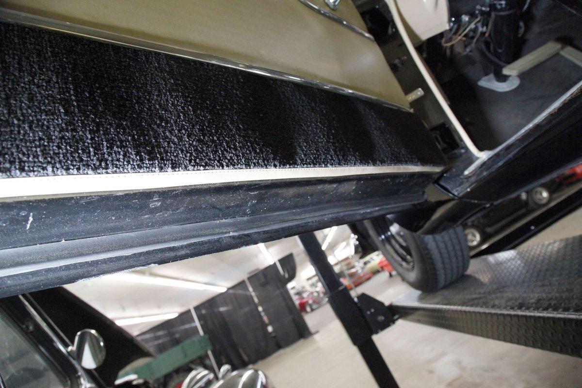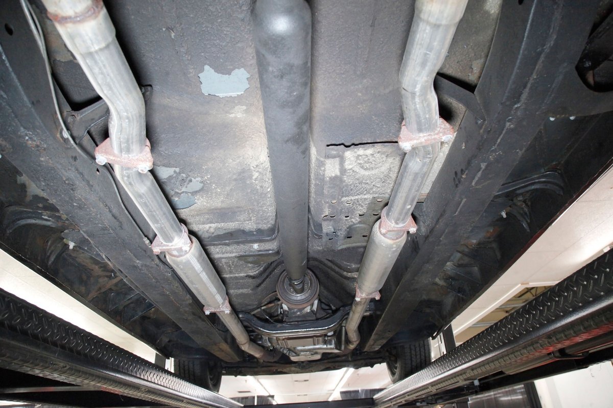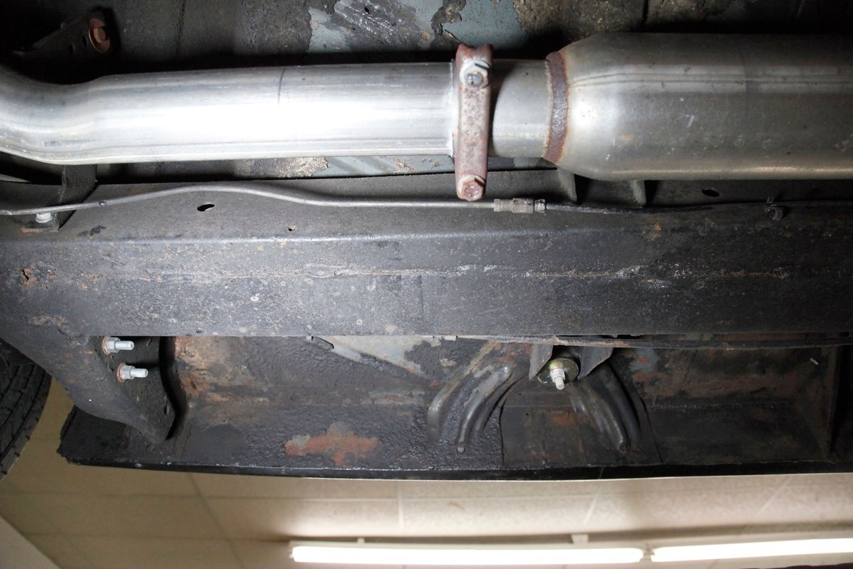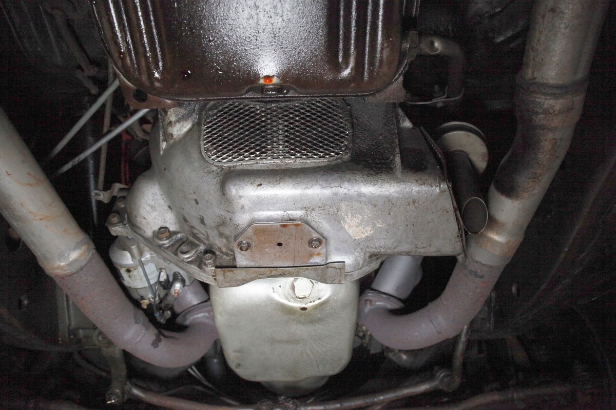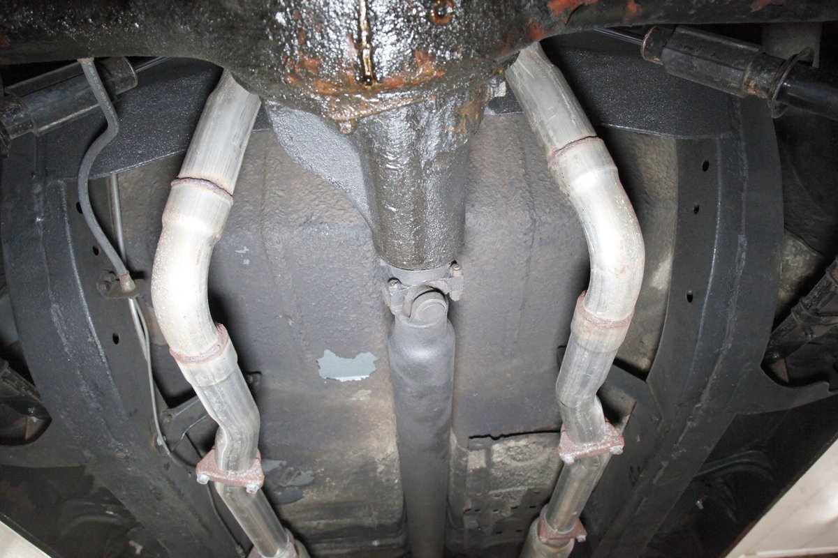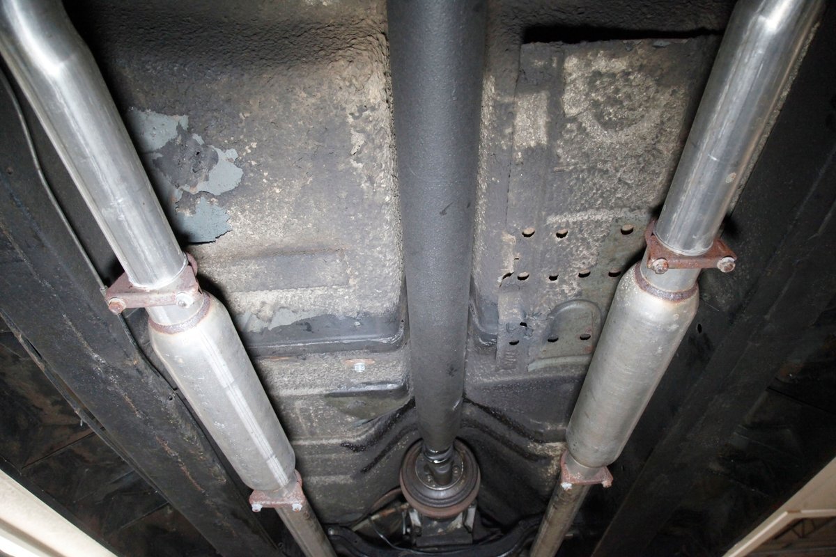 Here we find a heavy coating of rustproofing and can see some chips exposing the factory steel underneath. A strong black painted frame provides the backbone for the body and bolt ons and we note the body hangers remain intact as do the inner rockers. Custom built headers are on along with like new glasspack muffler equipped dual exhaust and independent coil spring suspension is in front and leaf springs for the back provide the ride. Drum brakes are on all 4 corners with the added benefit of a dual reservoir master cylinder.