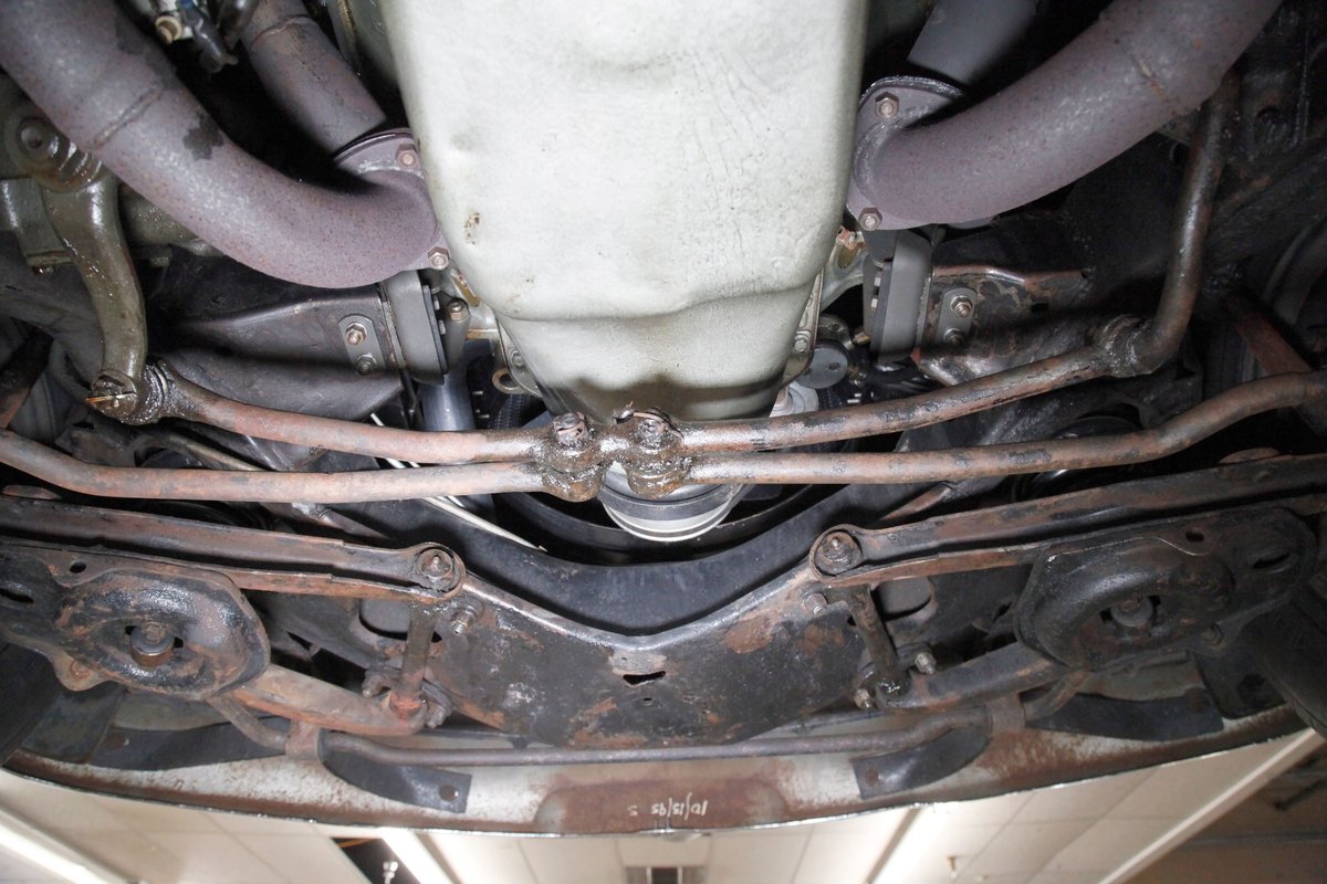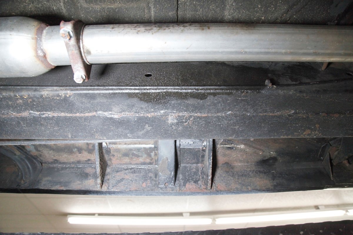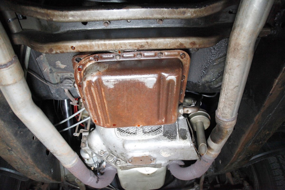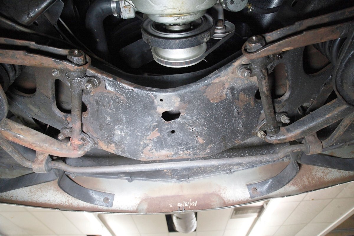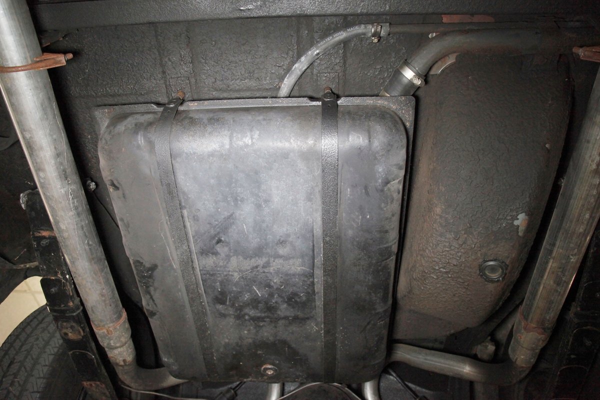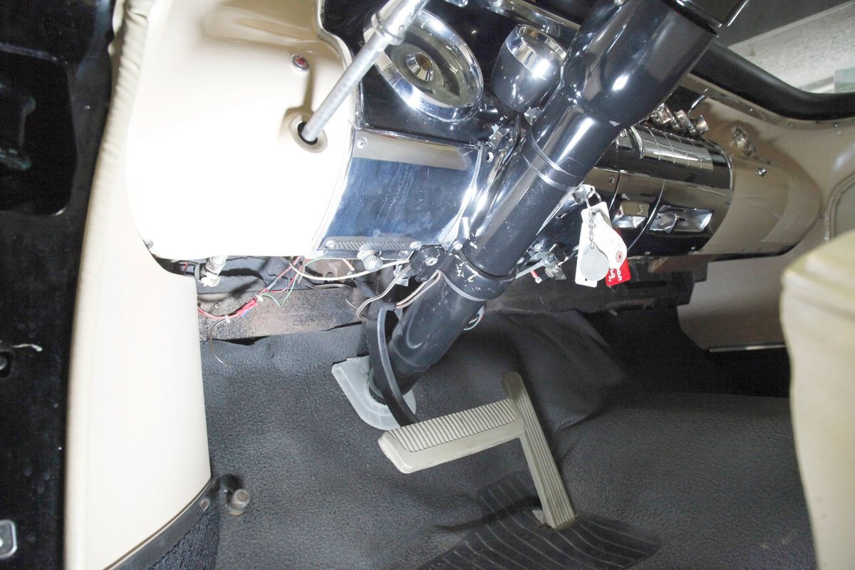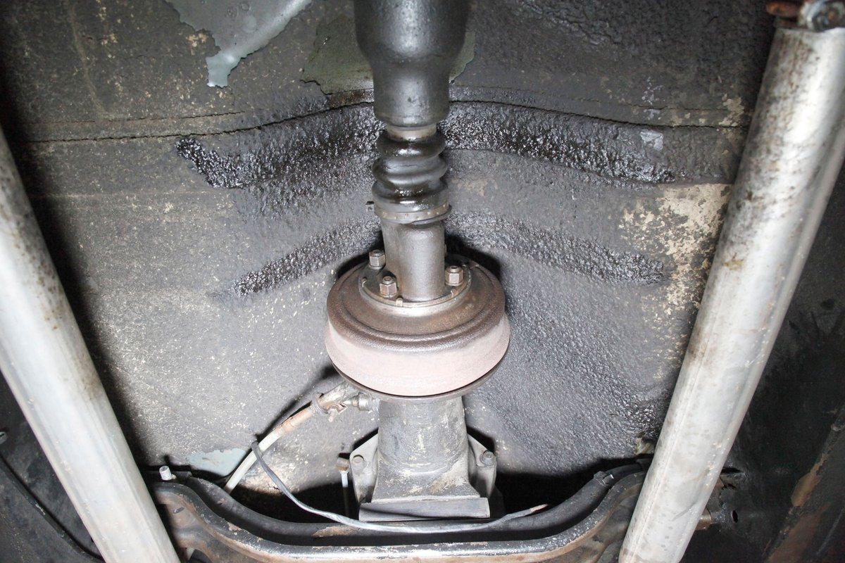 Here we find a heavy coating of rustproofing and can see some chips exposing the factory steel underneath. A strong black painted frame provides the backbone for the body and bolt ons and we note the body hangers remain intact as do the inner rockers. Custom built headers are on along with like new glasspack muffler equipped dual exhaust and independent coil spring suspension is in front and leaf springs for the back provide the ride. Drum brakes are on all 4 corners with the added benefit of a dual reservoir master cylinder.