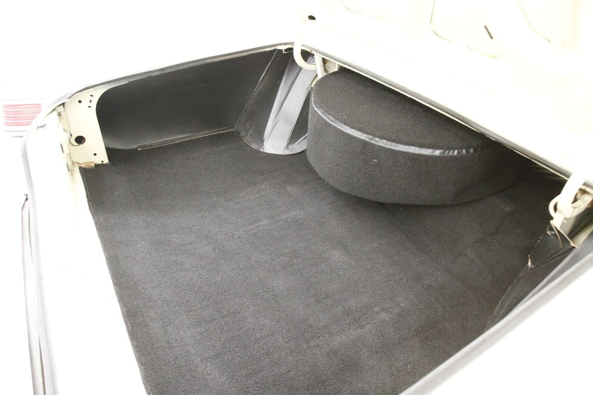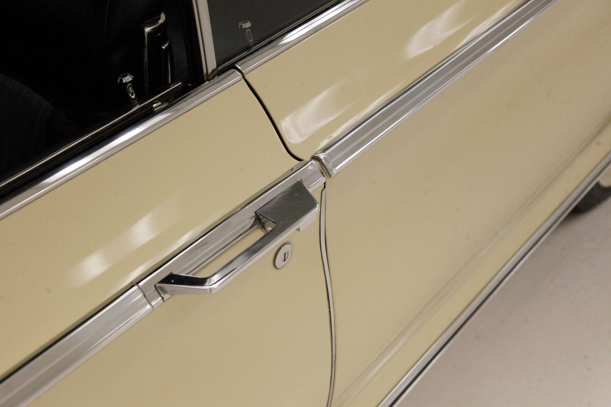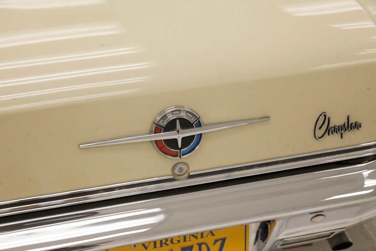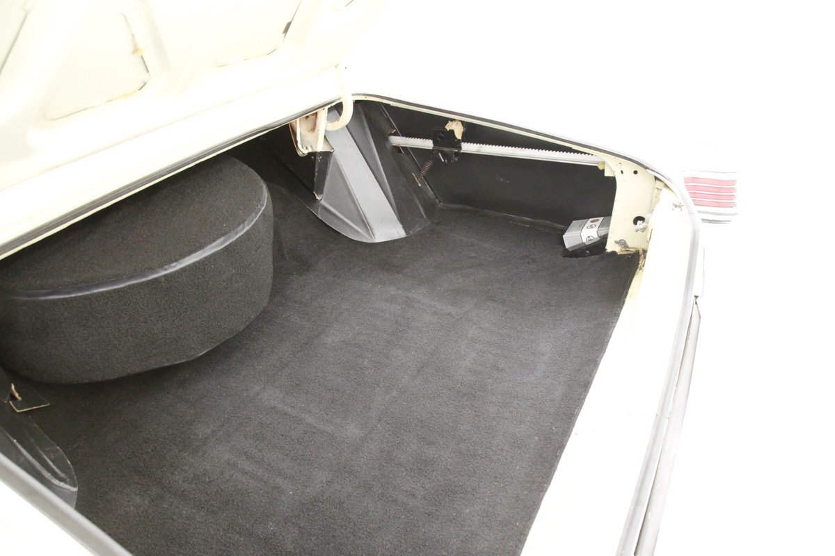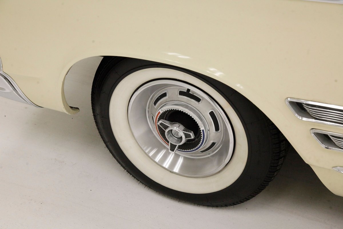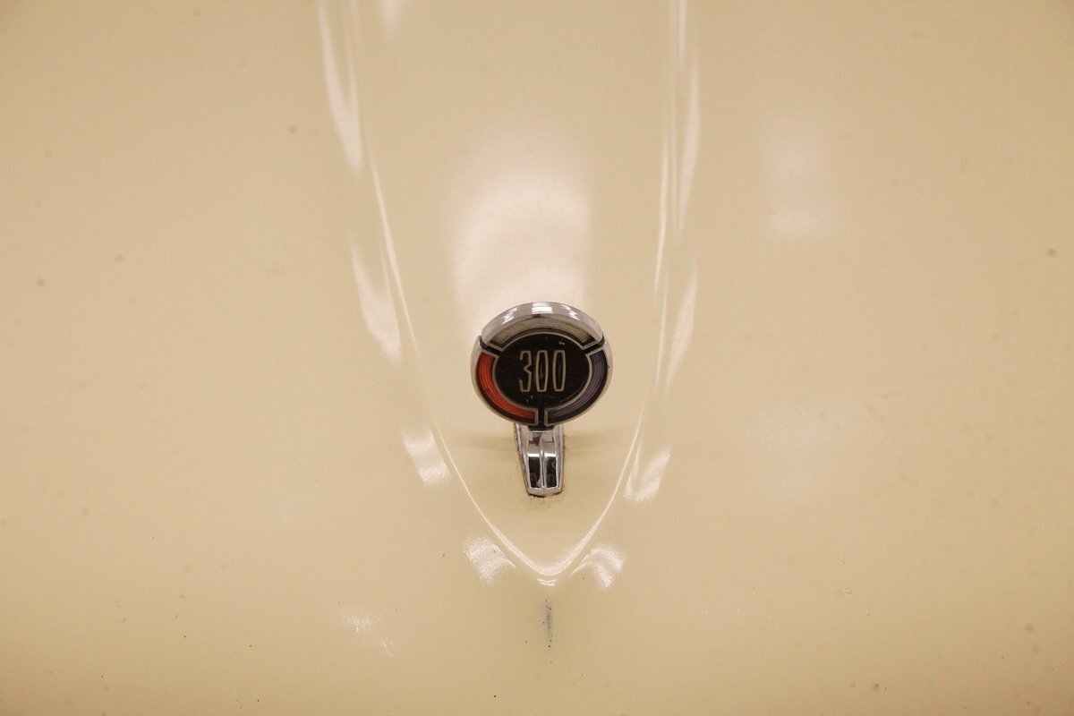 Plenty of Ivory paint covers the straight and true steel slabs that have been formed to create this stylish example of the 300. The gaps are well minded, and paint, being the consignor stated original, has not lost its luster, but does show some wear as well as touched up chip offs and dings. Chrome and badging are all original and all looking good. With its loooooong hood, and 4 door passenger compartment, (more like an apartment), and loooooong trunk, I'm getting ready to move in! Speaking of the trunk, it is sporting the consignor stated special order New Yorker trunk trim, factory jack, felted black liner and black felt covered full size spare tire. A long flat roof presents with block angled B pillars, which was the Mopar style at the time for sedans, and looks just fab as is the plentiful chrome trim around all the windows, trim spear just above the rockers, and all encompassing beltline spear. Within those wheel wells are fantastically preserved tri color and polished 14-inch Chrysler wheel covers with spinner equipped turbine centers and 300 badging wrapped in like new thin whitewall 225/75R14's. Overall, a very nice exterior presentation.