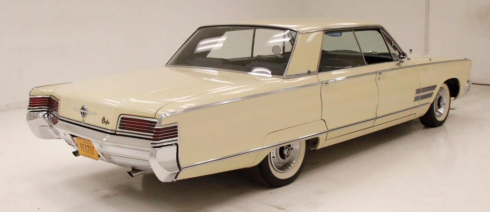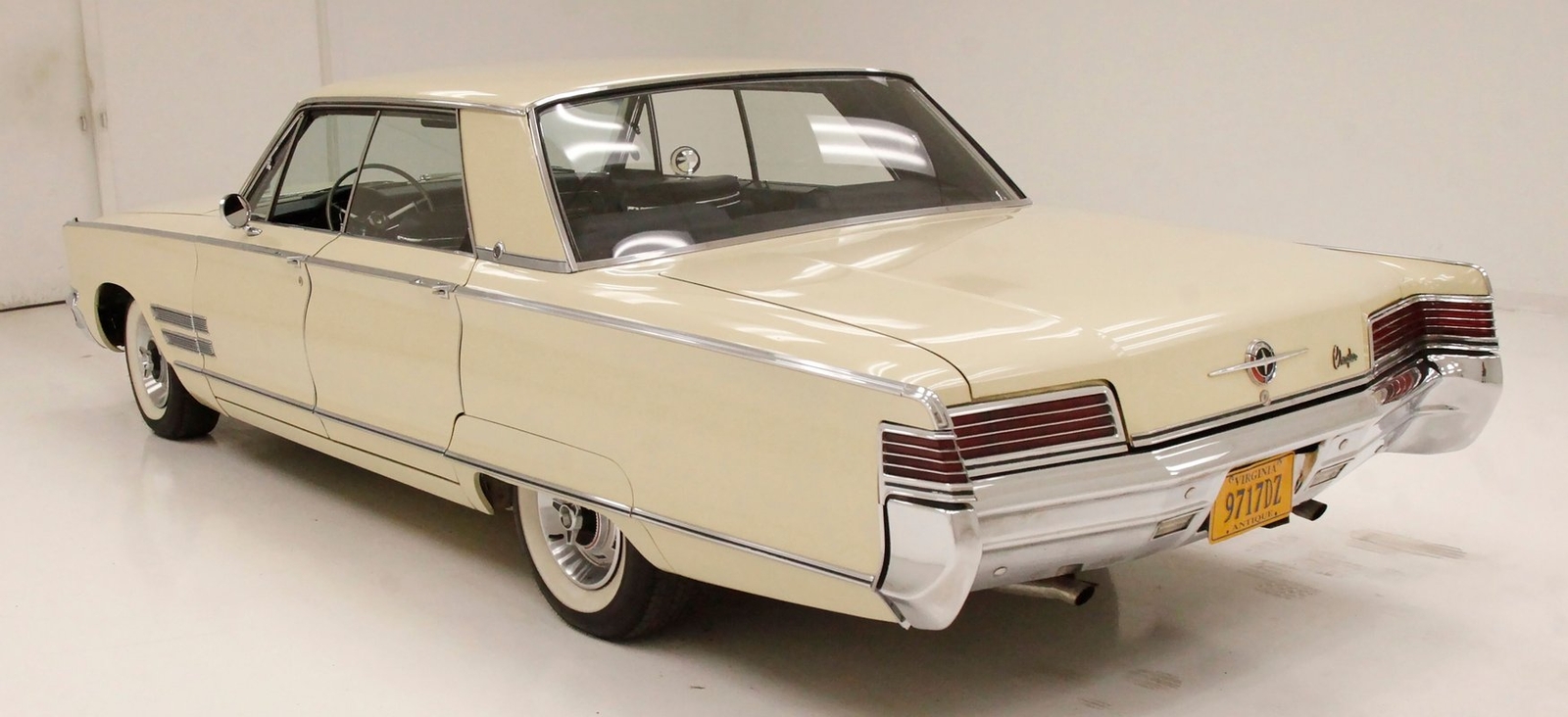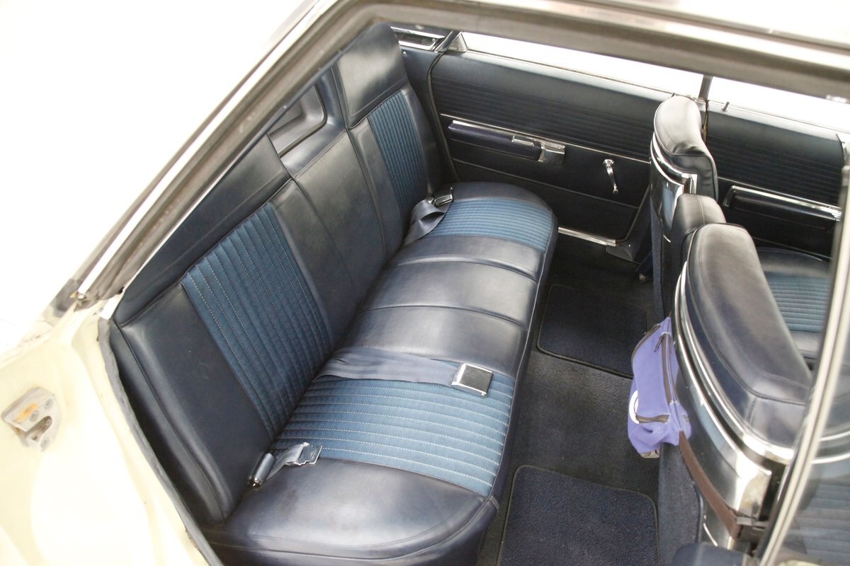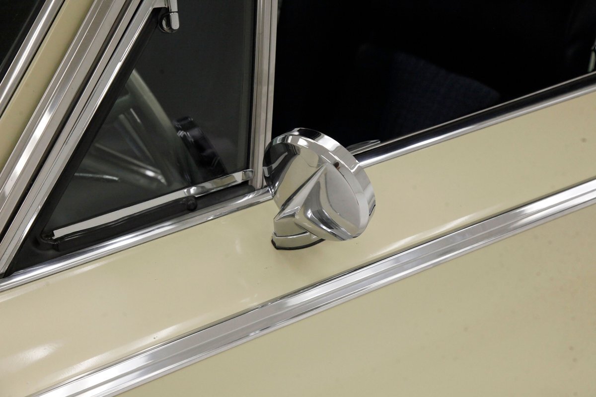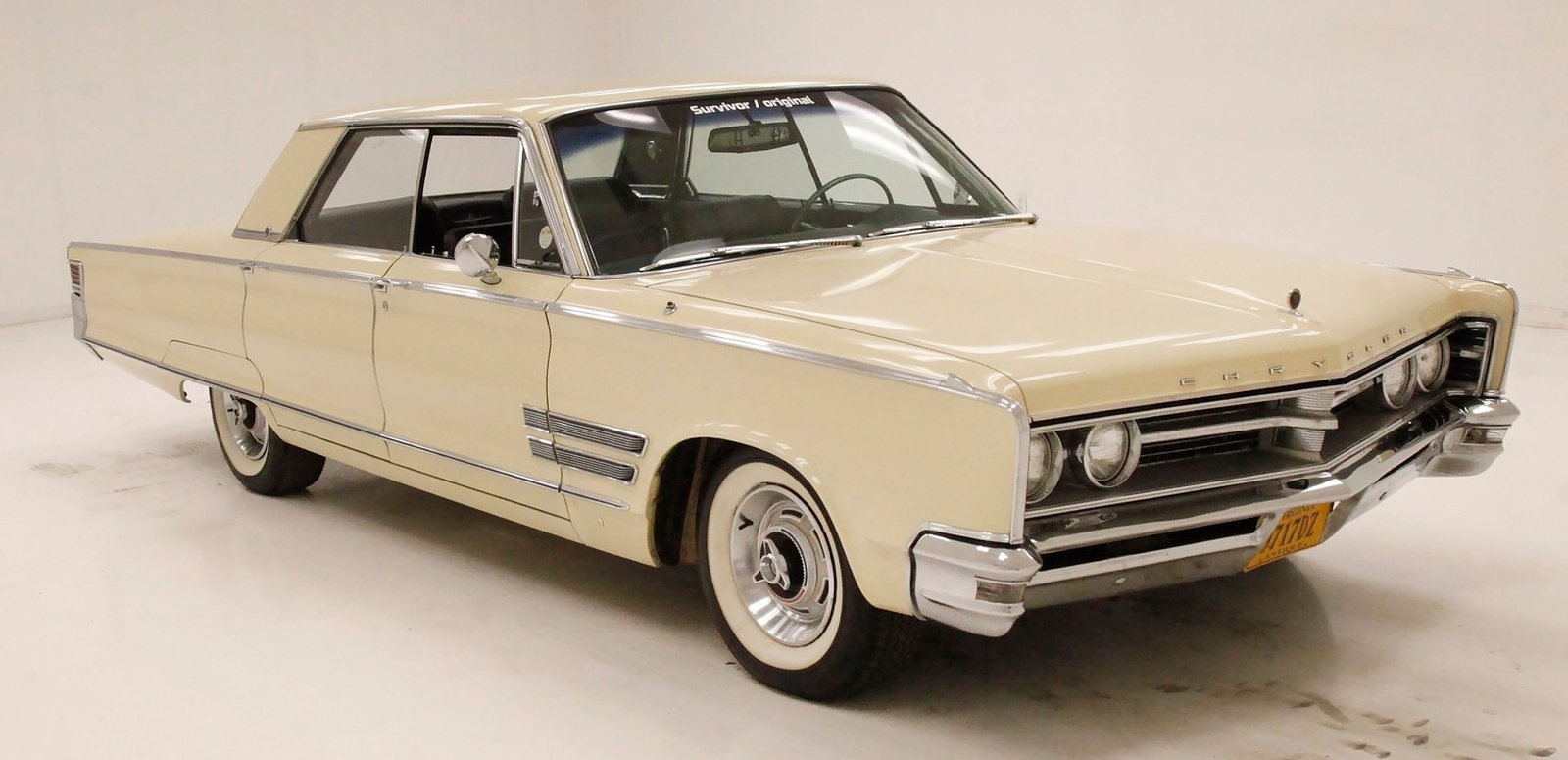 Plenty of Ivory paint covers the straight and true steel slabs that have been formed to create this stylish example of the 300. The gaps are well minded, and paint, being the consignor stated original, has not lost its luster, but does show some wear as well as touched up chip offs and dings. Chrome and badging are all original and all looking good. With its loooooong hood, and 4 door passenger compartment, (more like an apartment), and loooooong trunk, I'm getting ready to move in! Speaking of the trunk, it is sporting the consignor stated special order New Yorker trunk trim, factory jack, felted black liner and black felt covered full size spare tire. A long flat roof presents with block angled B pillars, which was the Mopar style at the time for sedans, and looks just fab as is the plentiful chrome trim around all the windows, trim spear just above the rockers, and all encompassing beltline spear. Within those wheel wells are fantastically preserved tri color and polished 14-inch Chrysler wheel covers with spinner equipped turbine centers and 300 badging wrapped in like new thin whitewall 225/75R14's. Overall, a very nice exterior presentation.